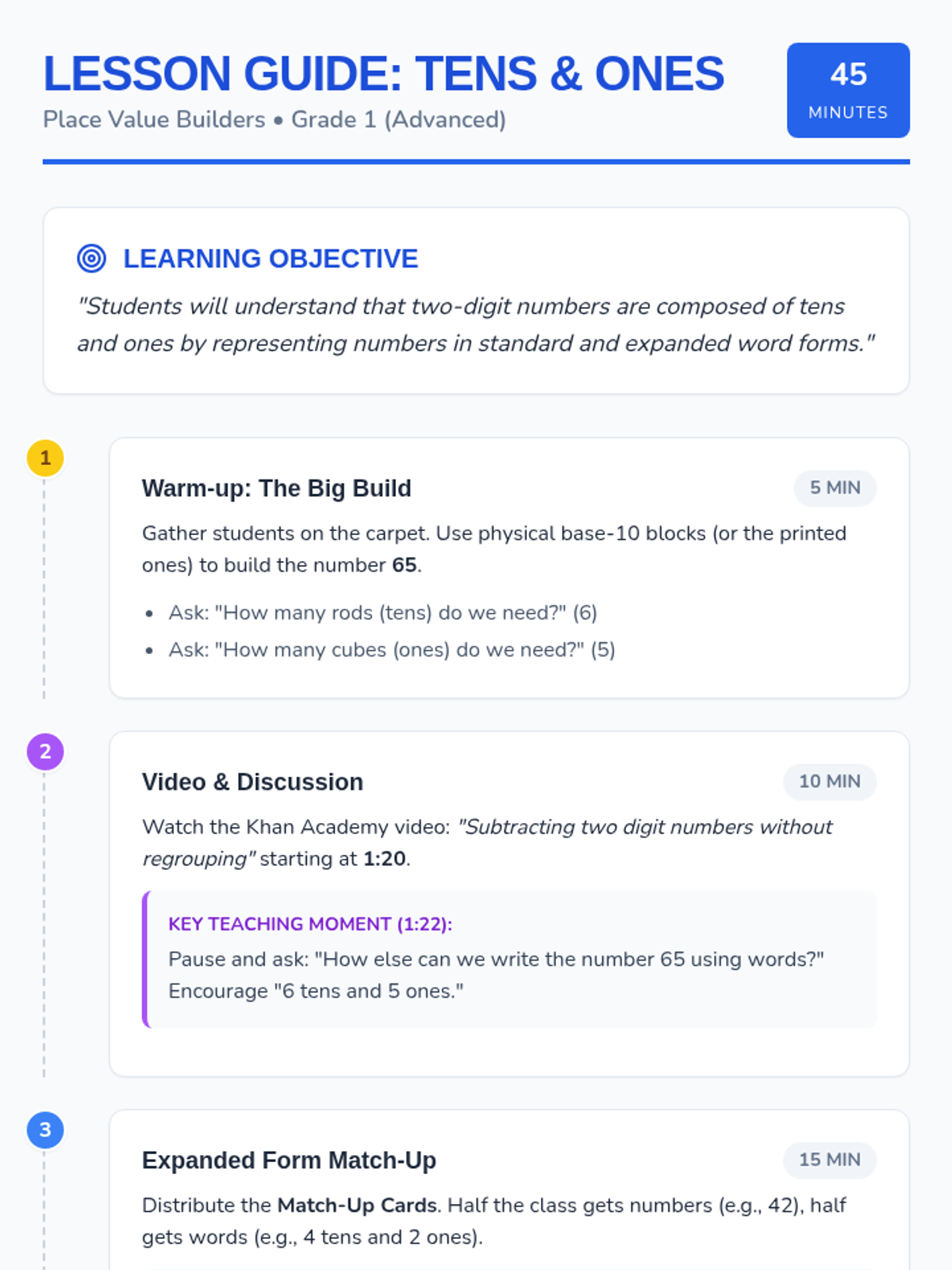 An advanced 1st-grade lesson where students explore two-digit numbers through base-10 blocks and expanded word forms, featuring a Khan Academy video and a hands-on matching activity.