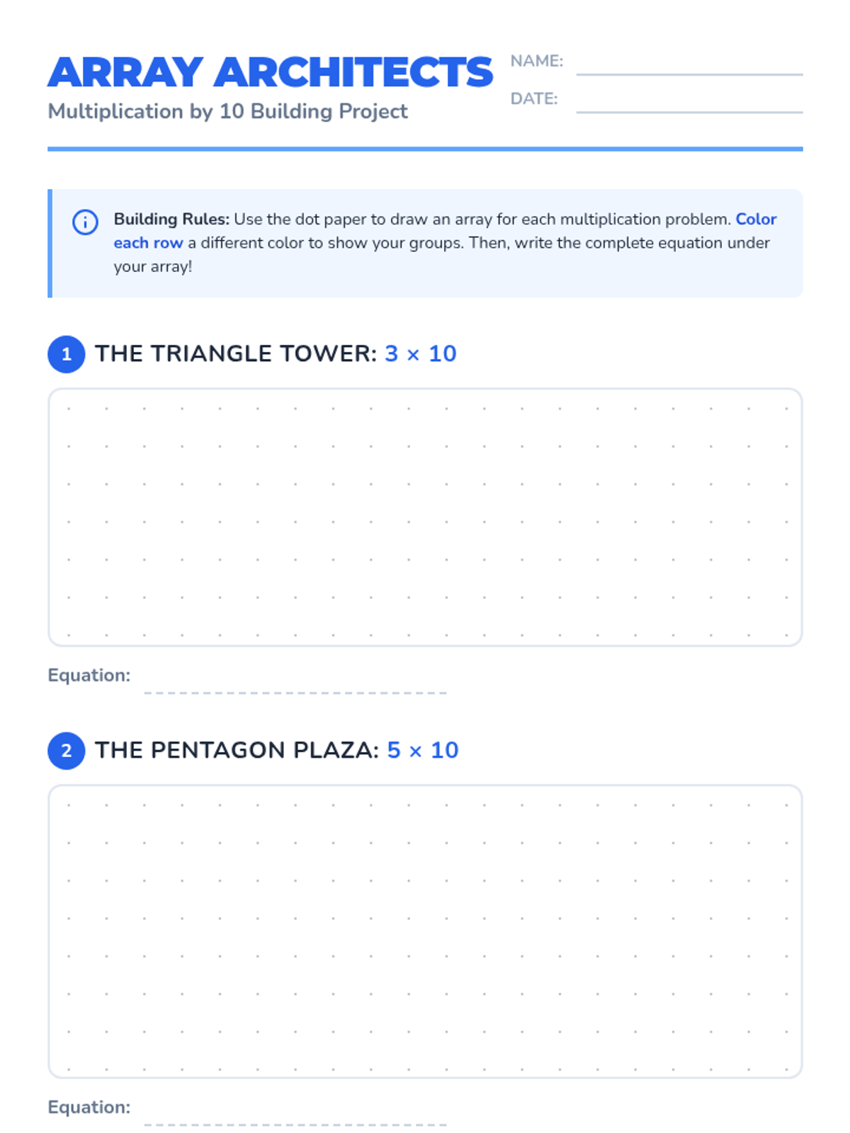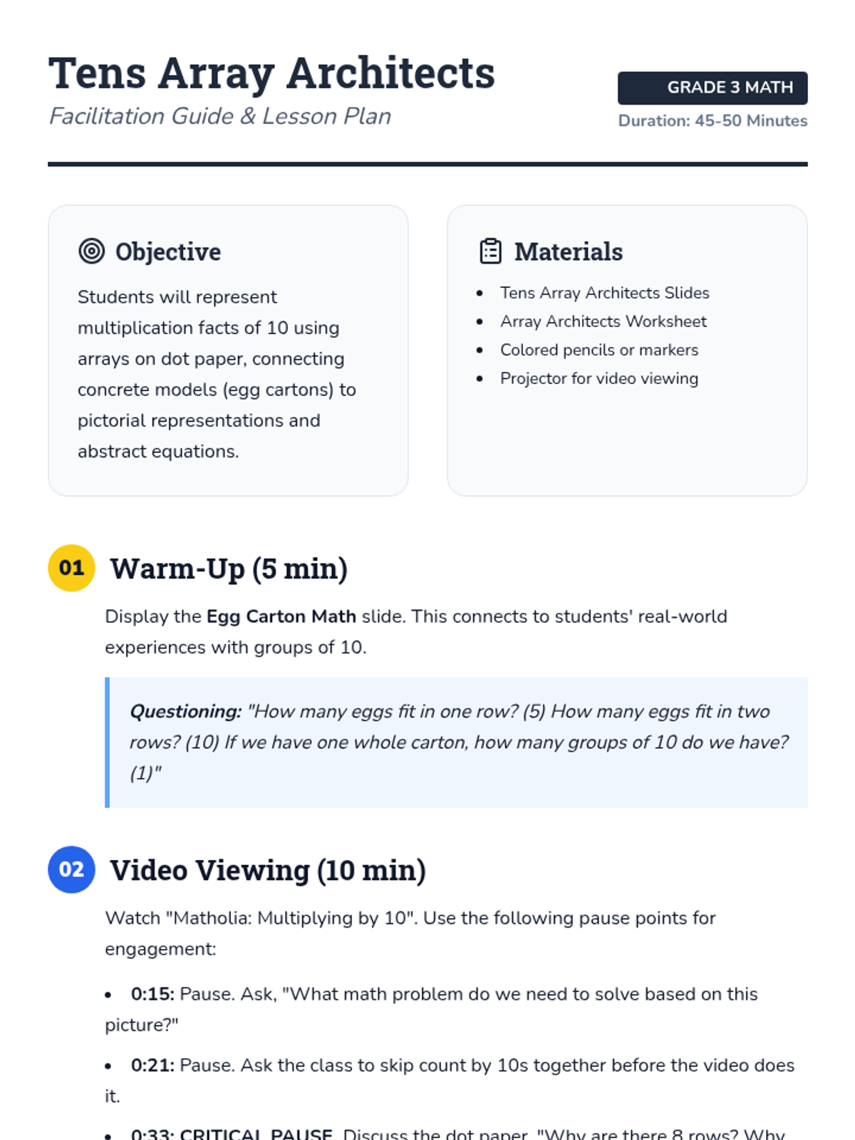 A 3rd-grade math lesson focused on representing multiplication by 10 through arrays and dot paper models, moving from concrete egg cartons to abstract equations.