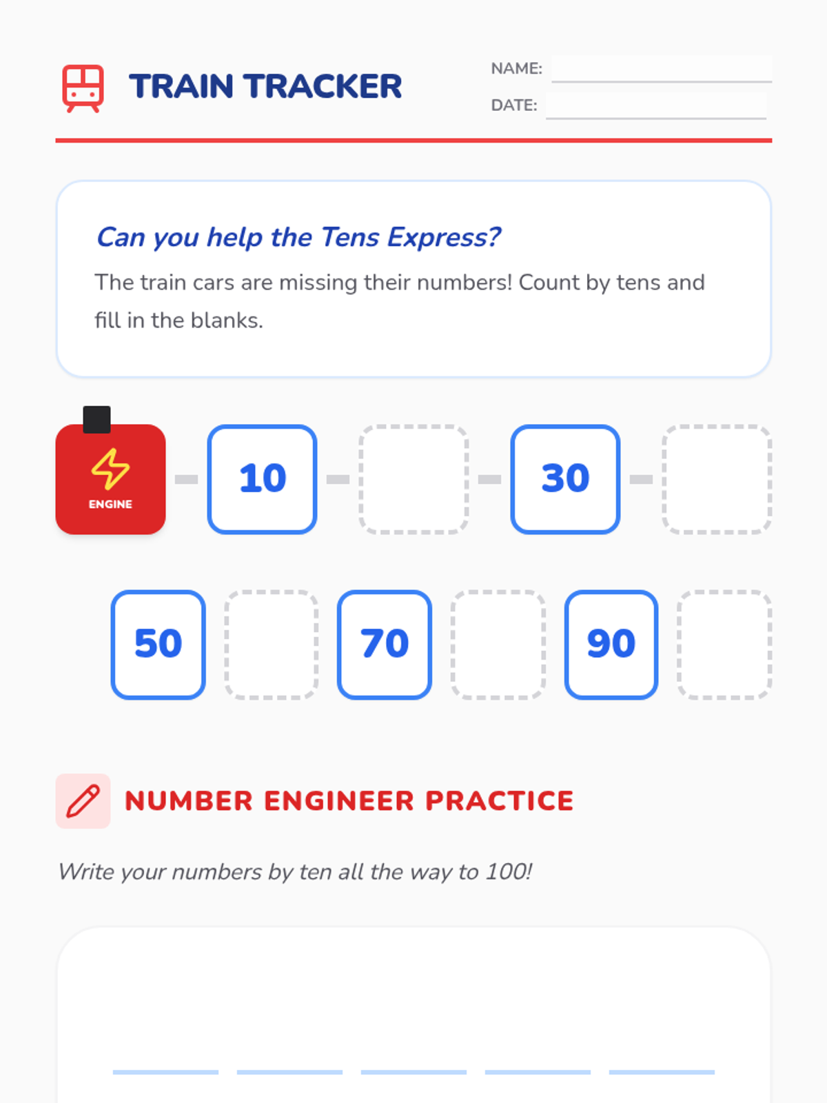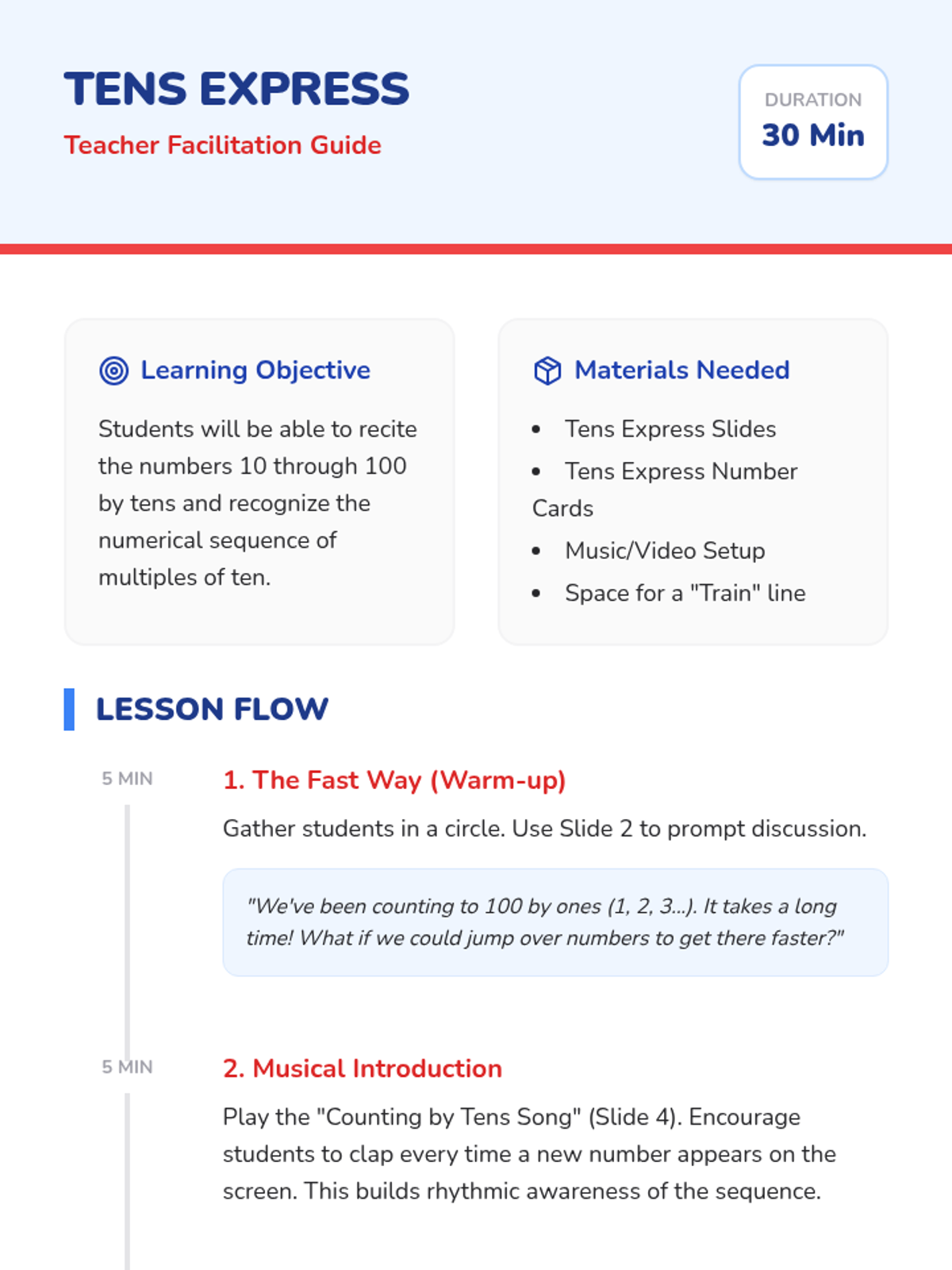 A high-energy Kindergarten lesson focused on skip counting by tens through music, movement, and a collaborative 'number train' activity. Students will learn to recognize and recite multiples of ten up to 100.