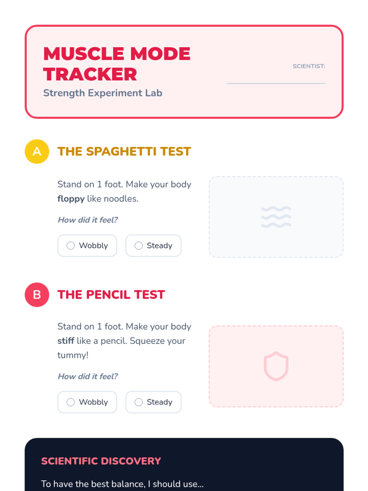 Students investigate the role of muscle tension in staying still, comparing 'spaghetti' (relaxed) and 'pencil' (tense) body states.