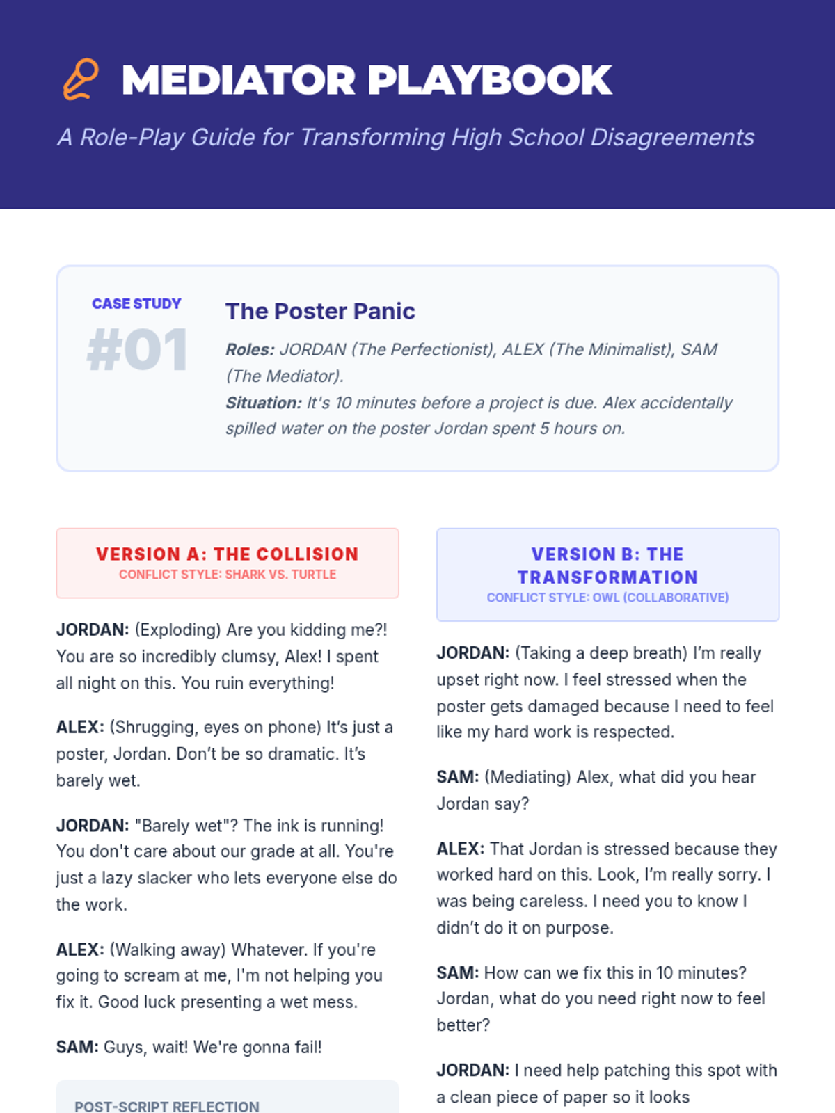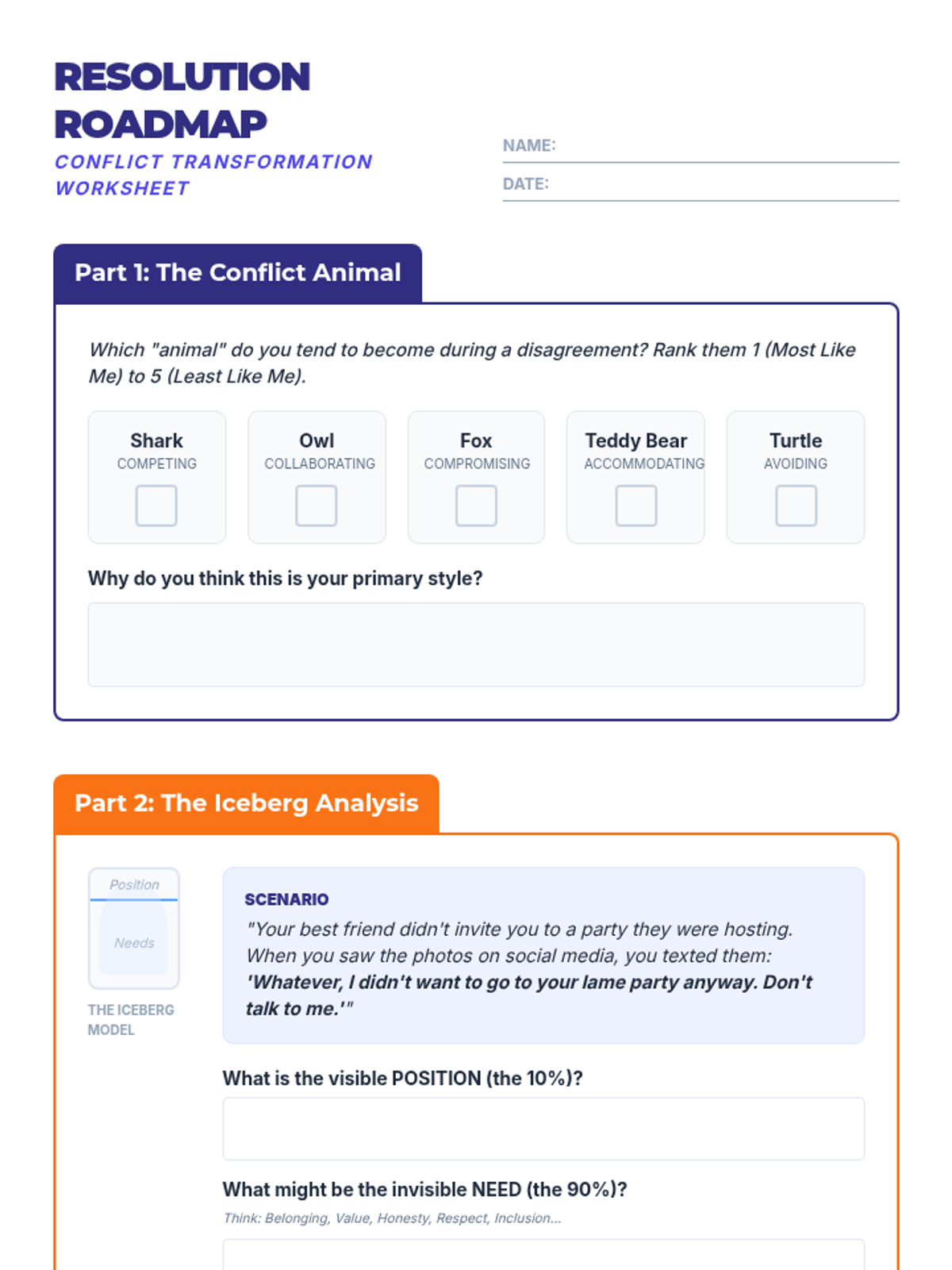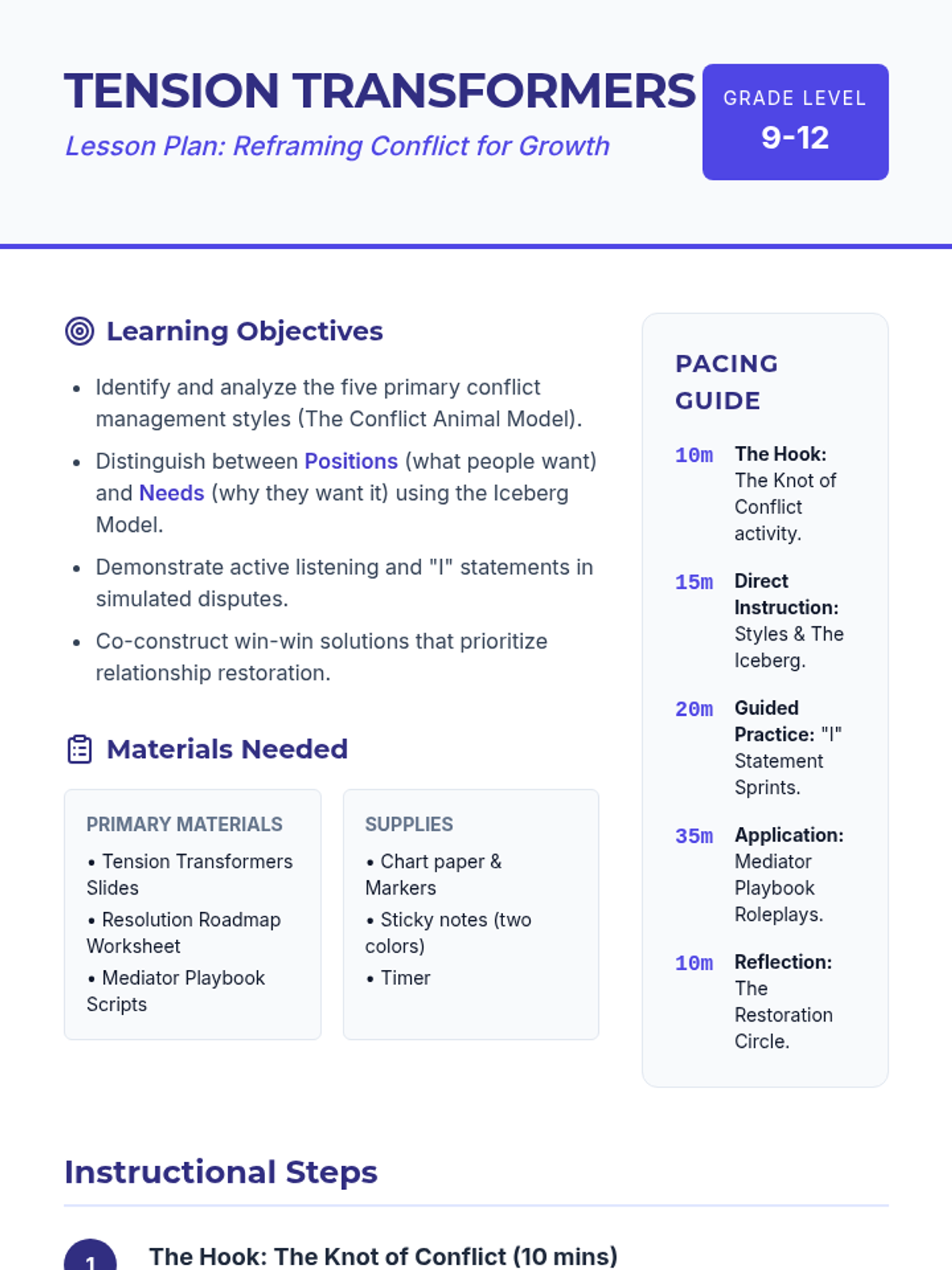 A comprehensive lesson for high school students on reframing conflict as an opportunity for growth. Students explore conflict styles, identify underlying needs using the 'Iceberg' model, and practice collaborative problem-solving and relationship restoration.