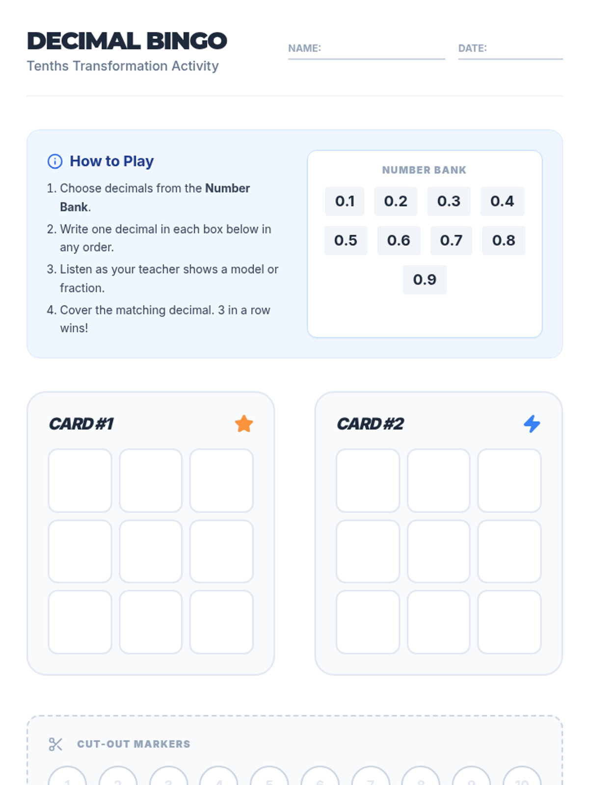A collection of high-energy 4th-grade math games focused on decimal place value, comparison, and equivalent fractions. These games utilize 10-sided dice and spinners to make reviewing tenths and hundredths engaging and hands-on.