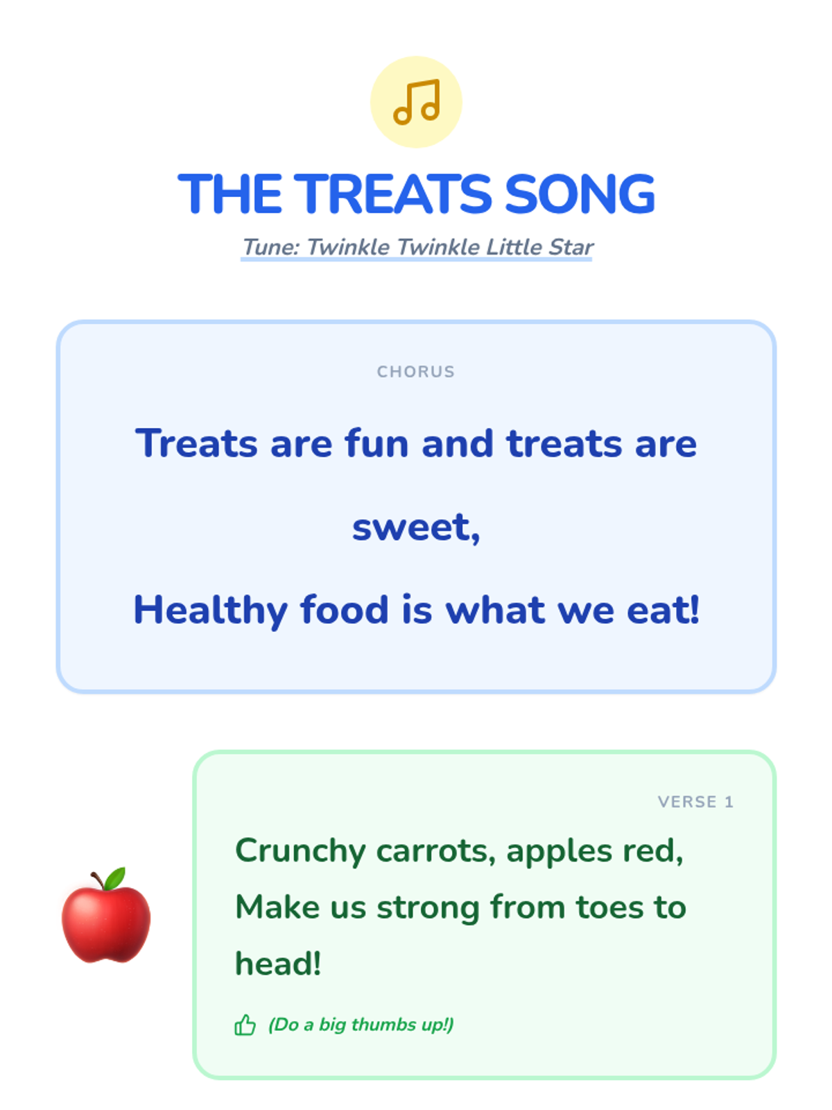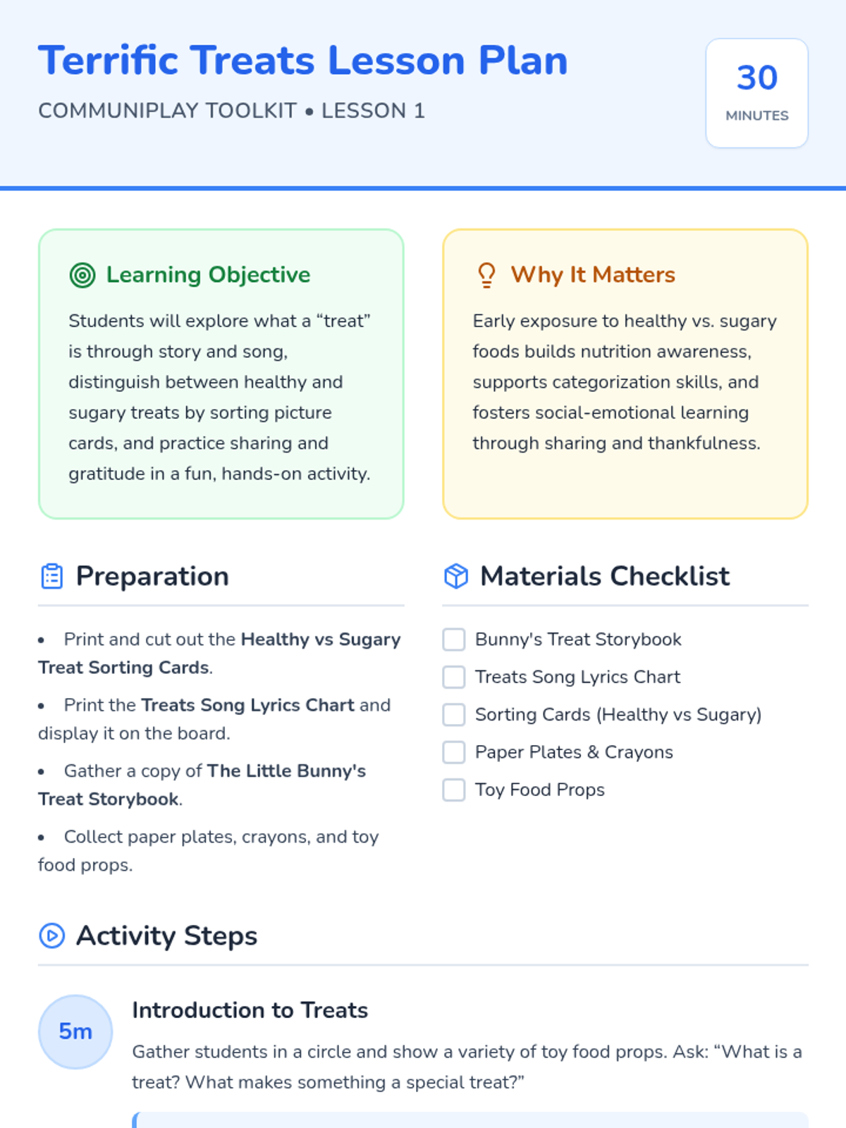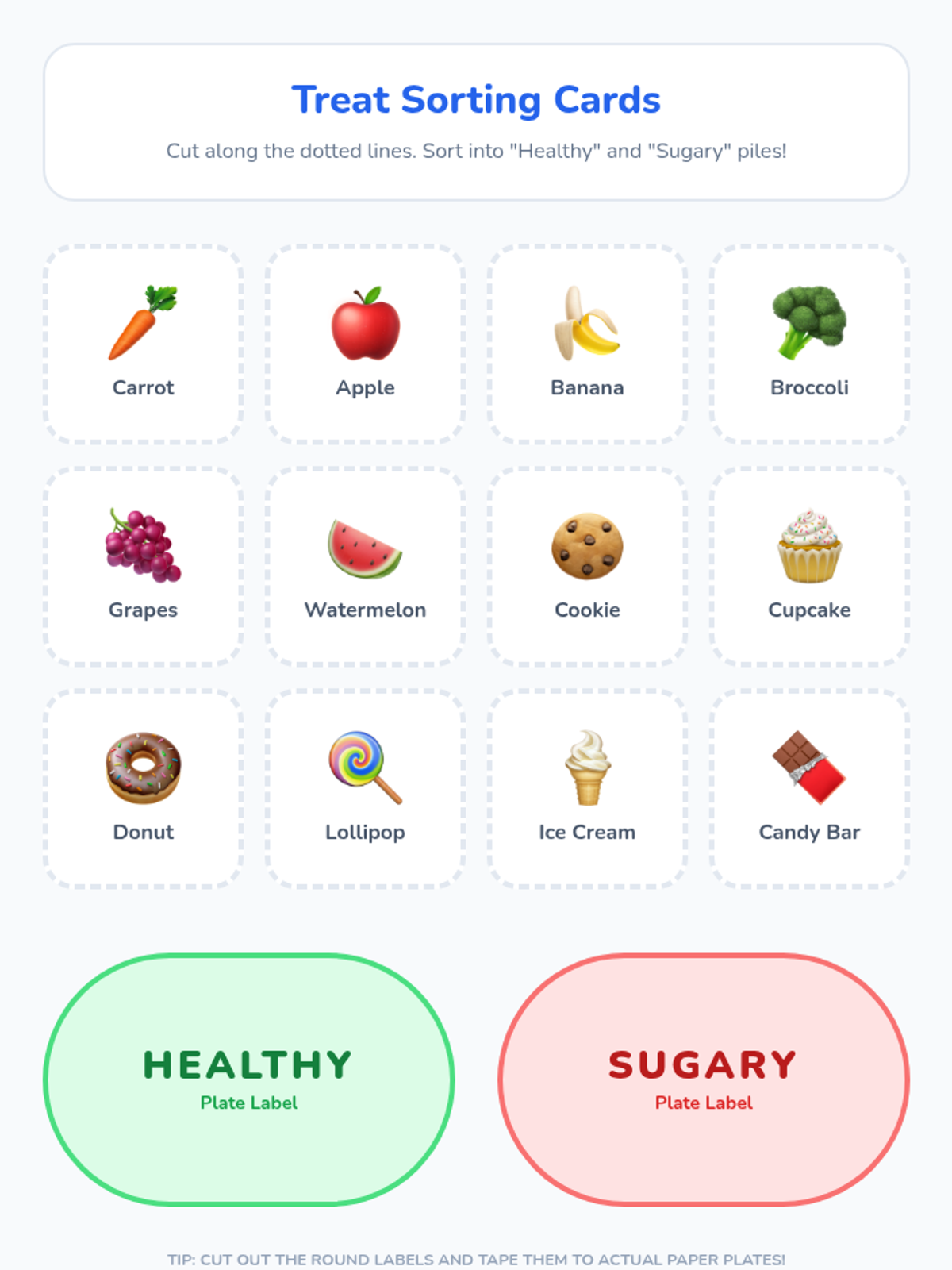 Explore the difference between healthy and sugary treats through a bunny story and a sorting game.