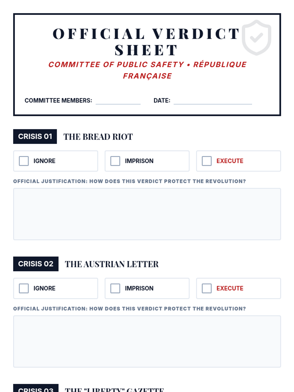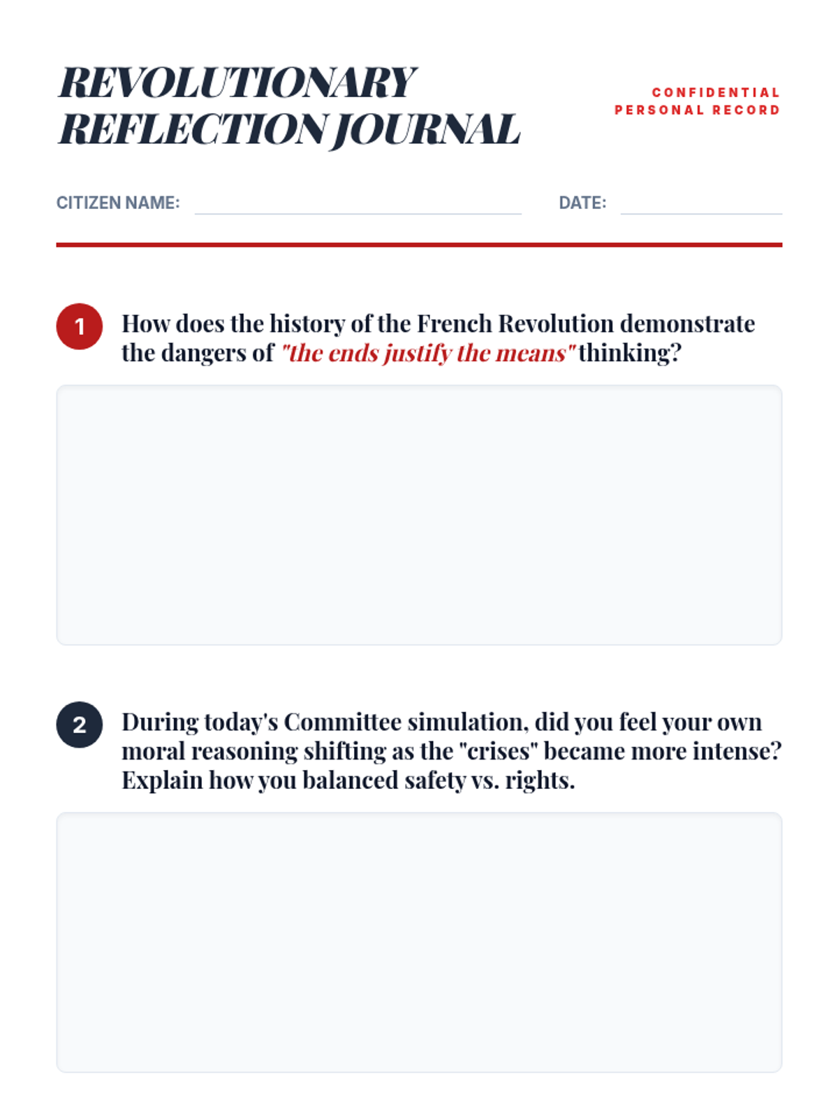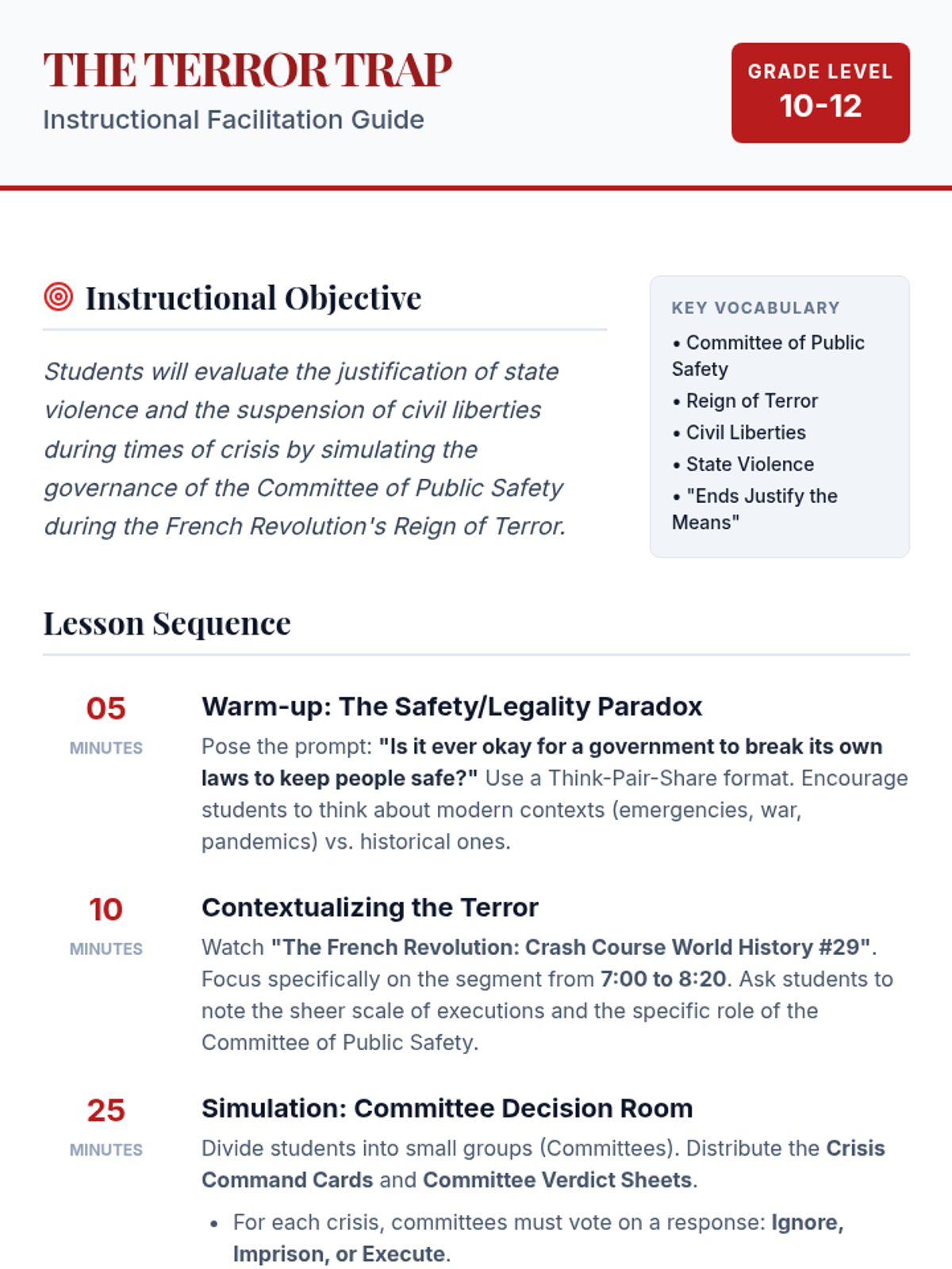 This lesson explores the moral and political dilemmas of the Reign of Terror, challenging students to simulate the difficult decisions faced by the Committee of Public Safety while evaluating the justification of state violence.