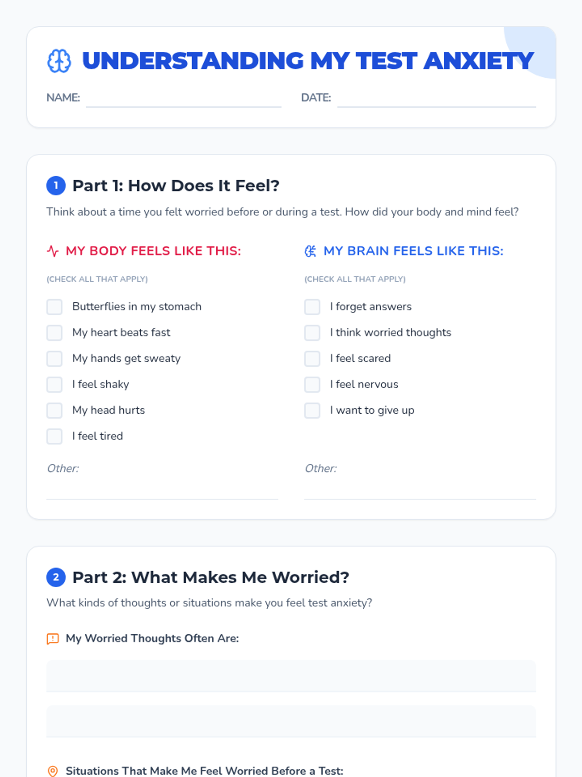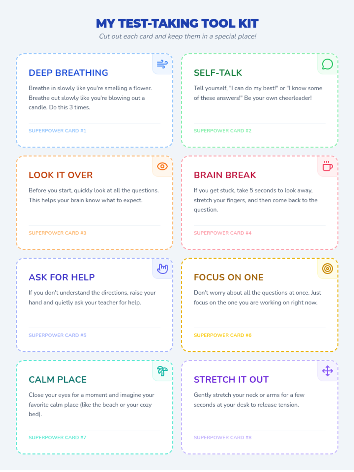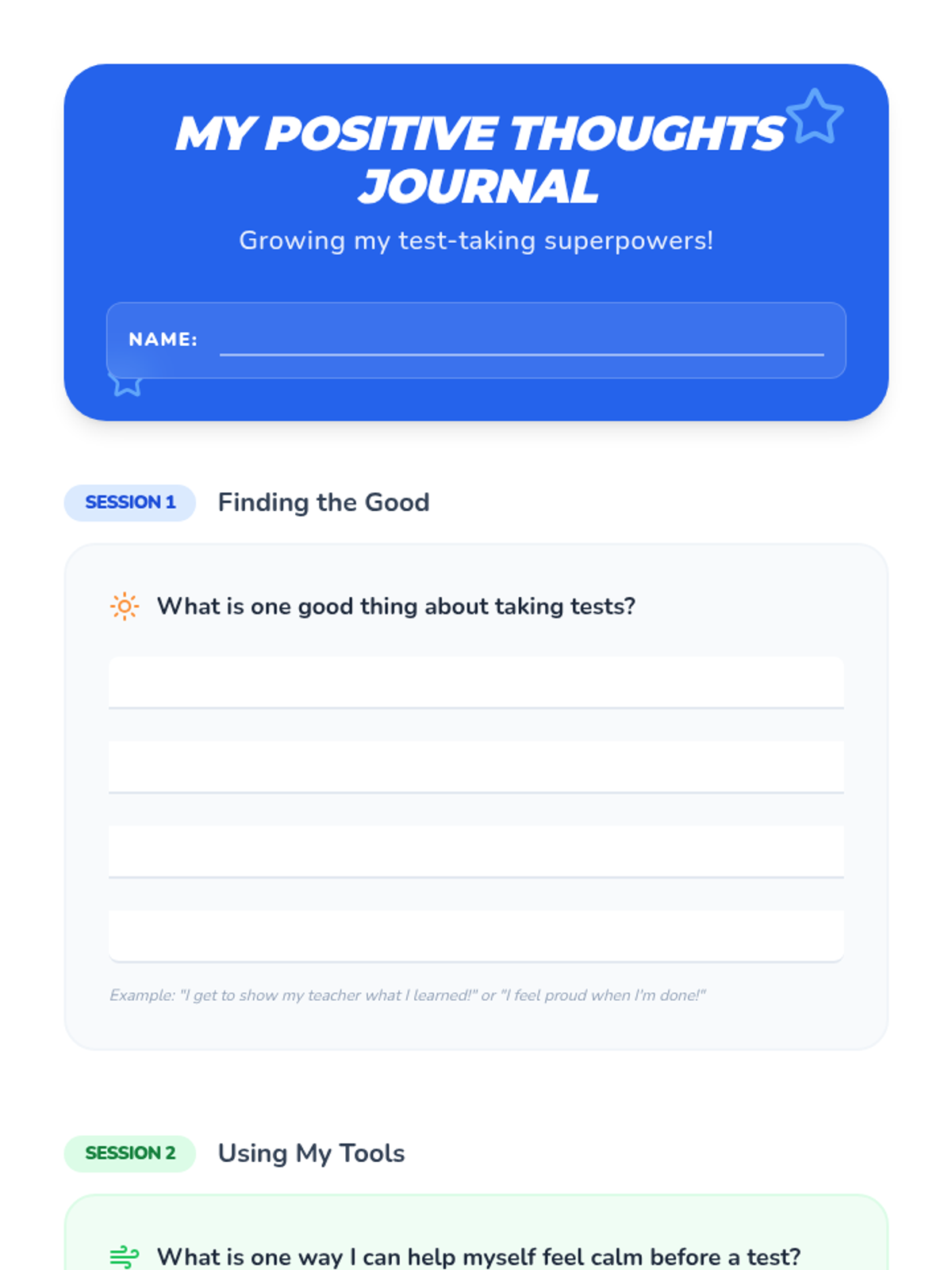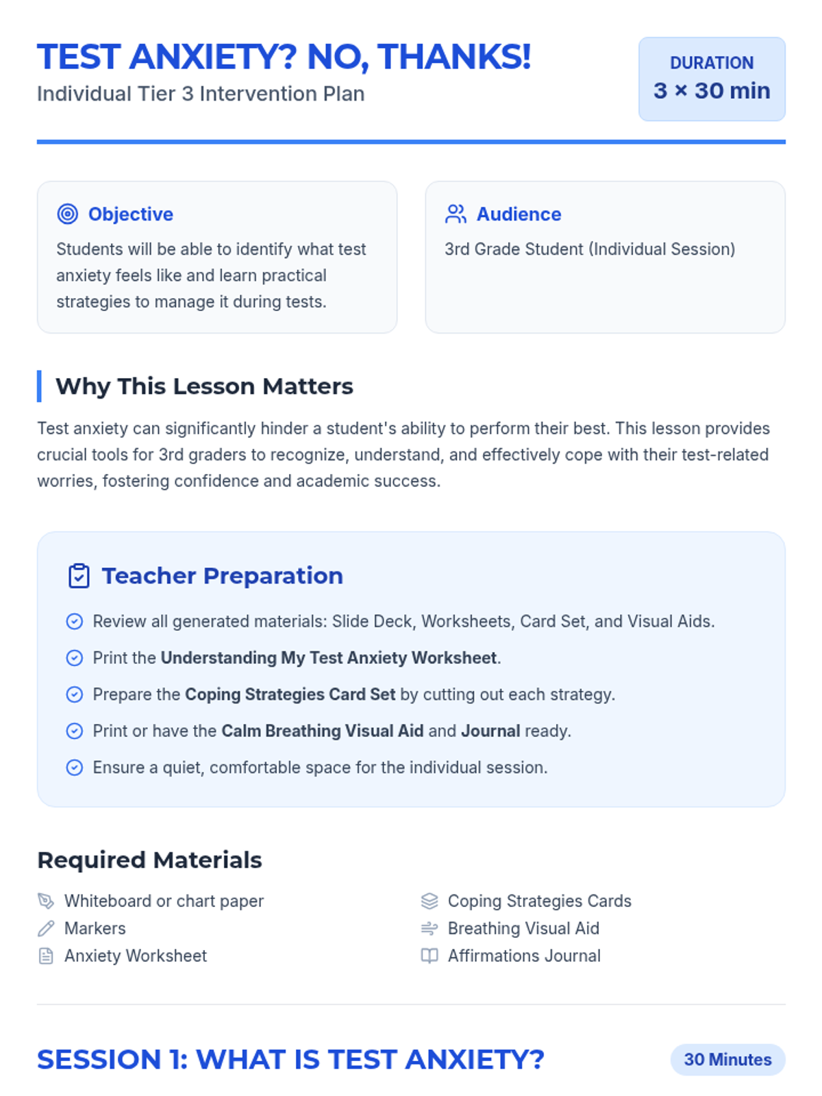 This 3-session individual intervention helps 3rd-grade students identify test anxiety symptoms, learn calming techniques, and practice coping strategies to improve confidence and performance.