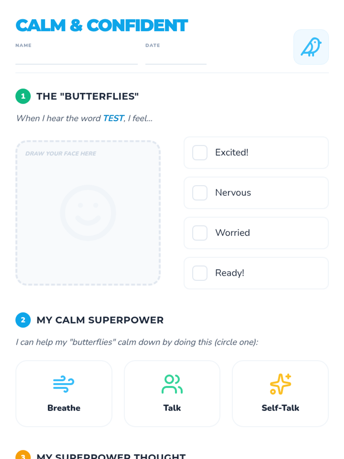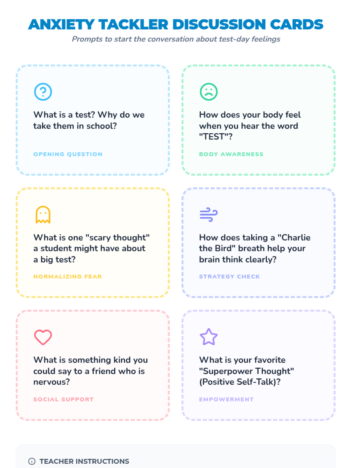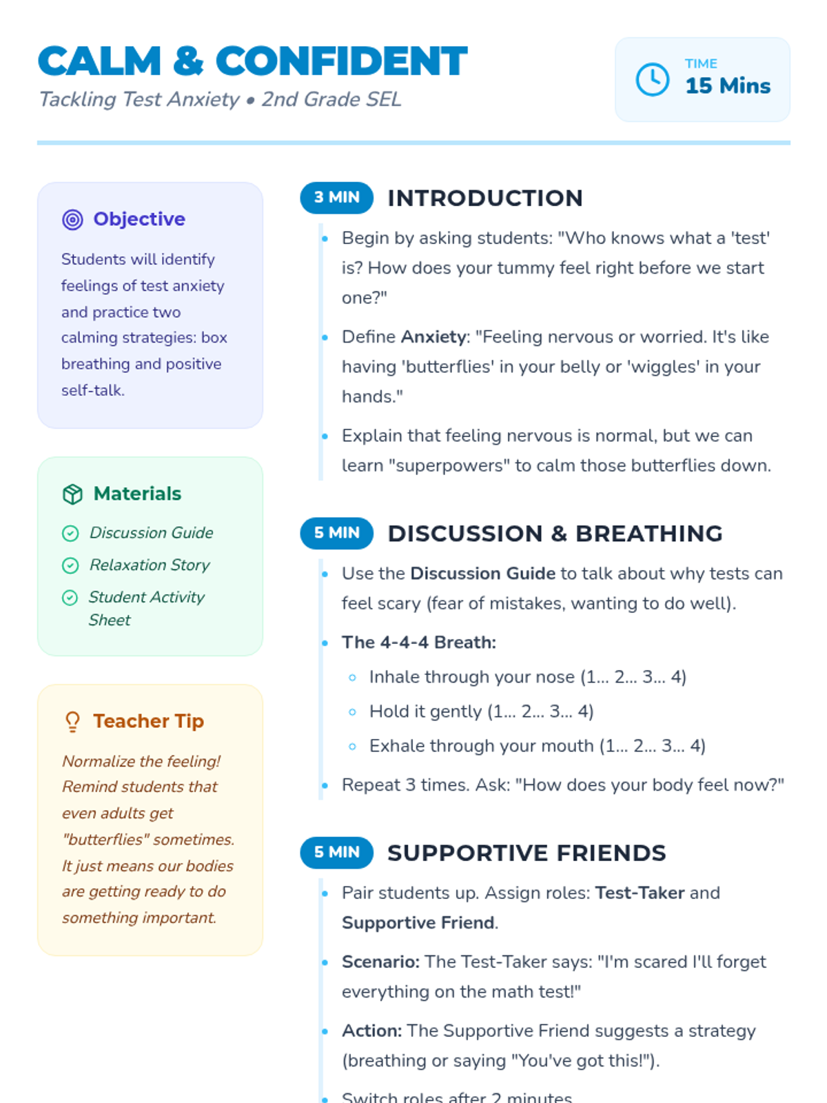 A 15-minute social-emotional learning lesson for 2nd graders to recognize test anxiety and learn calming strategies like deep breathing and positive self-talk.