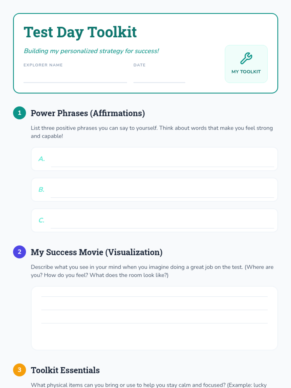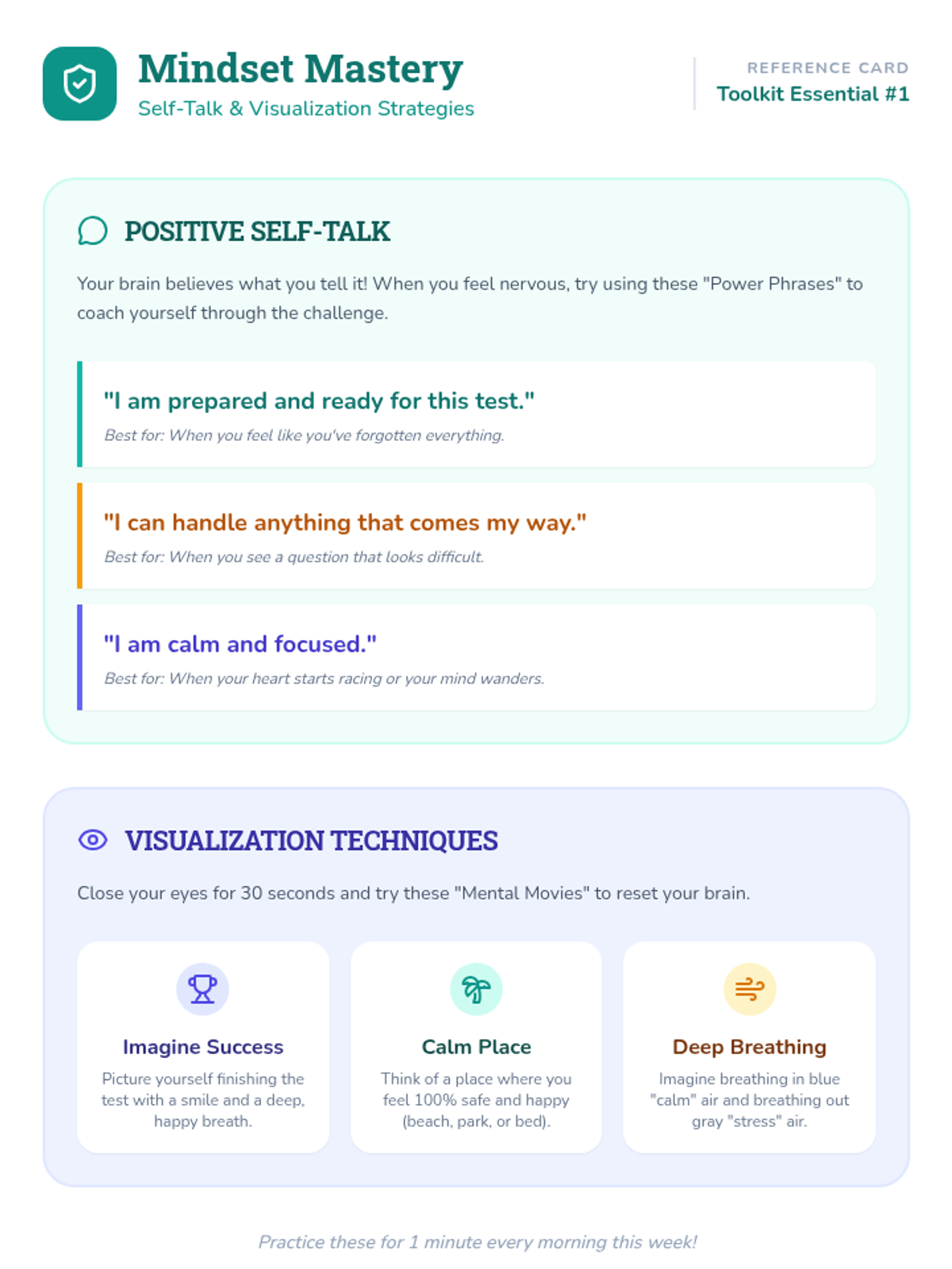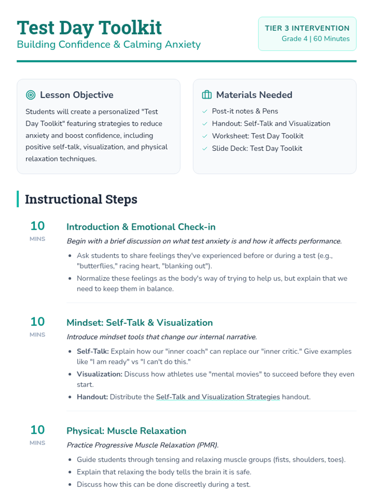 A Tier 3 intervention lesson designed for 4th-grade students to build emotional resilience and practical strategies for managing test anxiety through positive self-talk, visualization, and physical relaxation techniques.
