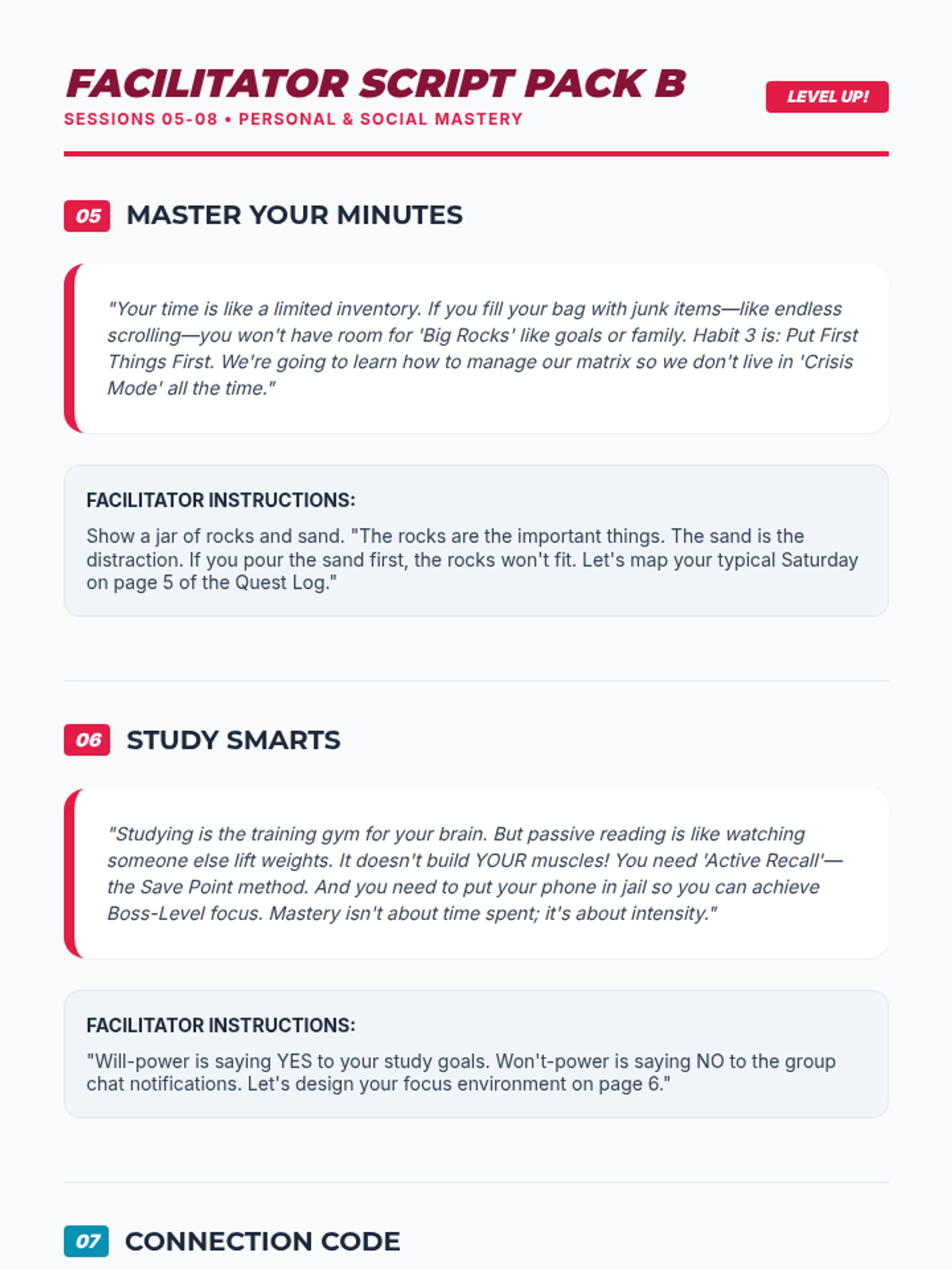 Finalizes skills with conflict resolution strategies (Stop-Drop-Solve) and long-term goal planning.
