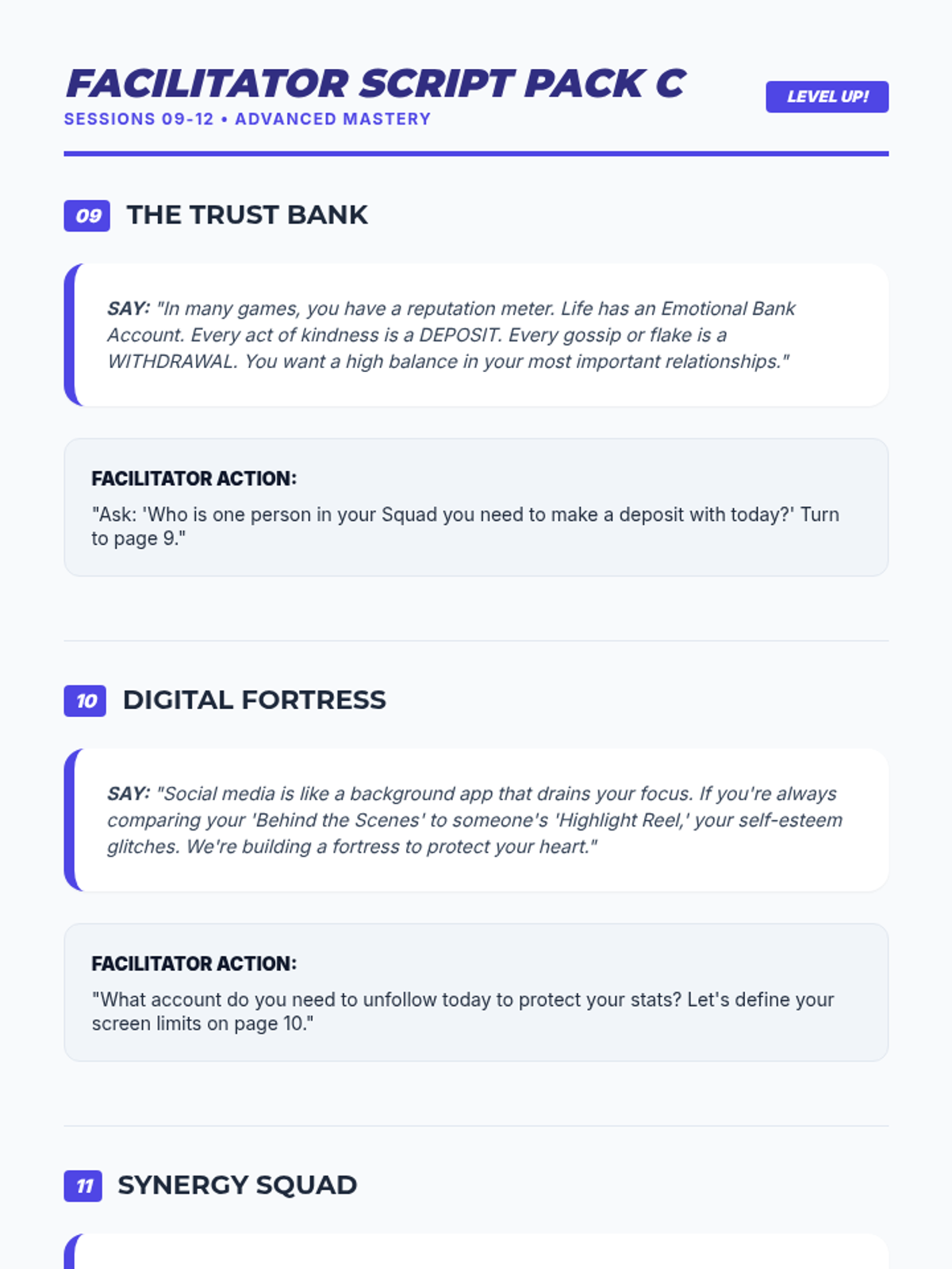 Practical team-based synergy challenges to apply collaborative problem-solving skills.