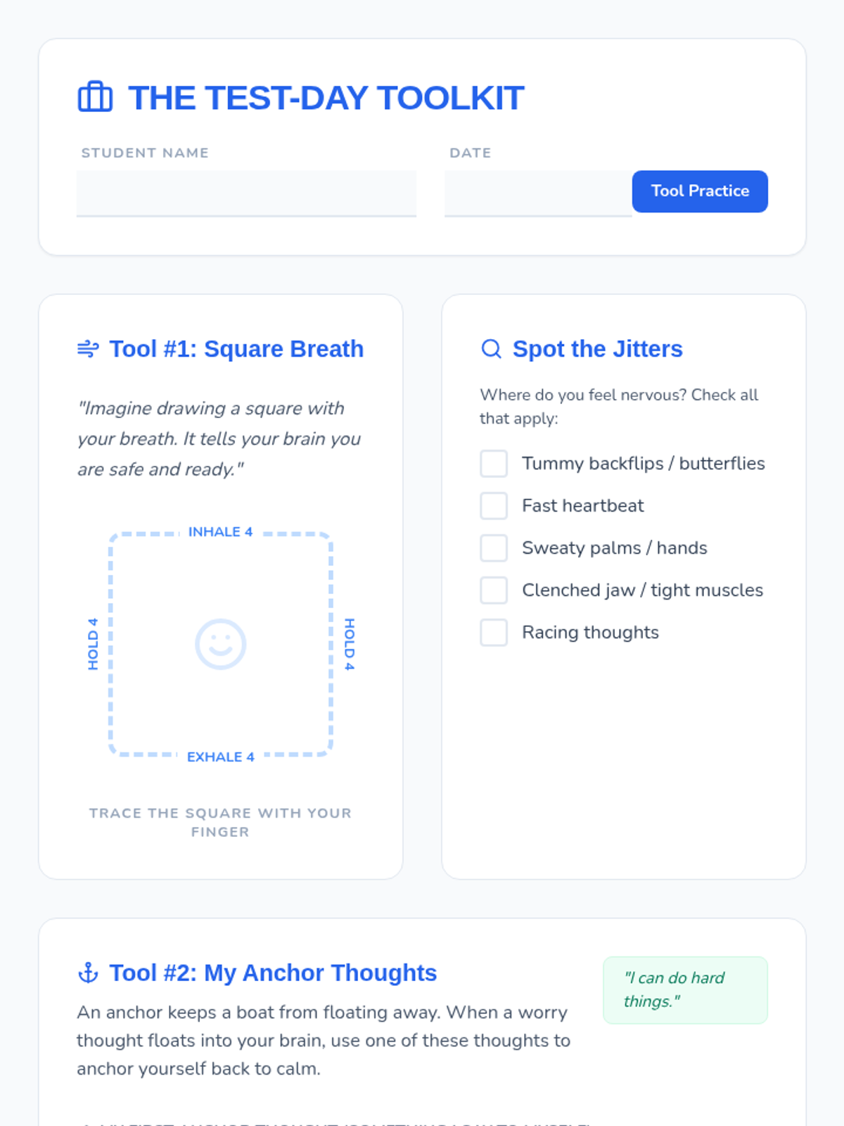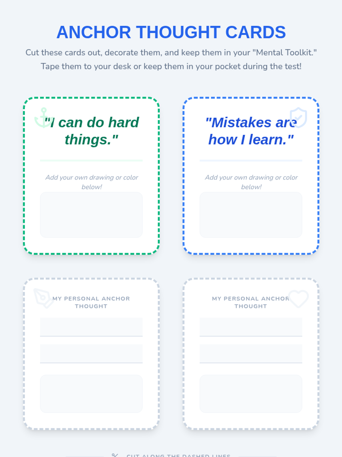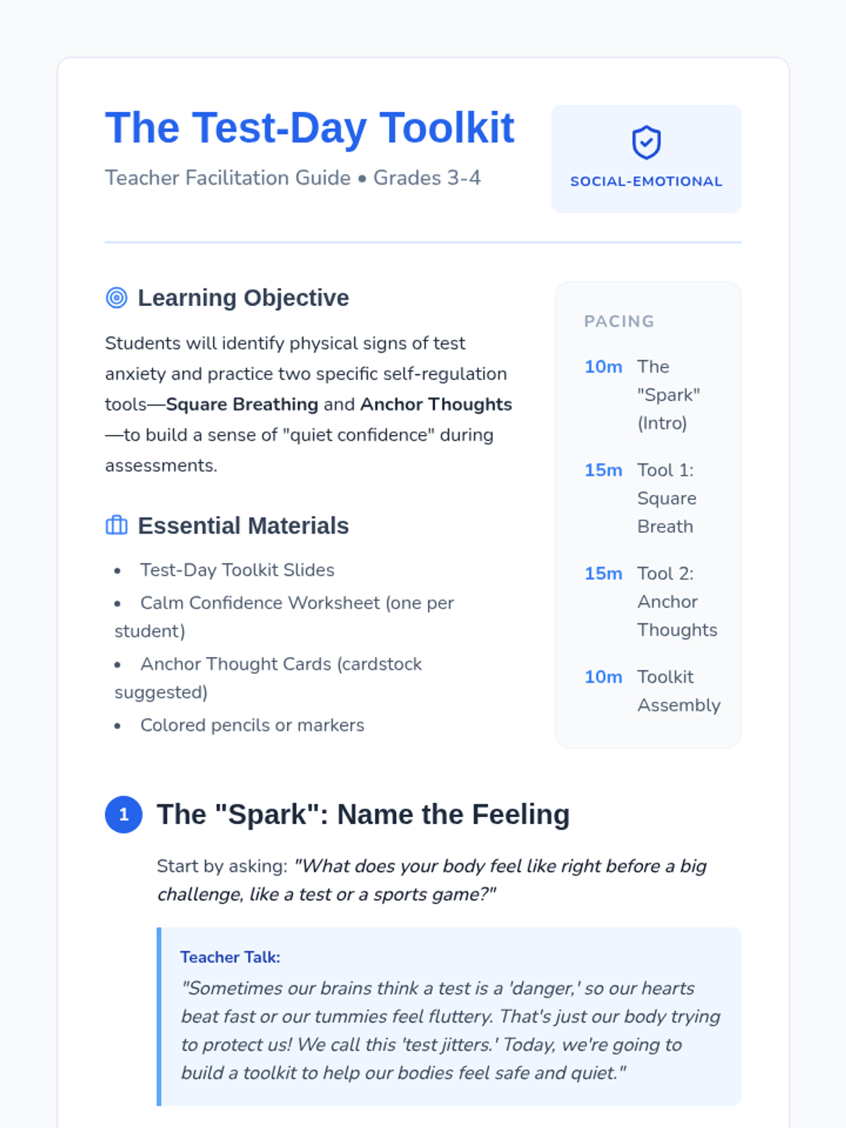 A comprehensive lesson for 3rd and 4th graders to manage testing anxiety through square breathing and anchor thoughts, building quiet confidence for spring assessments.