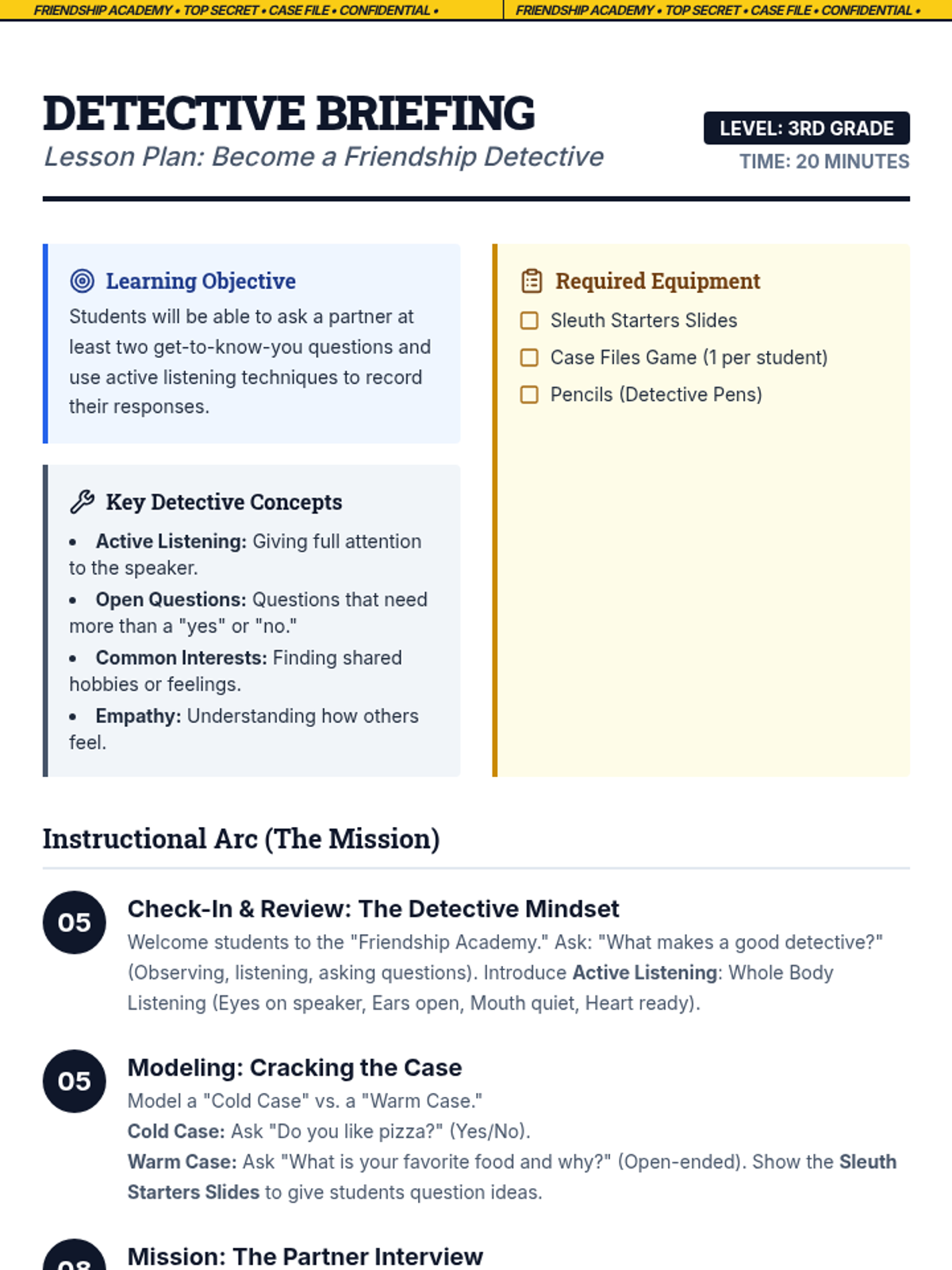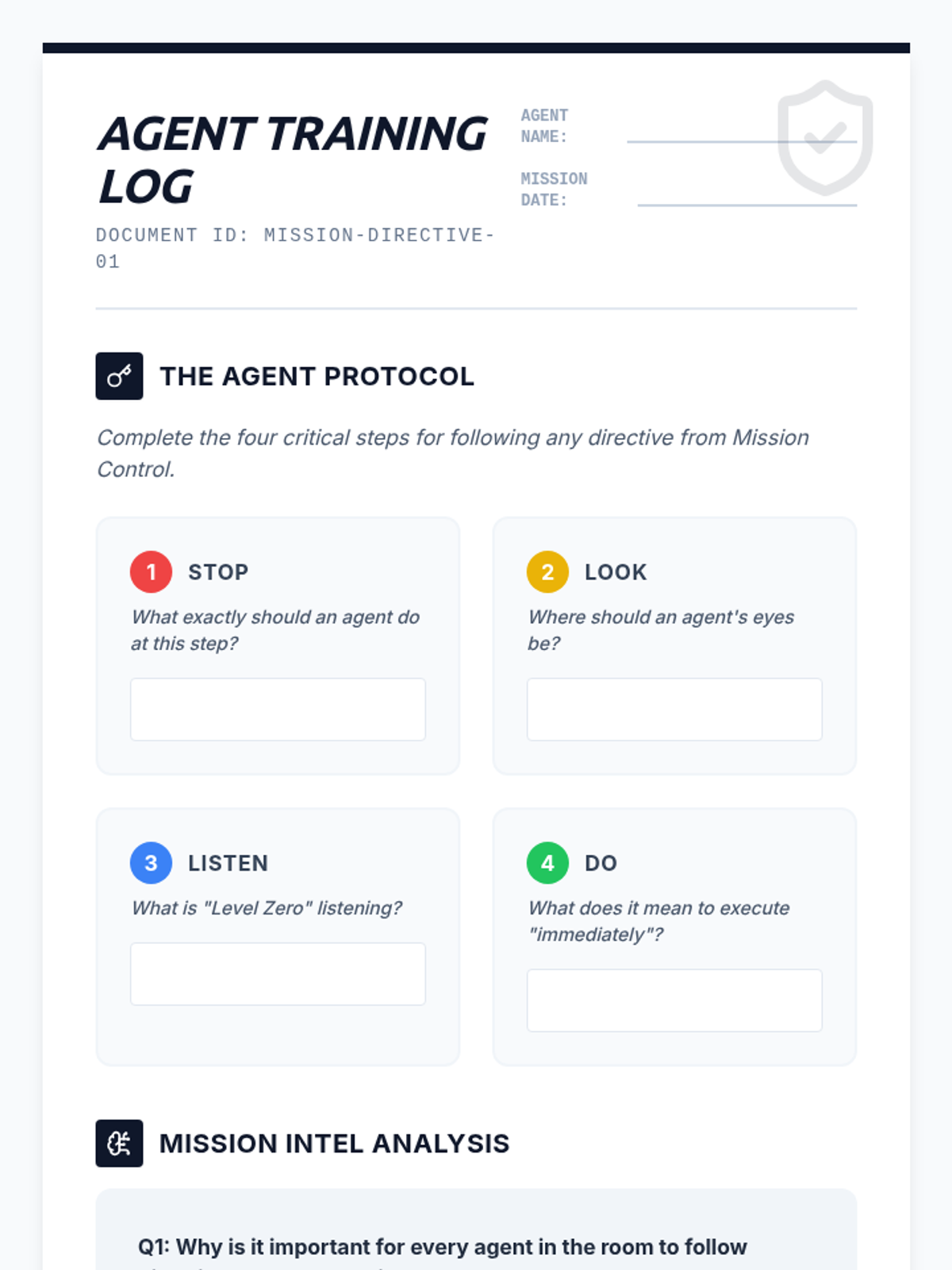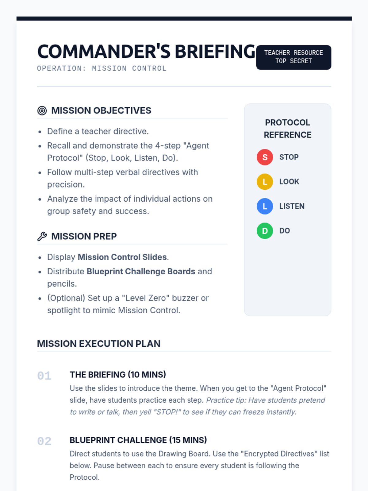 A high-stakes, secret-agent themed lesson that teaches students the importance of following teacher directives through active listening and immediate action. Students will learn the 'Stop, Look, Listen, Do' framework to become elite classroom agents.