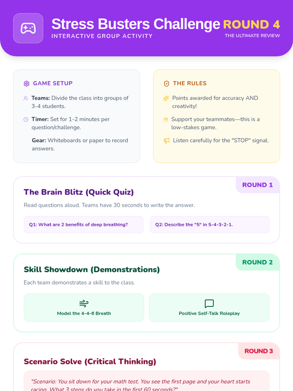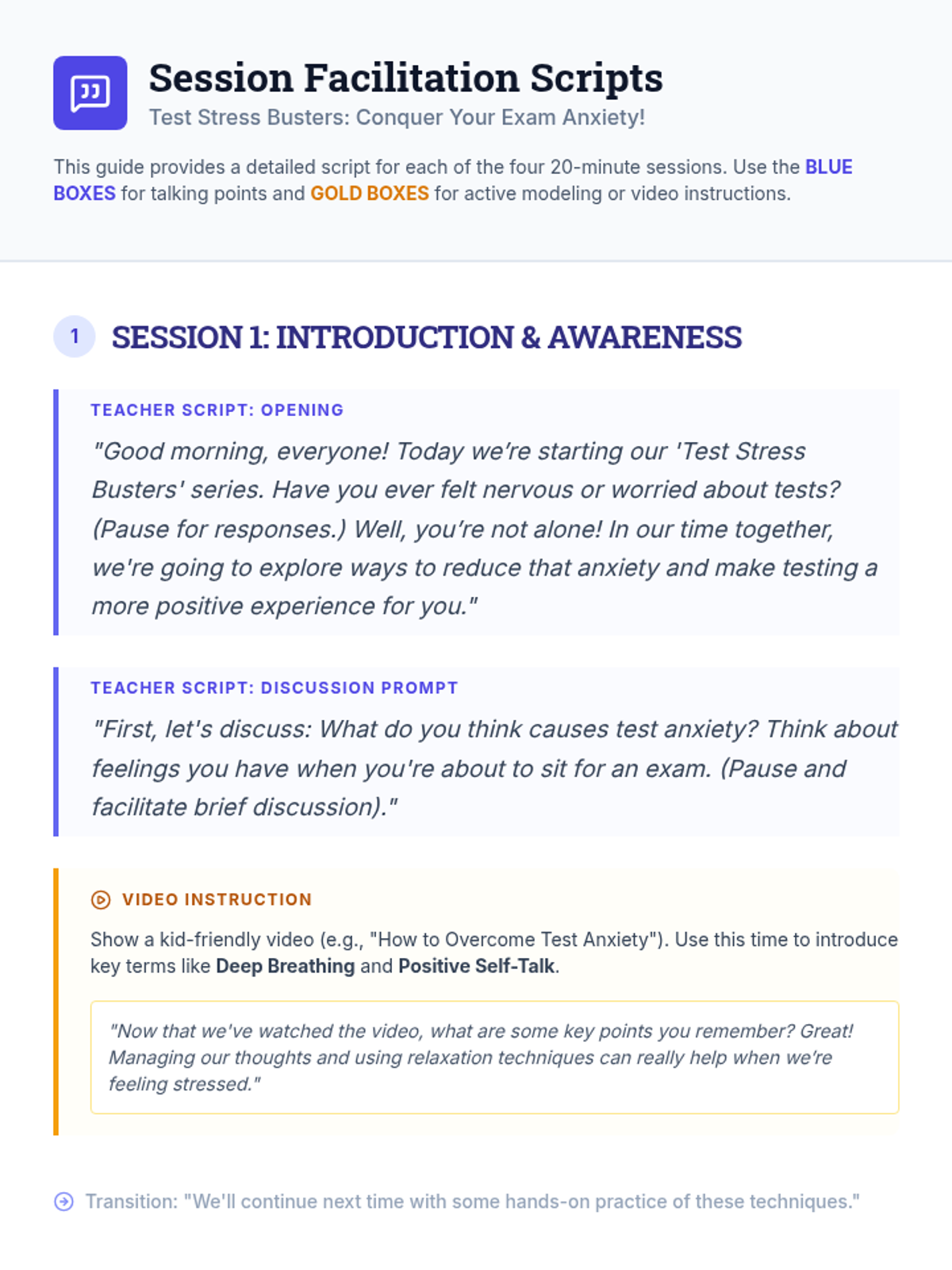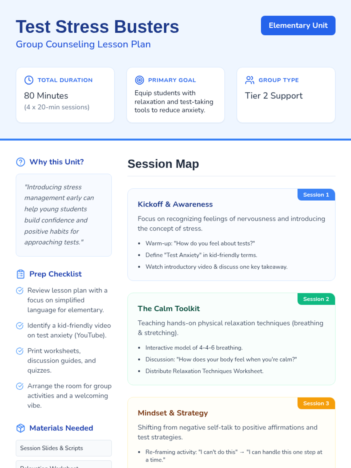 A comprehensive 4-session group counseling unit designed to help elementary students recognize, manage, and overcome test anxiety using practical relaxation and cognitive-reframing techniques.