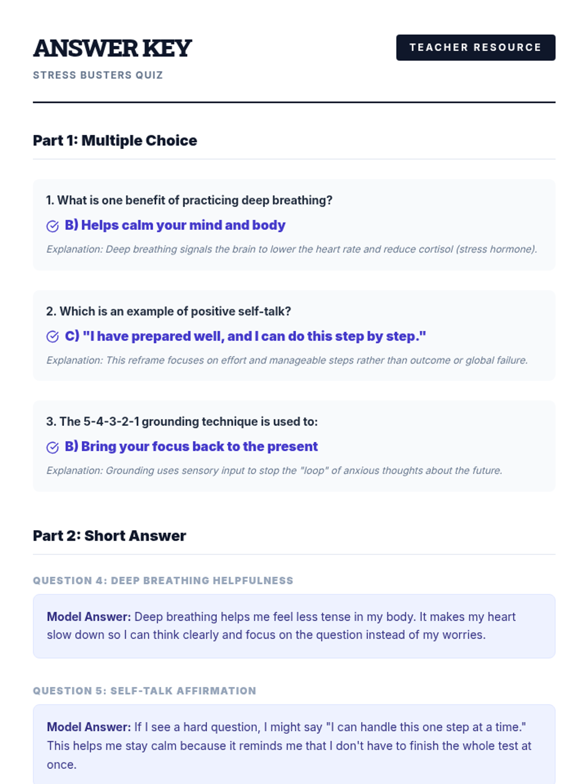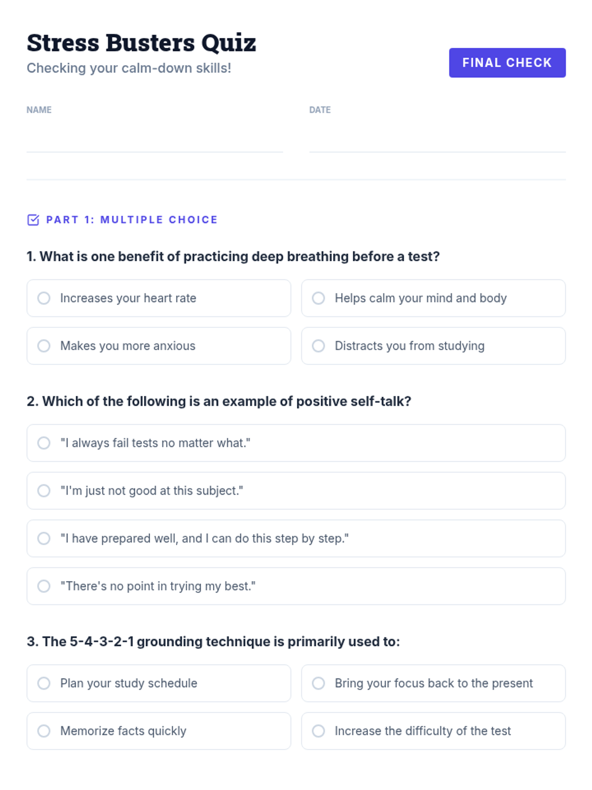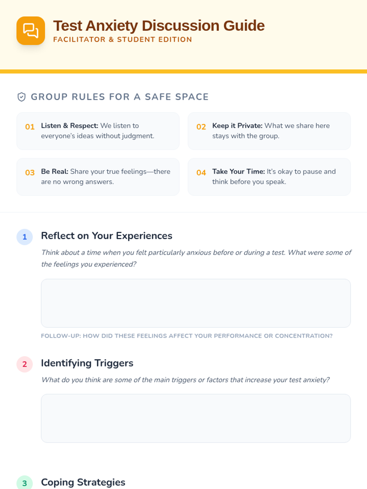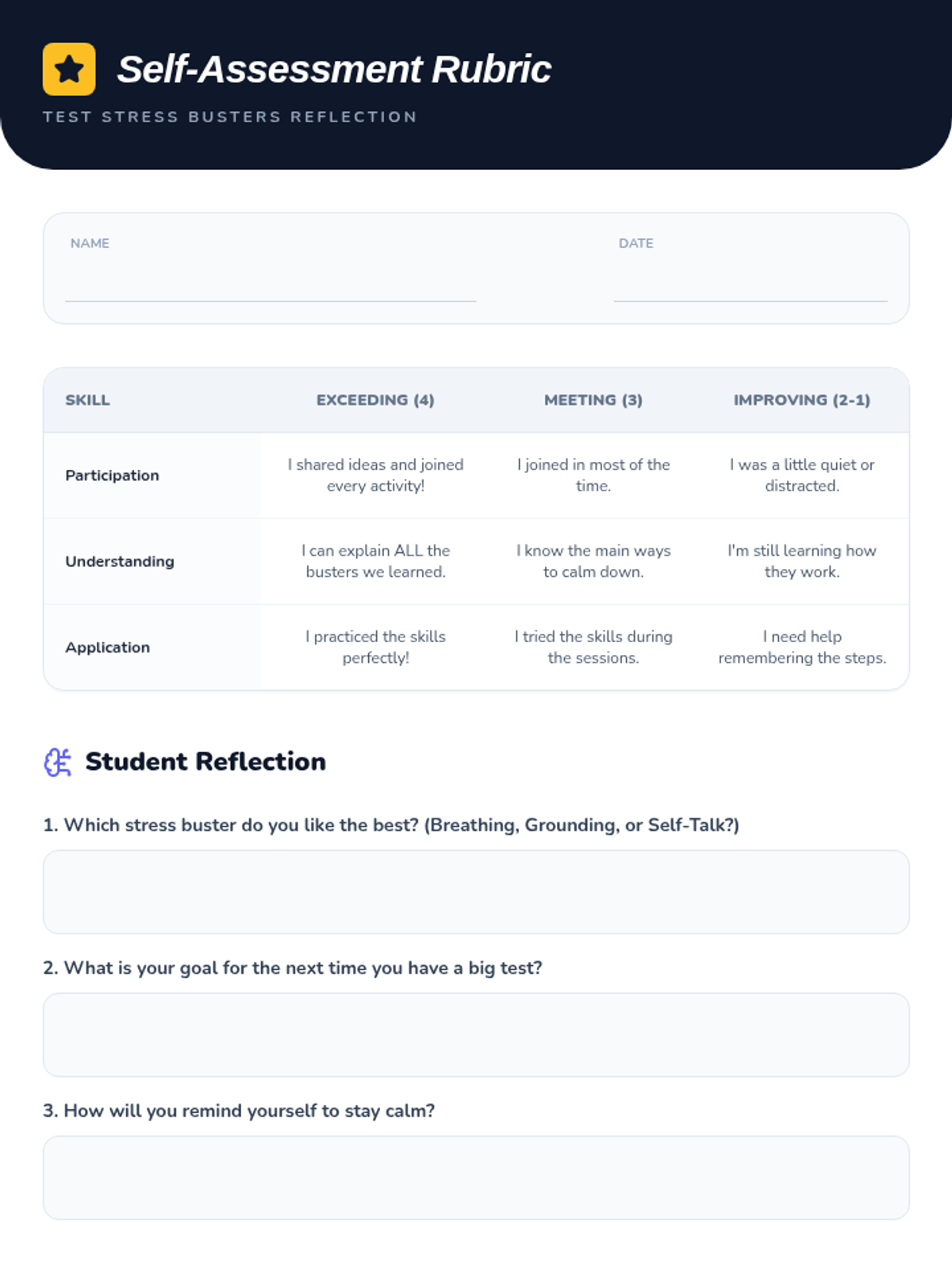 A comprehensive 4-session group counseling unit designed to help elementary students recognize, manage, and overcome test anxiety using practical relaxation and cognitive-reframing techniques.