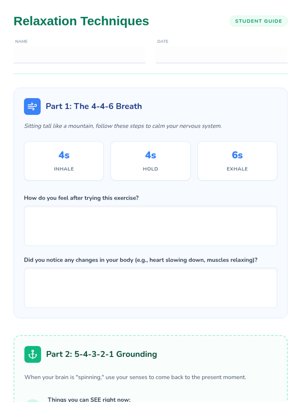 A 30-minute counseling lesson for 3rd graders focused on anxiety regulation through grounding techniques. Students will learn the 5-4-3-2-1 method and understand how to "anchor" themselves when feeling overwhelmed.