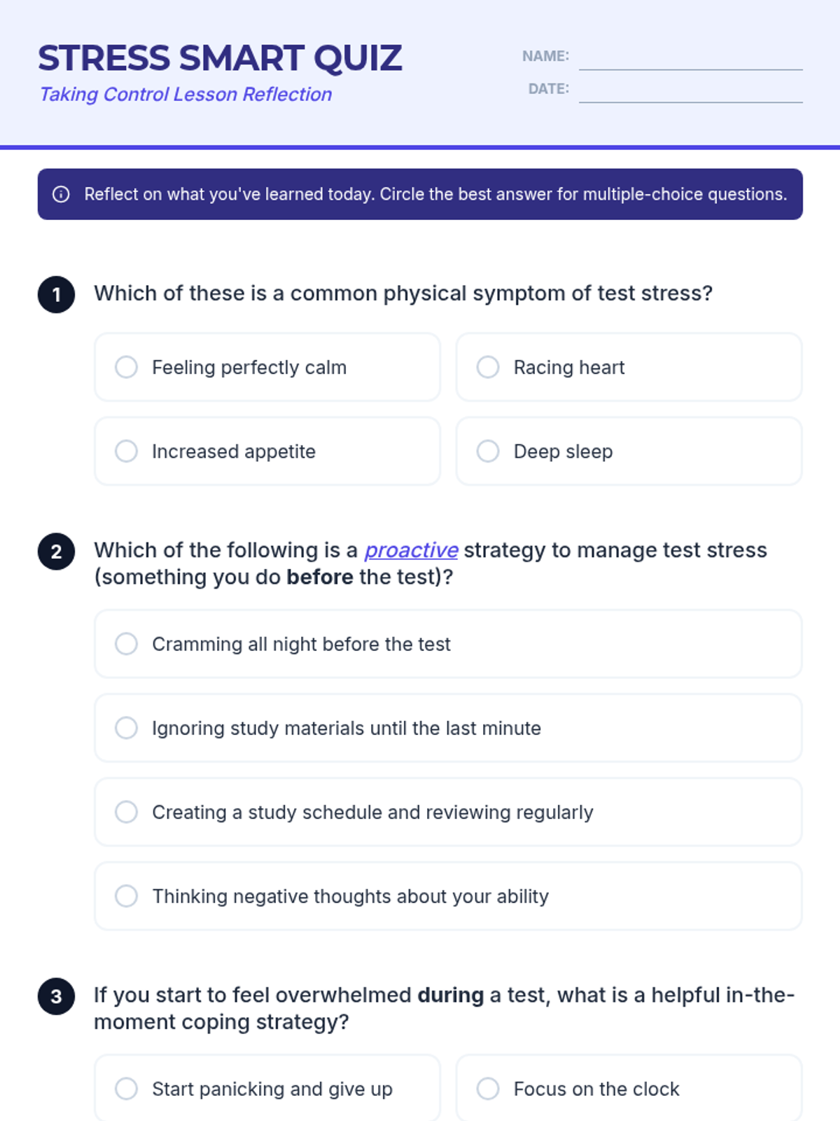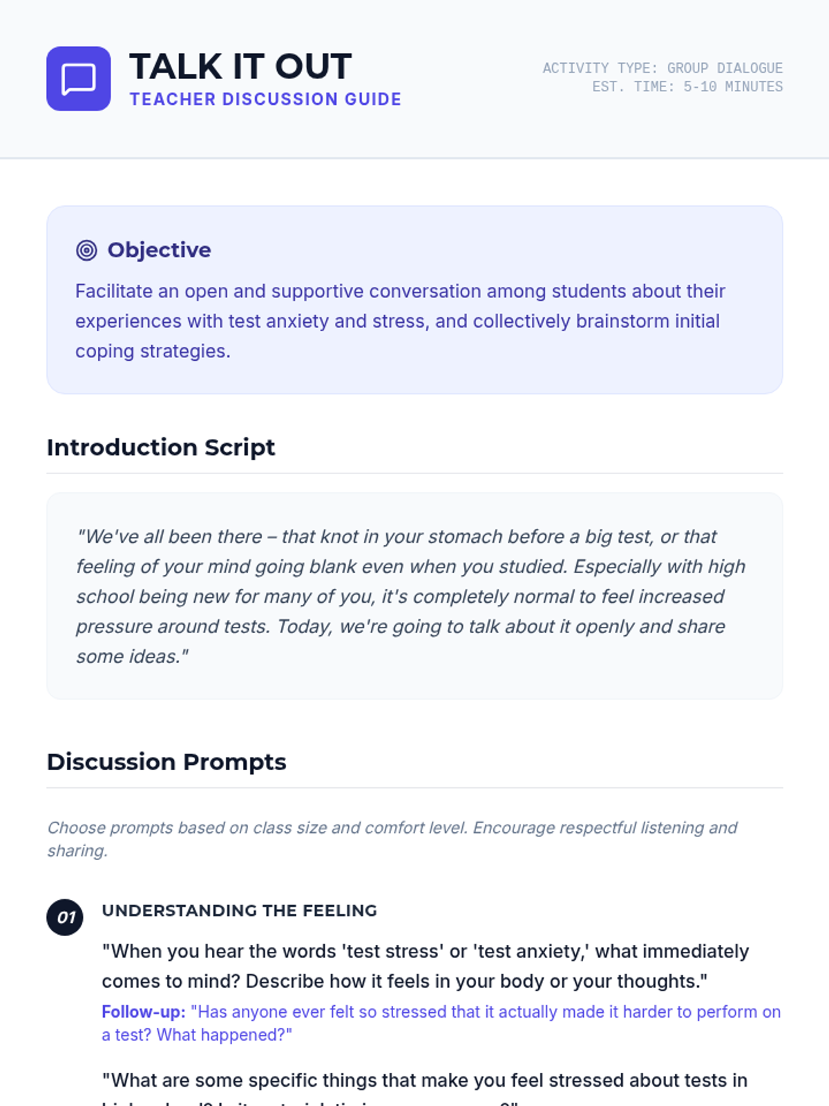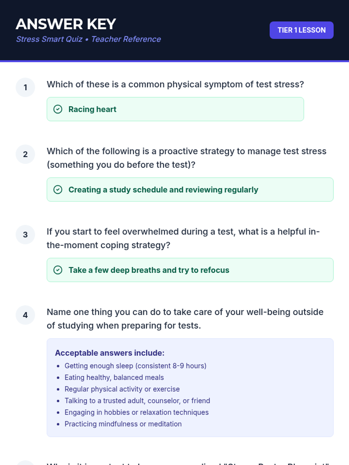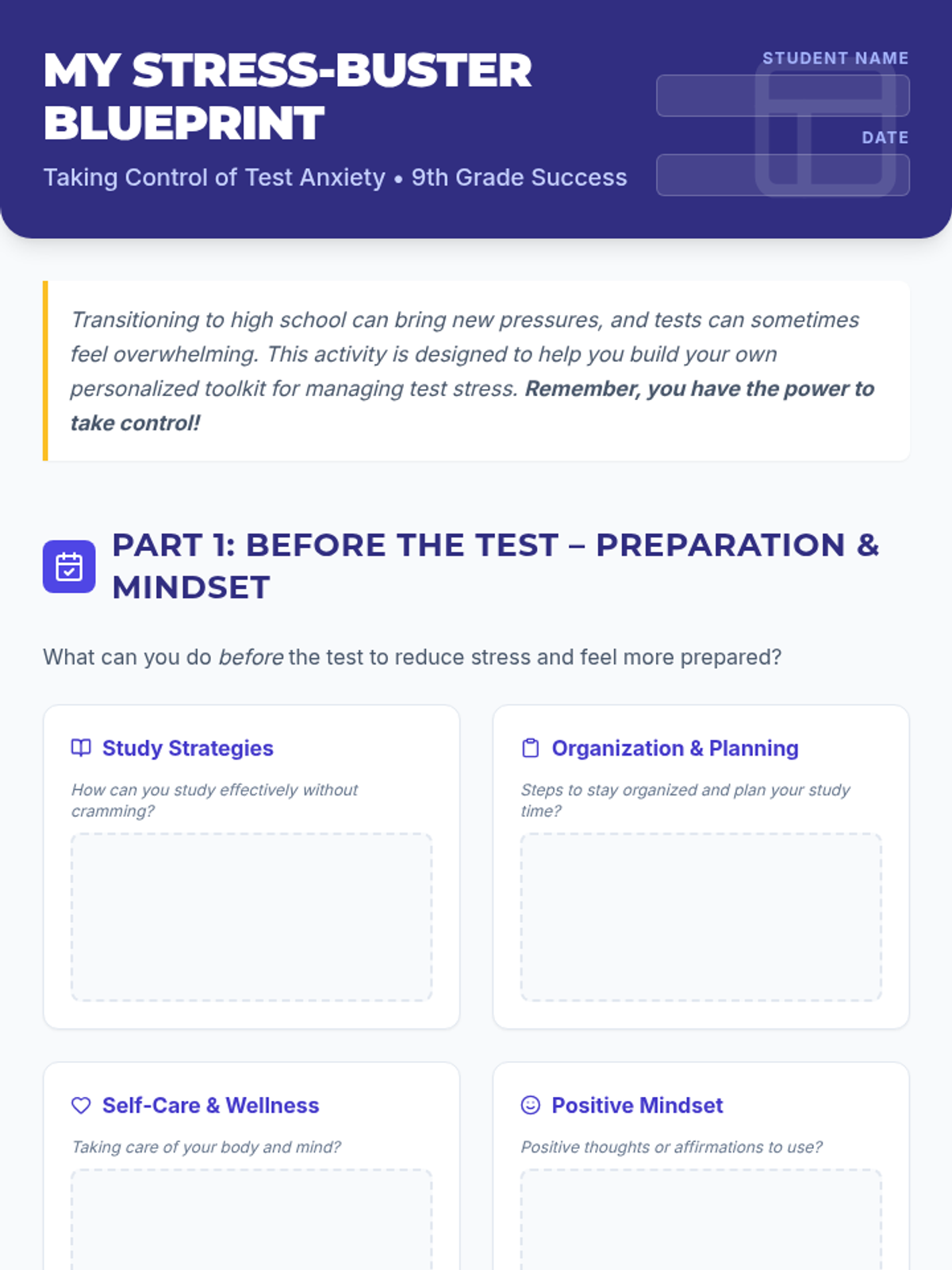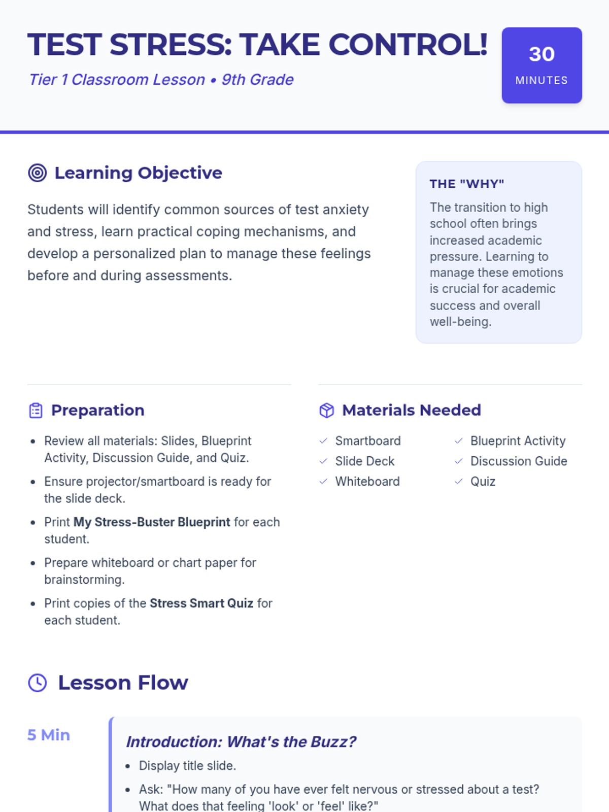 A 30-minute Tier 1 lesson for 9th graders to understand and manage test-related anxiety through practical strategies and personalized planning.