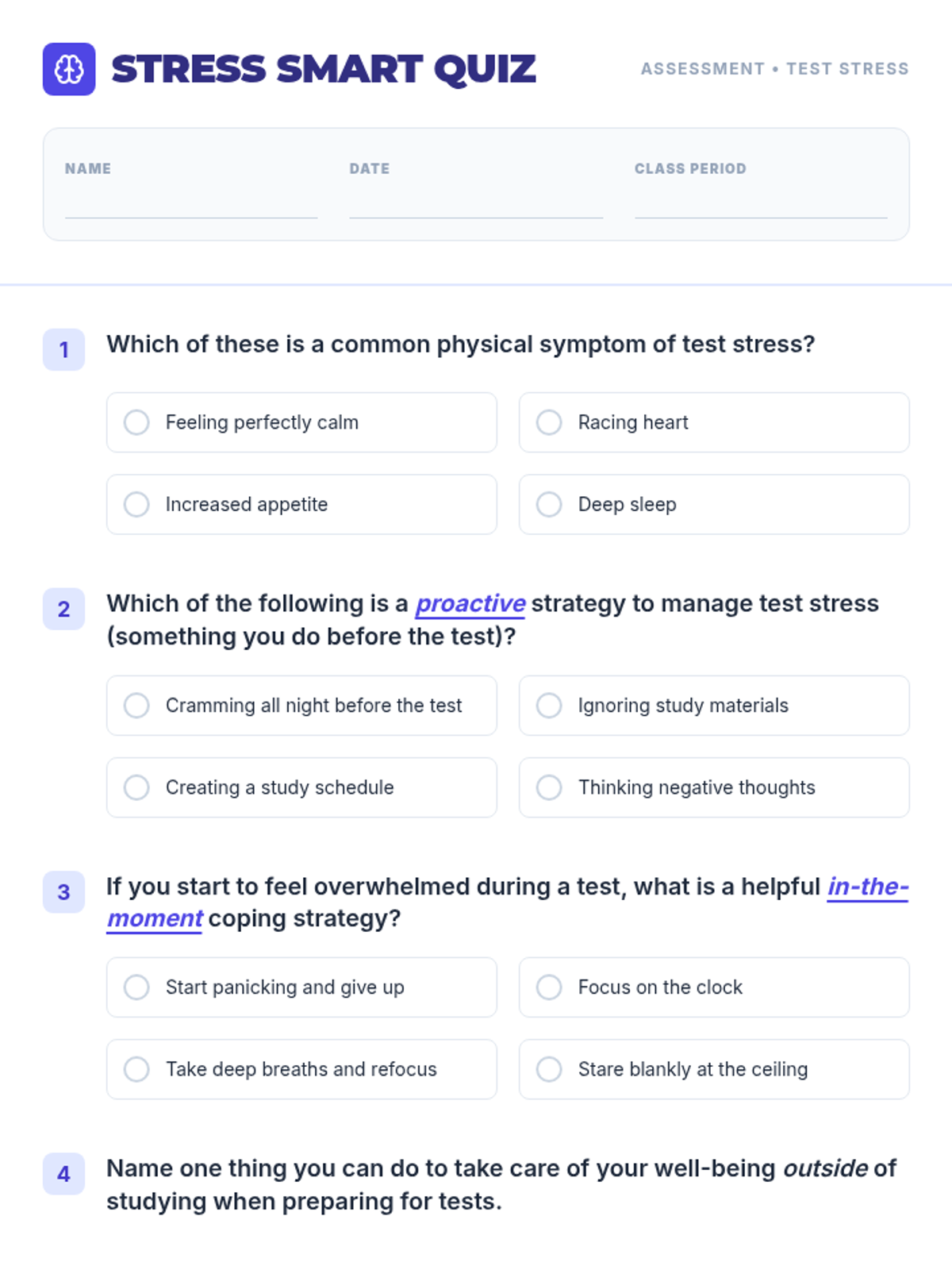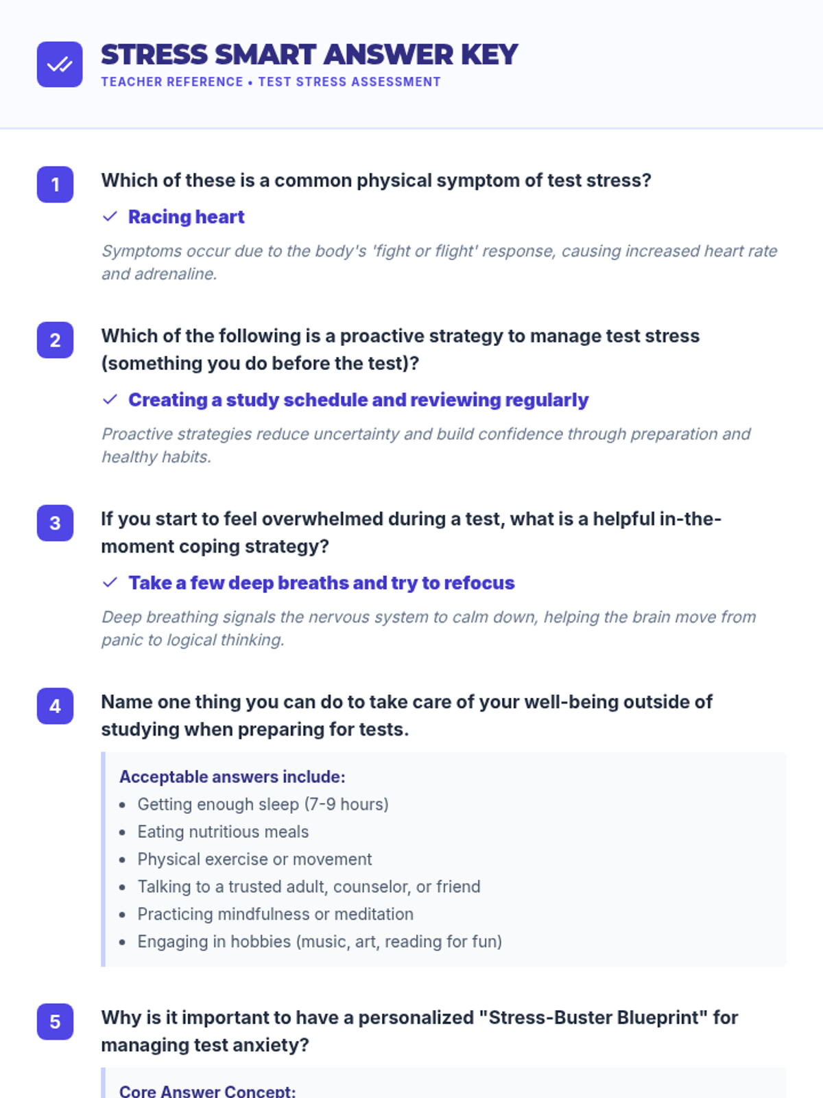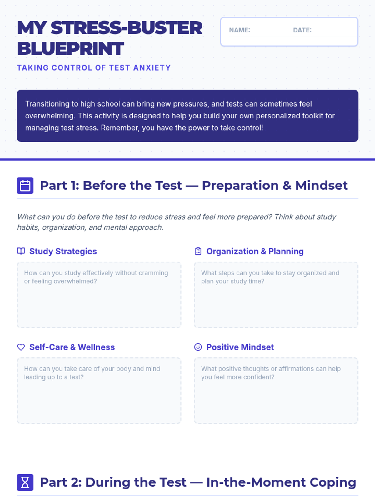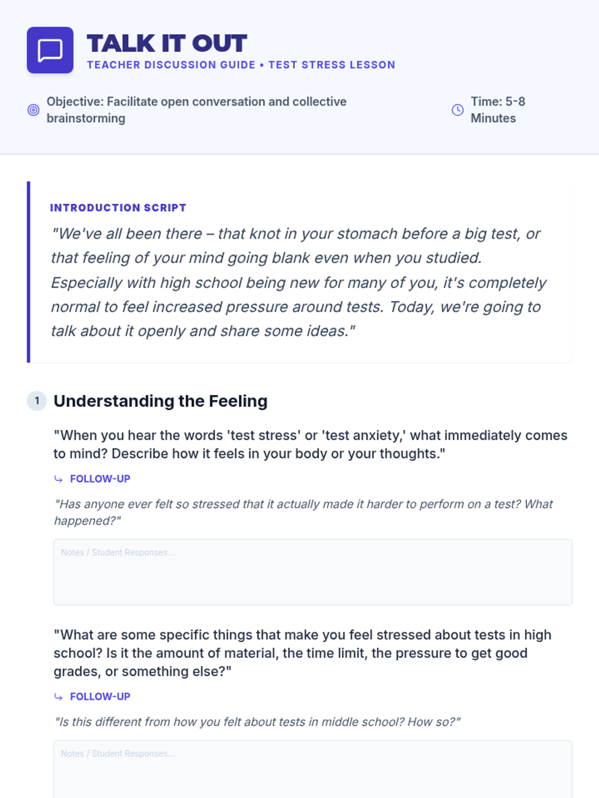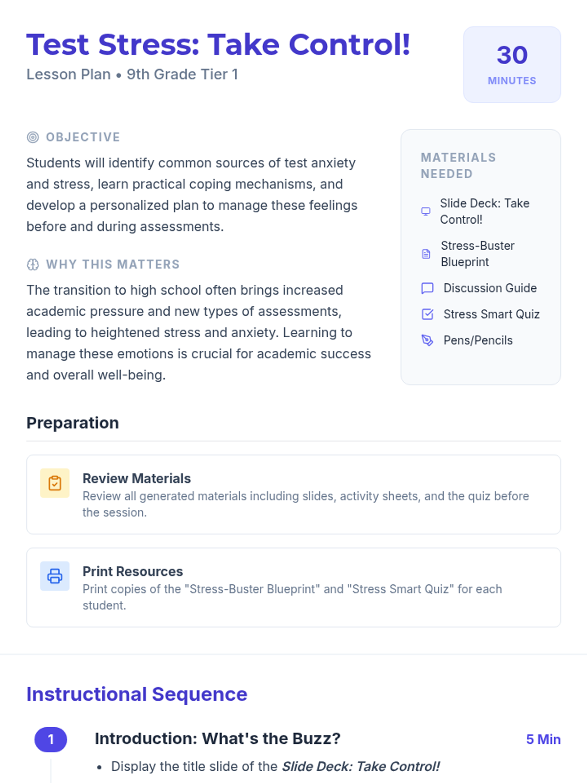 A 30-minute Tier 1 lesson for 9th-grade students to understand and manage test-related anxiety through practical strategies and personalized planning.