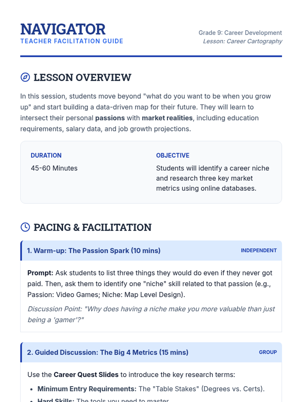 A comprehensive 45-60 minute lesson for 9th graders to explore career paths by aligning personal passions with market data like pay scales and growth projections.