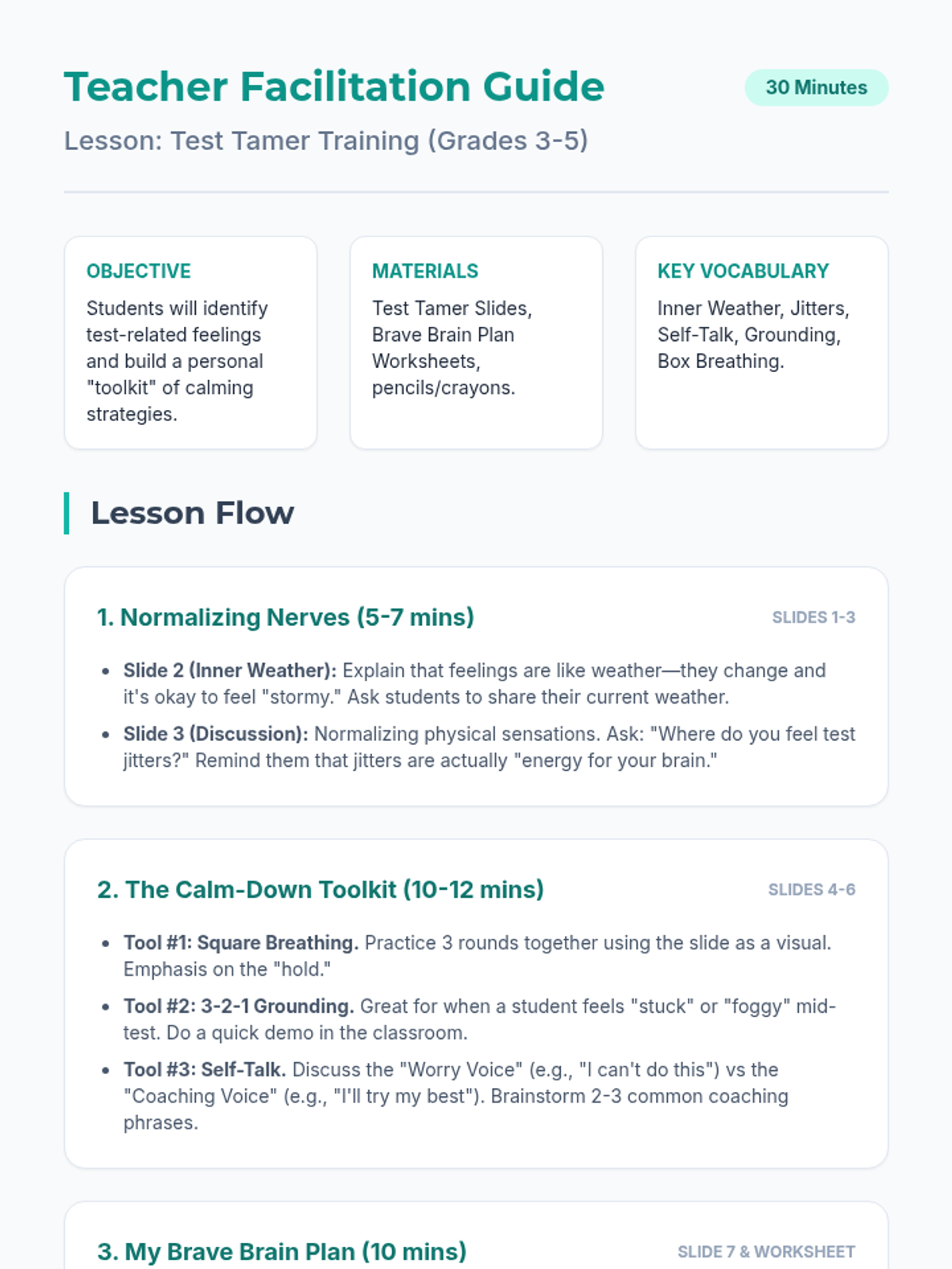 A 30-minute social-emotional learning lesson designed to help grades 3-5 students normalize test anxiety and build a toolkit of calming strategies and positive self-talk.