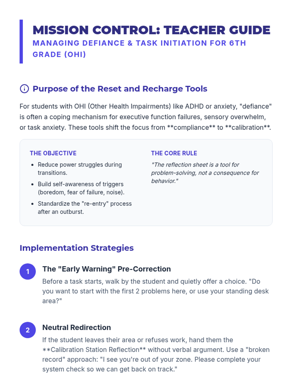 A comprehensive behavior intervention package designed for a 6th-grade student with ADHD to reduce impulsivity and suspensions. The materials provide a formal plan, a phased timeline for improvement, teacher response protocols, and student-facing tools for self-regulation.
