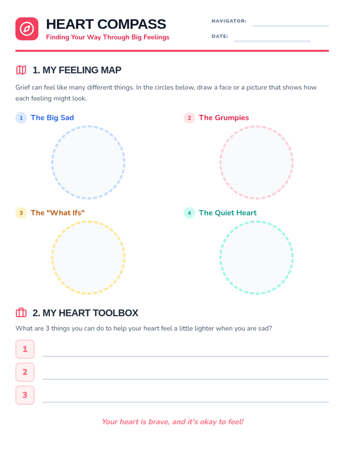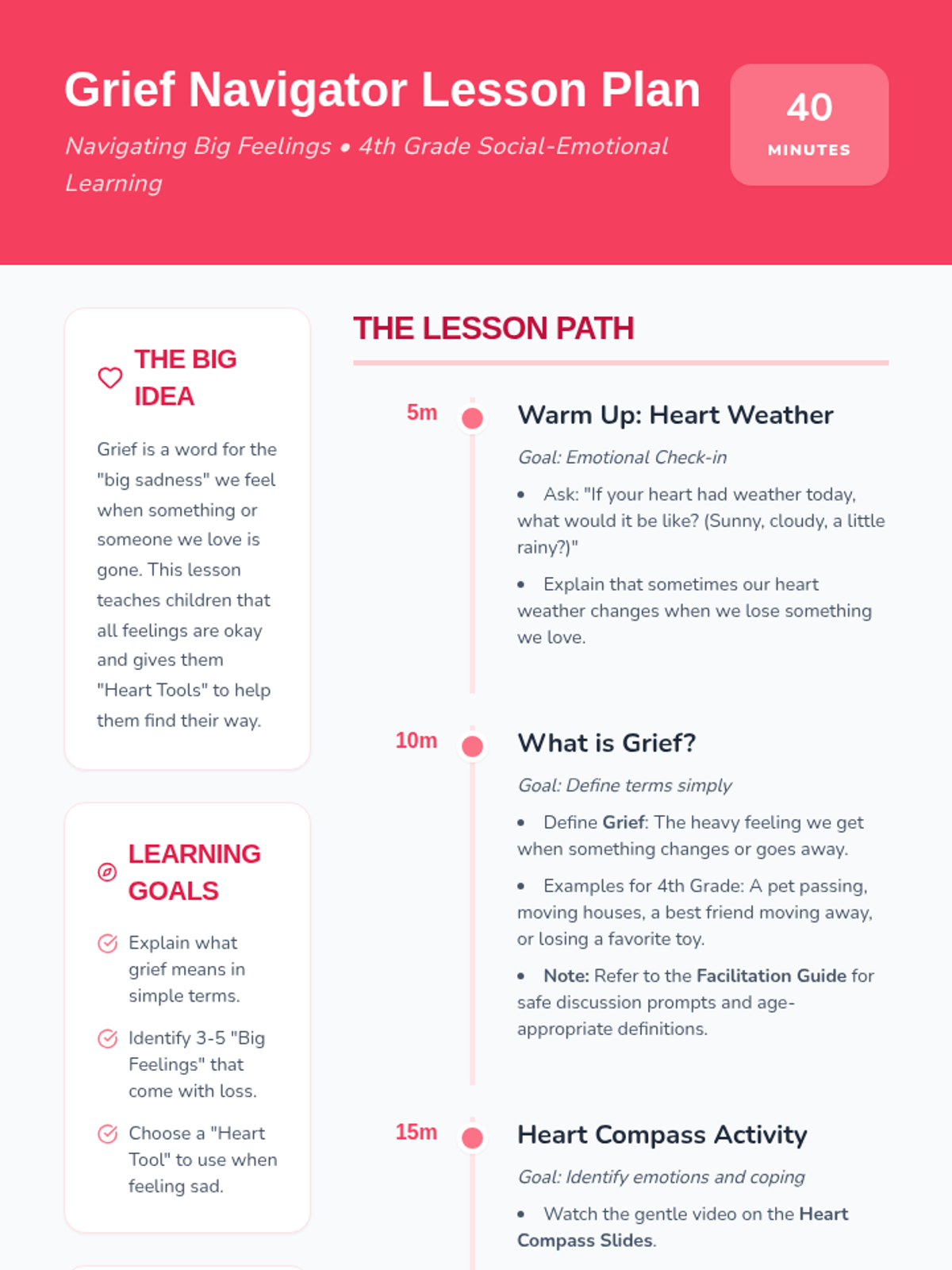 This lesson helps 4th-grade students understand the concept of grief and loss using the 'Heart Compass' framework. Students will learn to identify big feelings, understand that everyone grieves differently, and discover 'Heart Tools' for healthy coping.