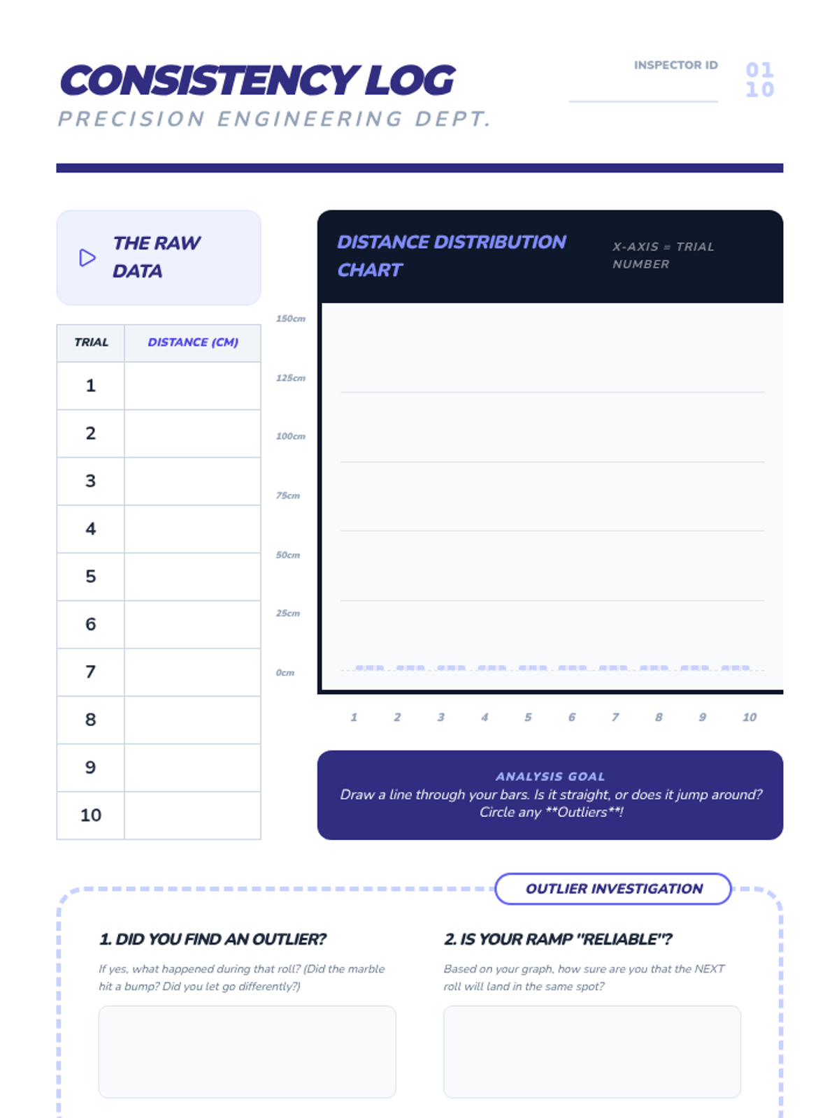 Students perform repeated trials on a mechanism (marble ramp) and graph the results to see if the performance is consistent or if there are outliers.