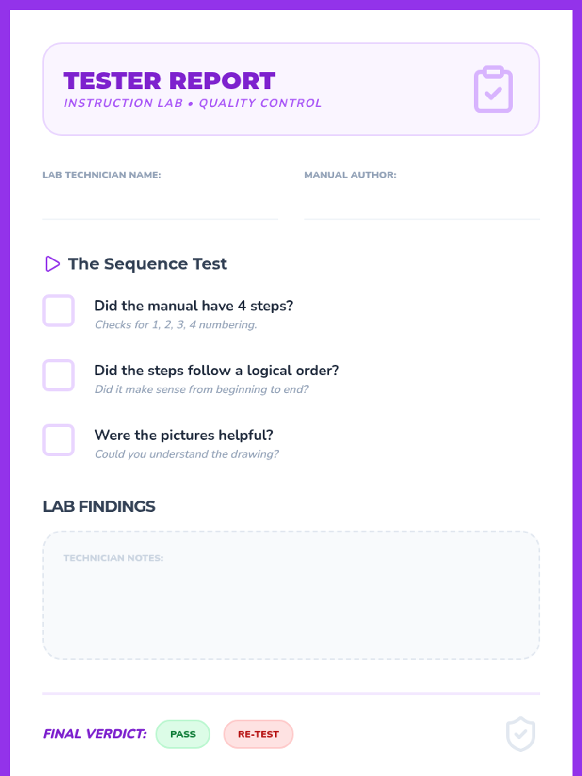 Students swap their guides and act as 'quality control testers' to see if their partner's instructions lead to the correct result.