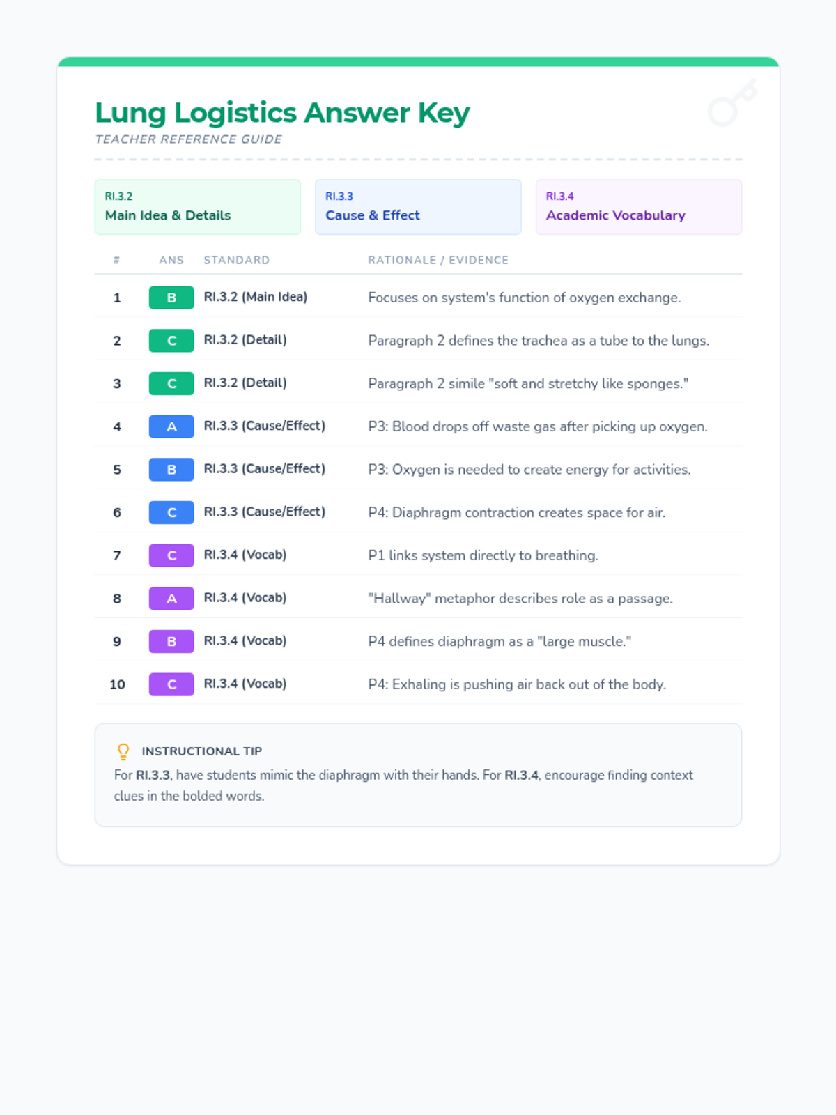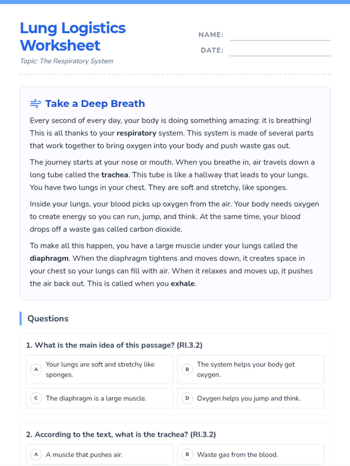 A reading comprehension lesson focused on the respiratory system, covering main idea, cause and effect, and academic vocabulary for third-grade students.