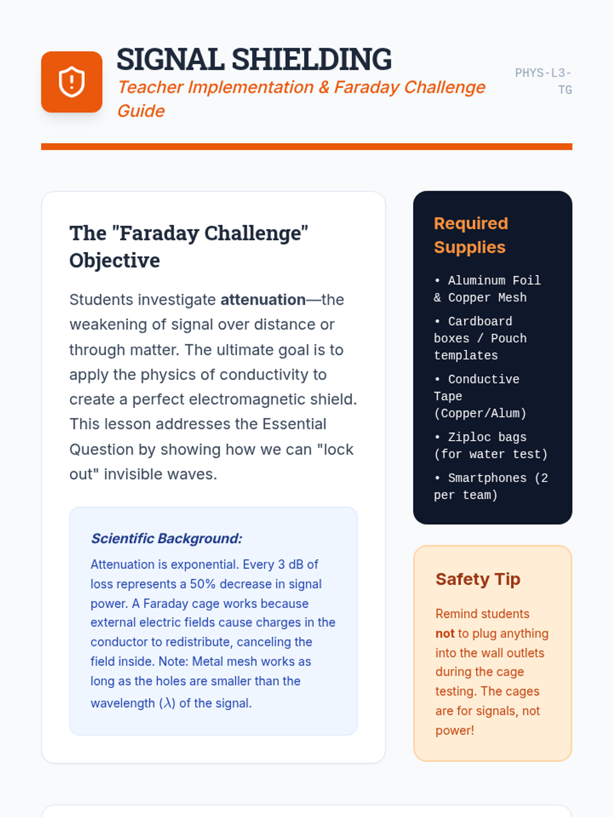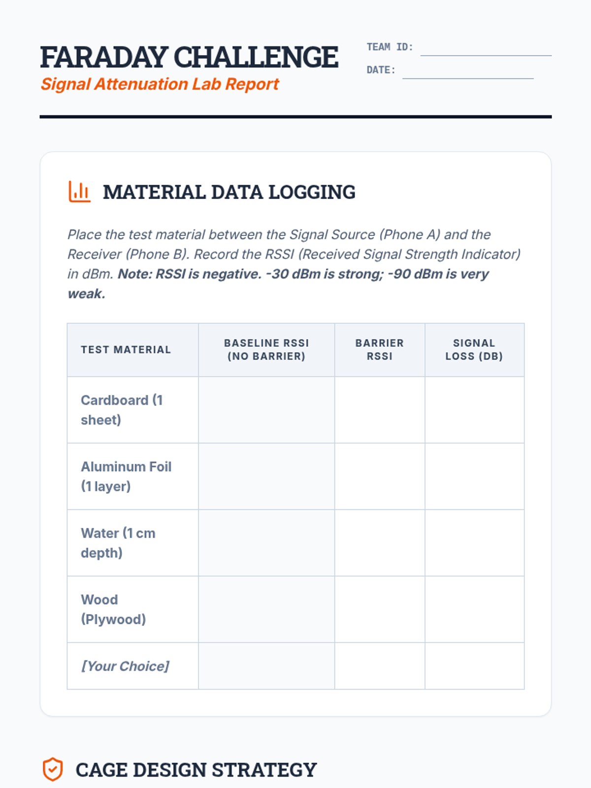 Teams test various materials for signal attenuation and build Faraday cages to shield devices from EM waves.