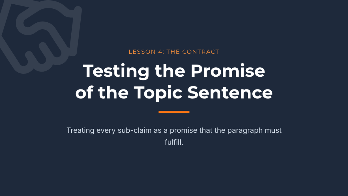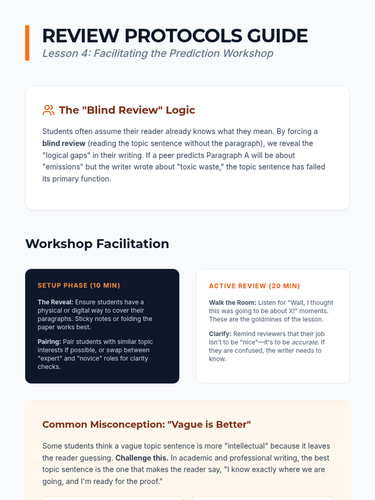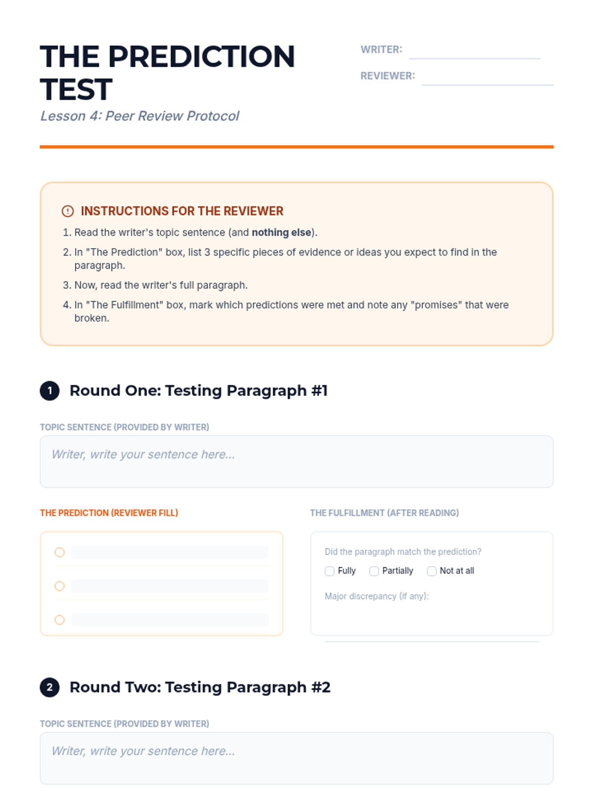 A peer-review workshop where students treat topic sentences as 'promises' to the reader, testing if the paragraph content fulfills the expectations set by the topic sentence.