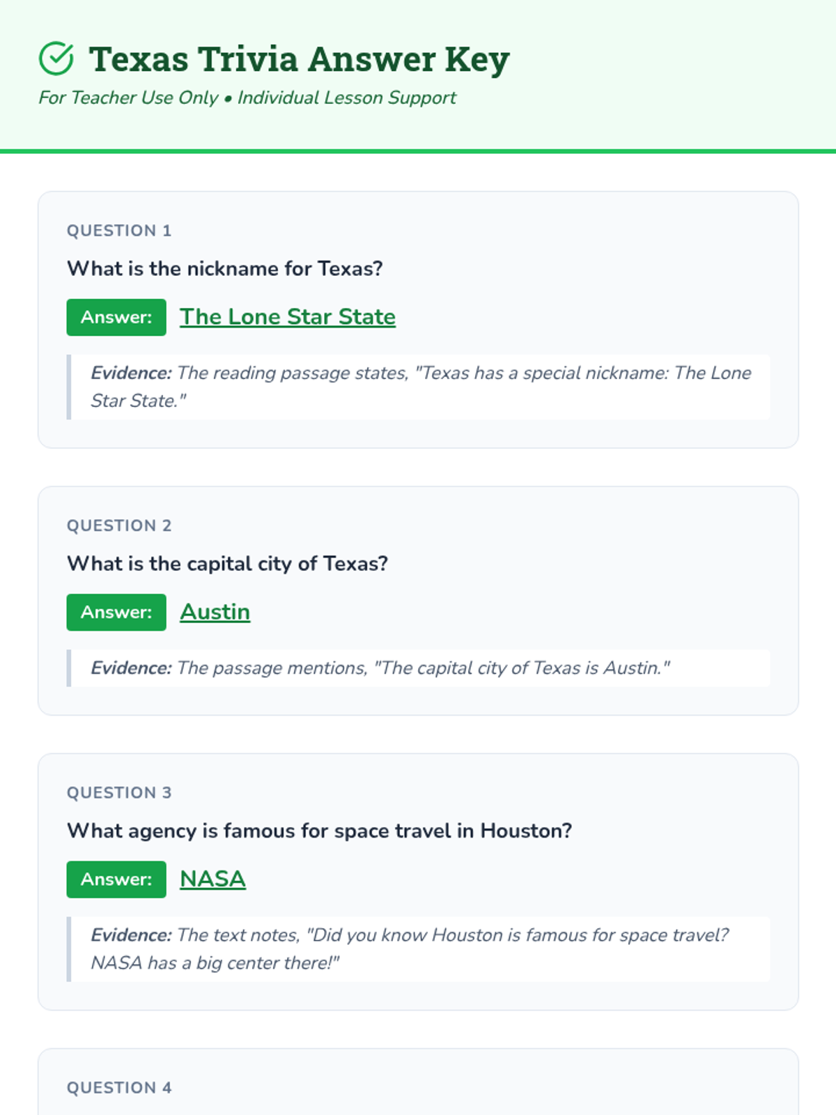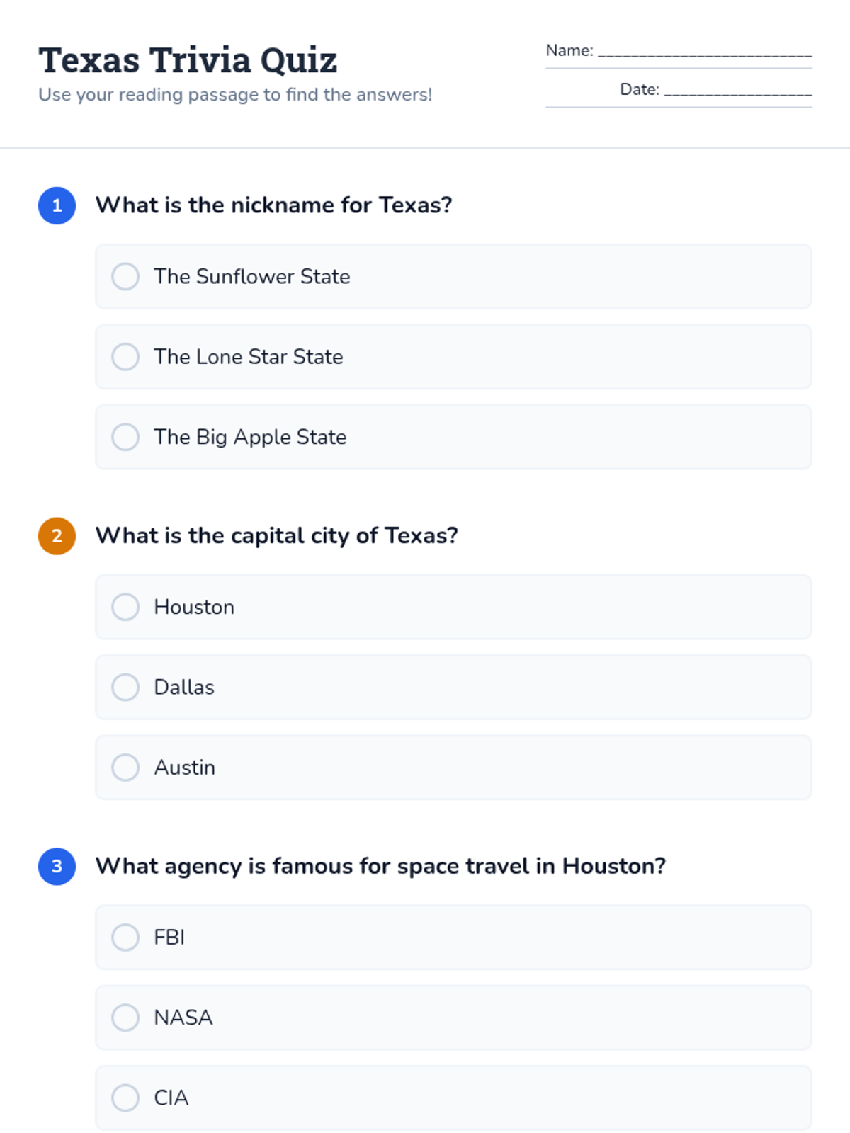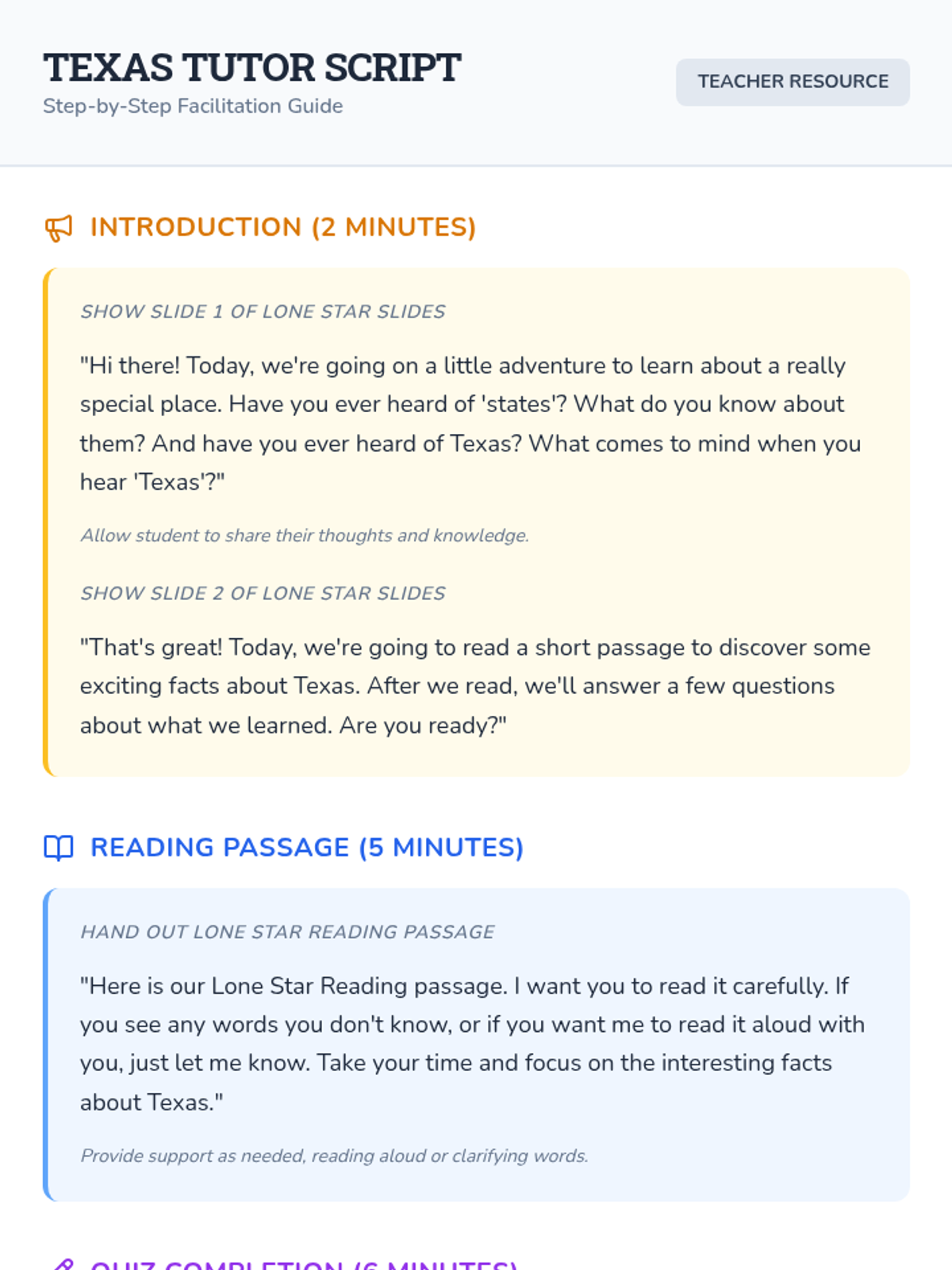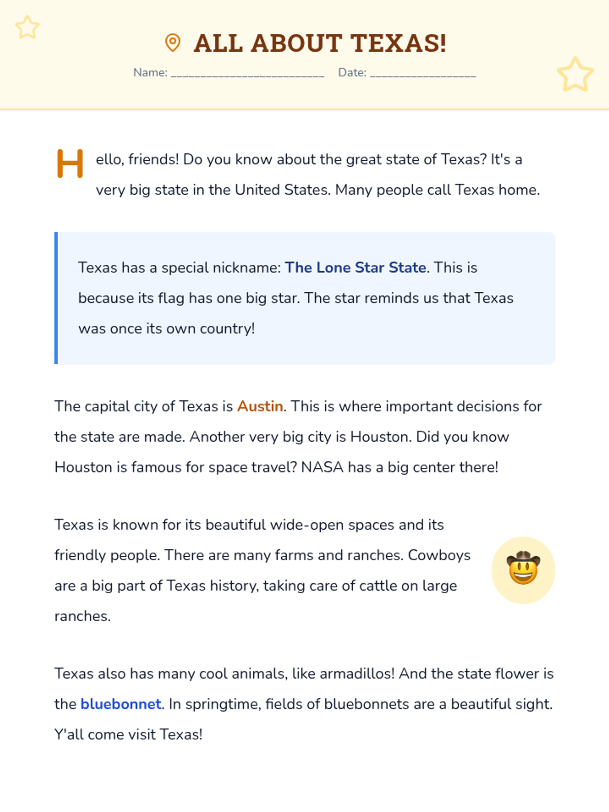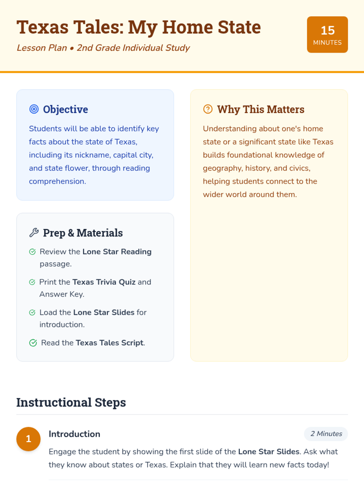 A 15-minute introductory lesson for 2nd-grade students about the geography, symbols, and history of Texas. Students will read a short passage and complete a comprehension quiz.