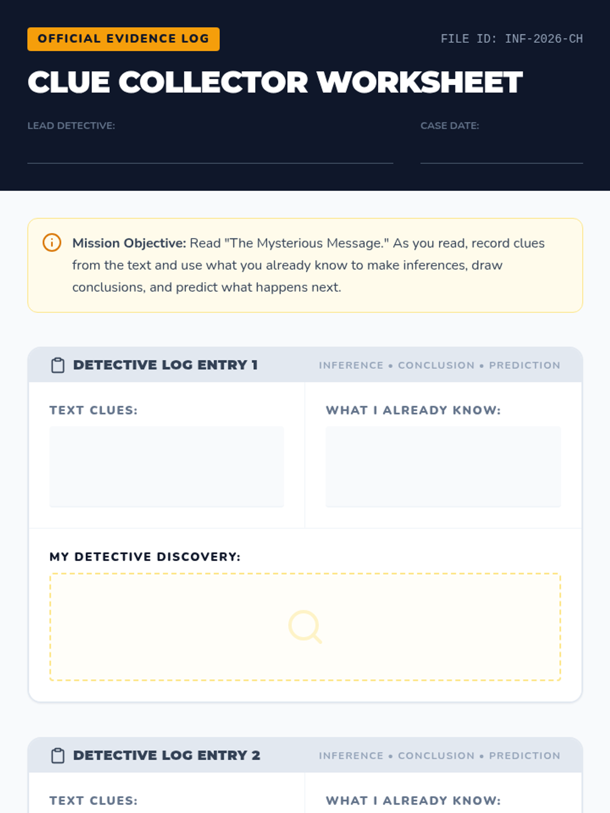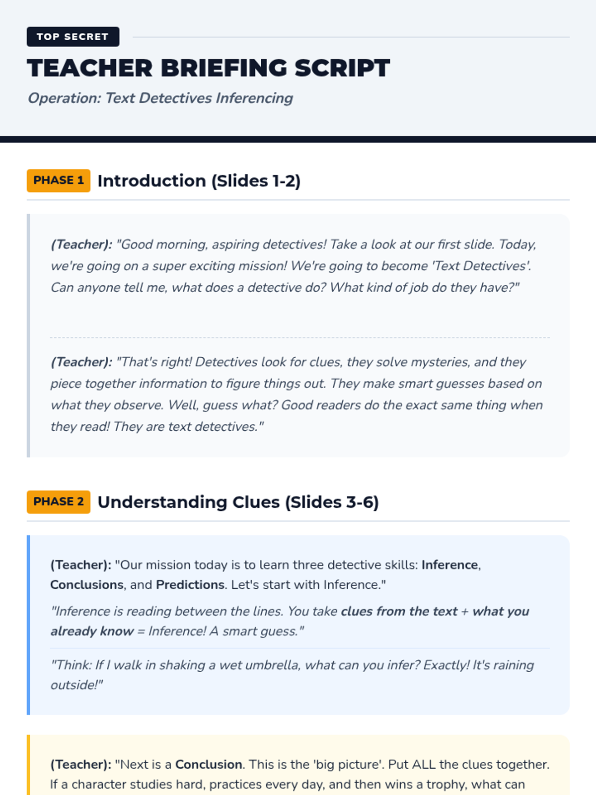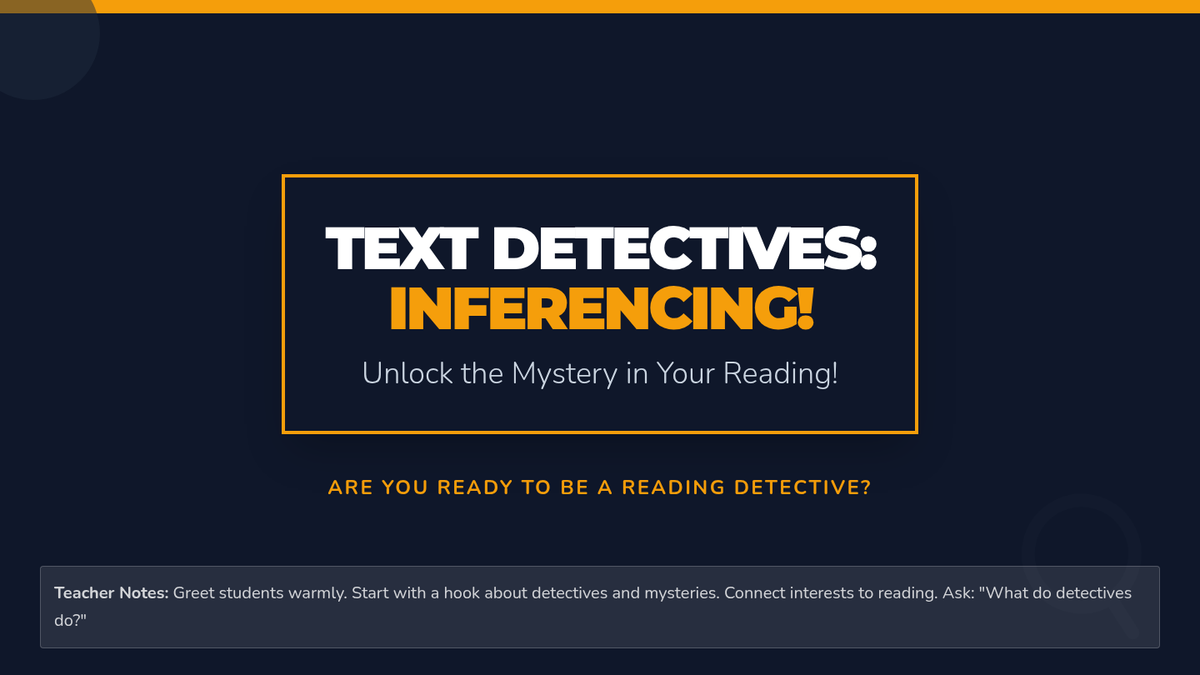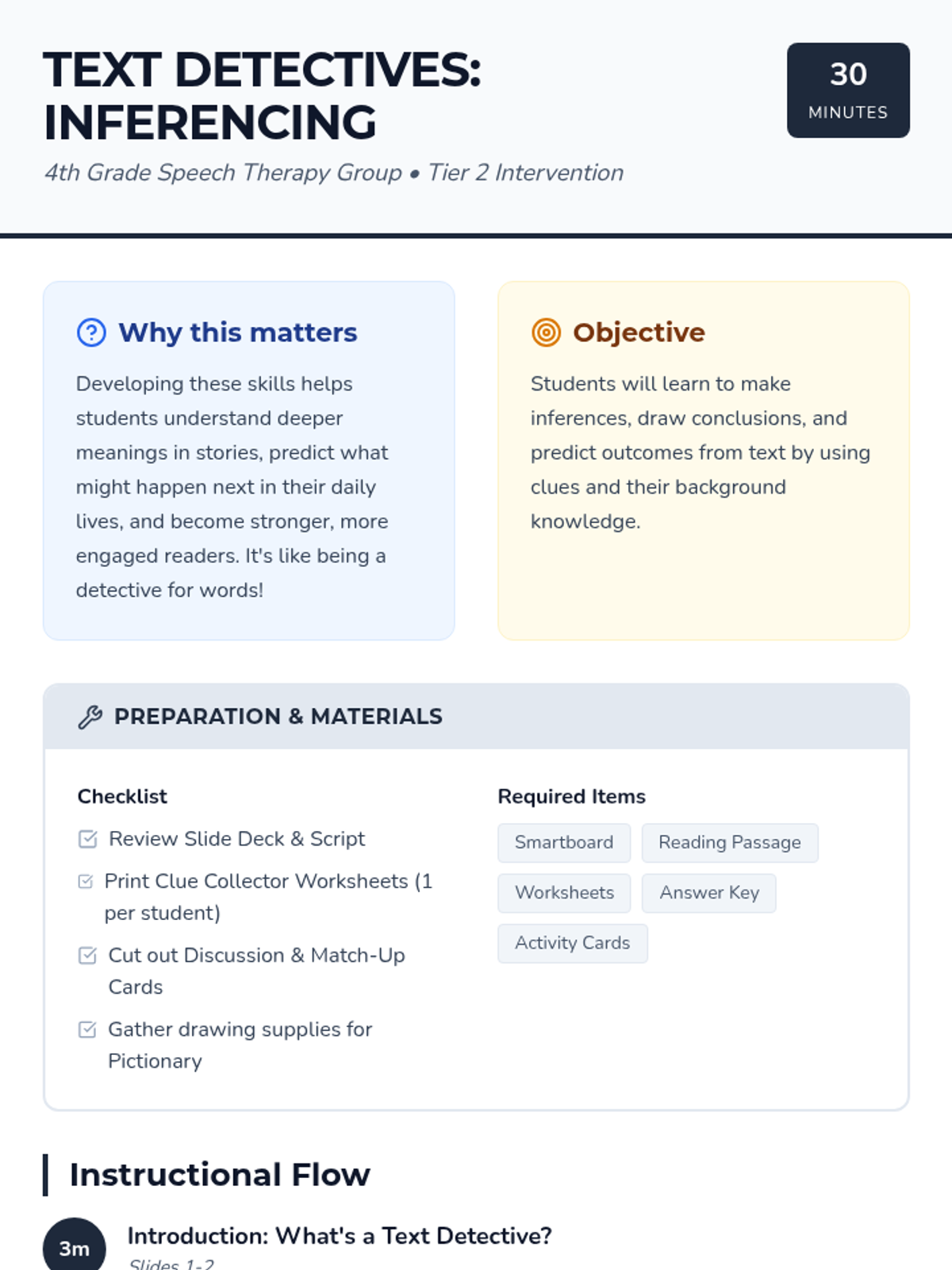 A 30-minute speech therapy lesson for 4th graders focused on building inference, conclusion, and prediction skills through a mystery-themed detective approach. Students use text clues and background knowledge to solve 'The Mysterious Message'.