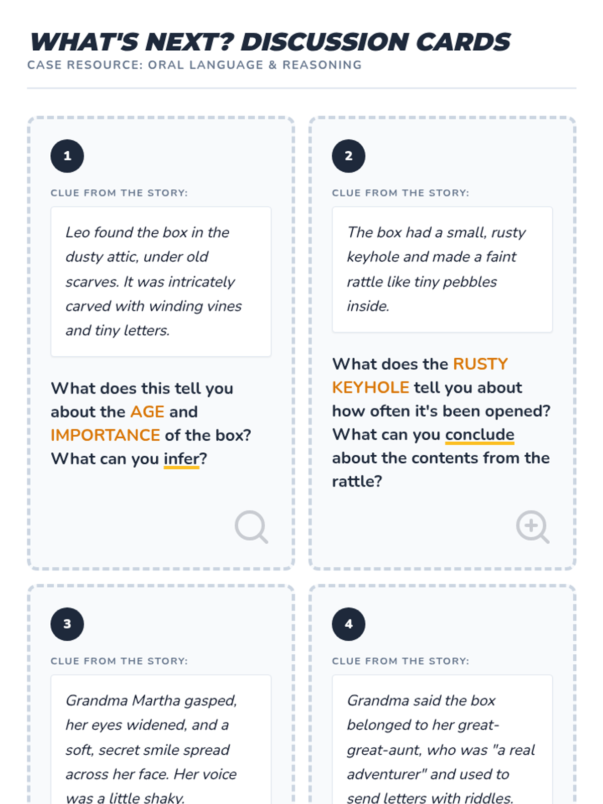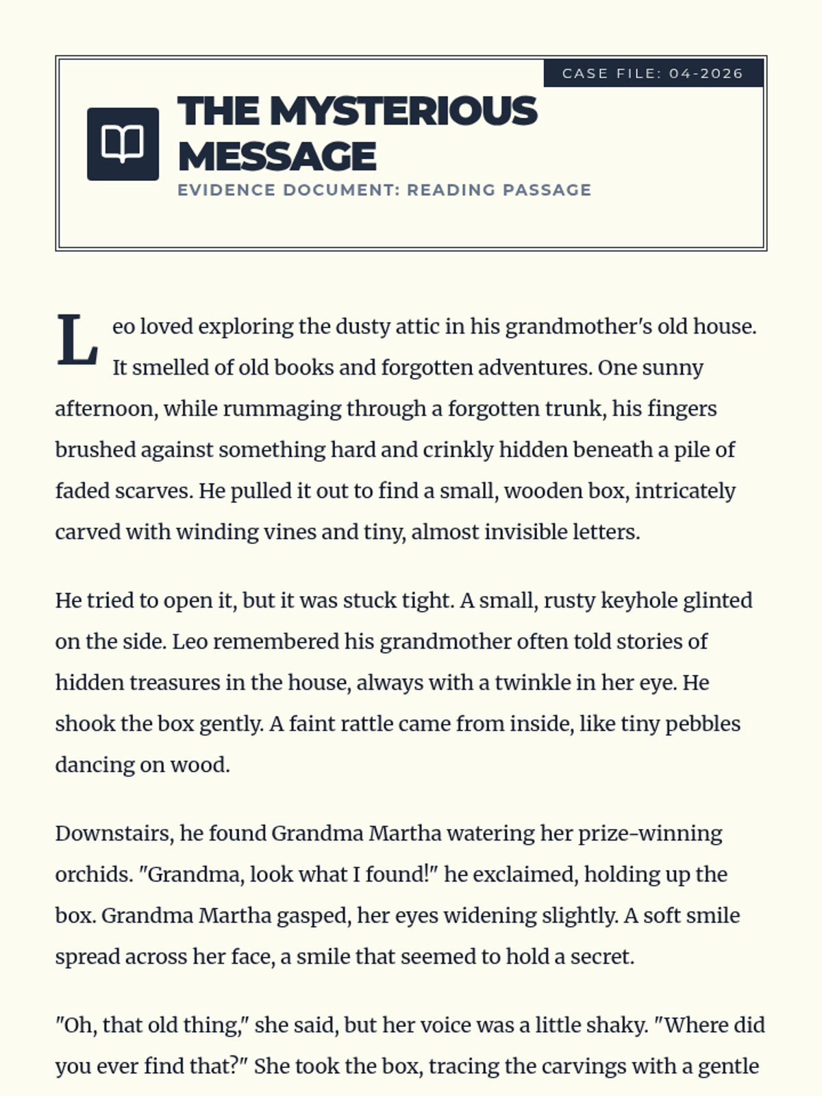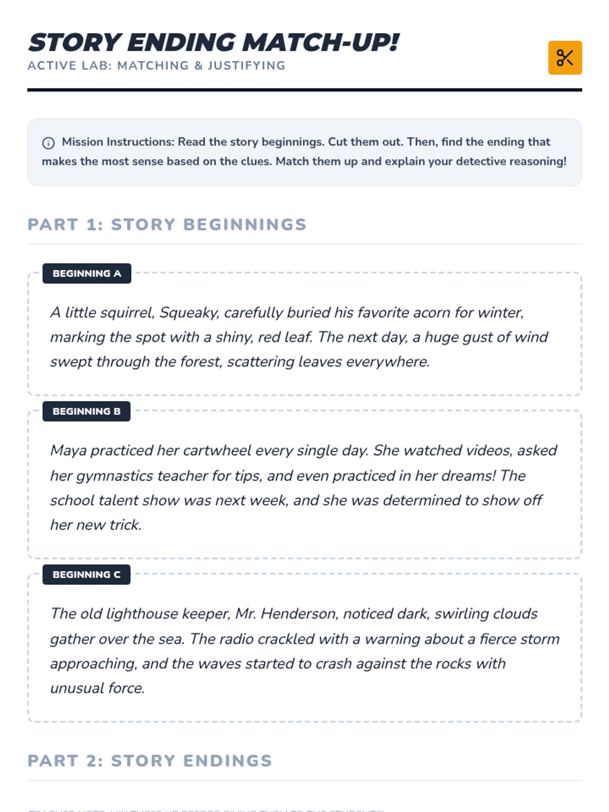 A lesson focused on narrative sequencing and logical flow through the lens of mystery and suspense stories. Students analyze transition words, cause and effect, and character development to reorder scrambled narratives.