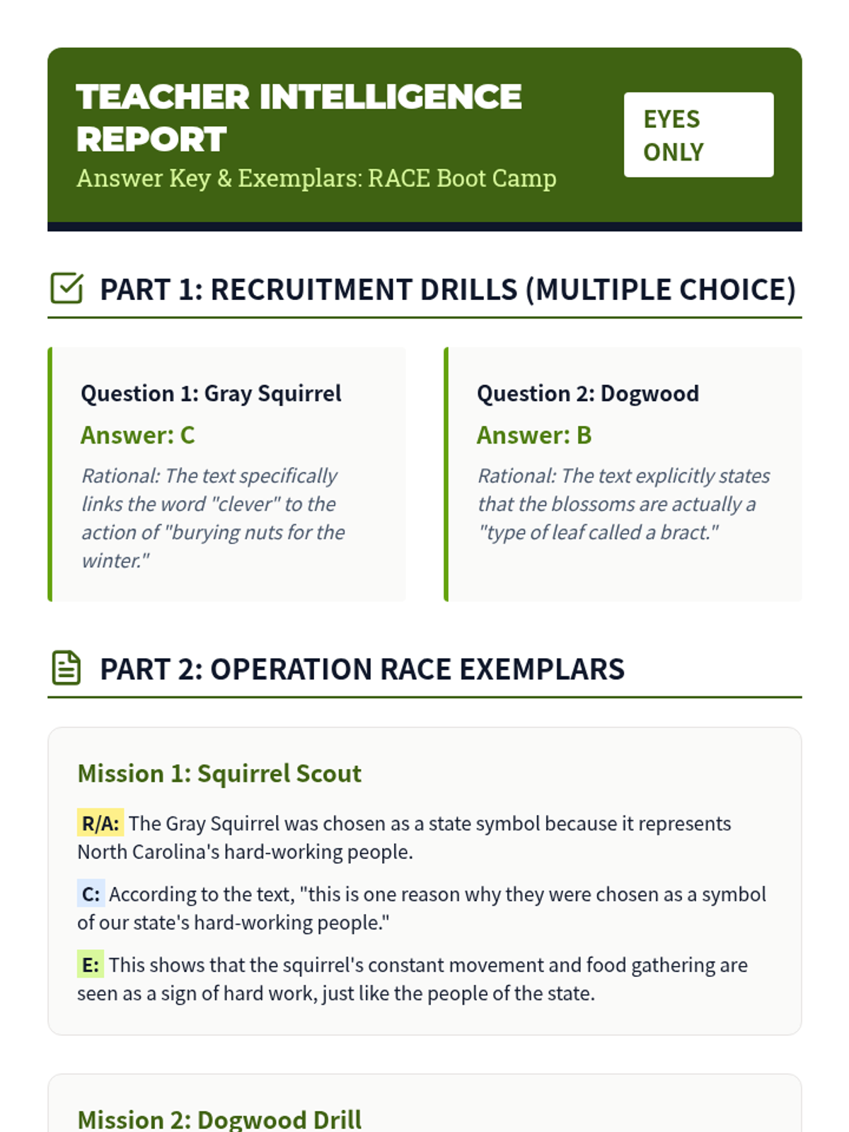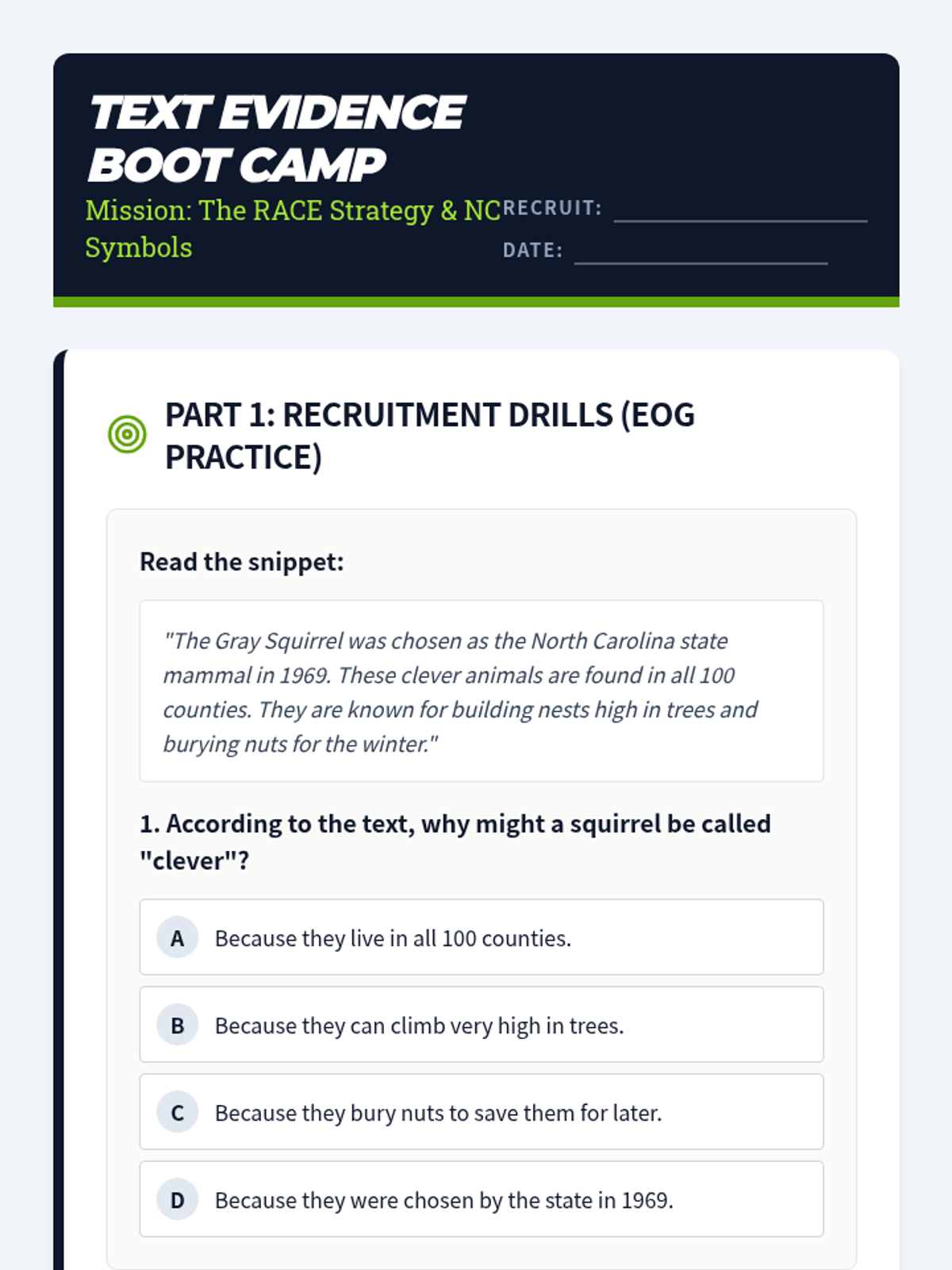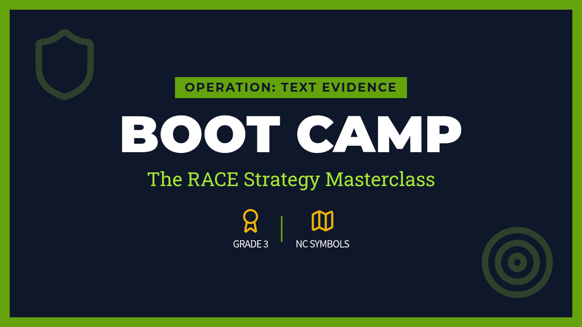 A high-energy 'Boot Camp' themed lesson where 3rd graders master the RACE strategy (Restate, Answer, Cite, Explain) using informational texts about North Carolina's state symbols. The lesson includes scaffolded practice to move students from guided support to independent mastery.
