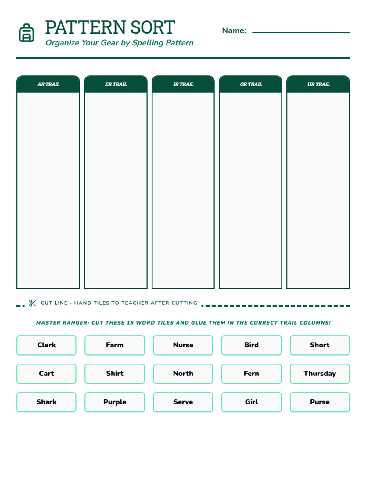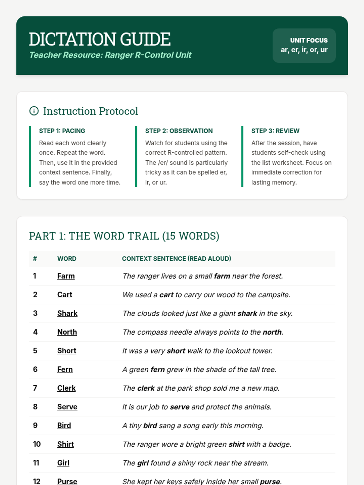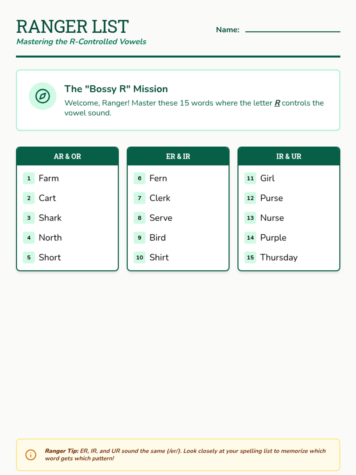 A comprehensive spelling packet focused on R-controlled vowels (ar, er, ir, or, ur) with a Forest Ranger theme. Includes practice, games, and assessments.