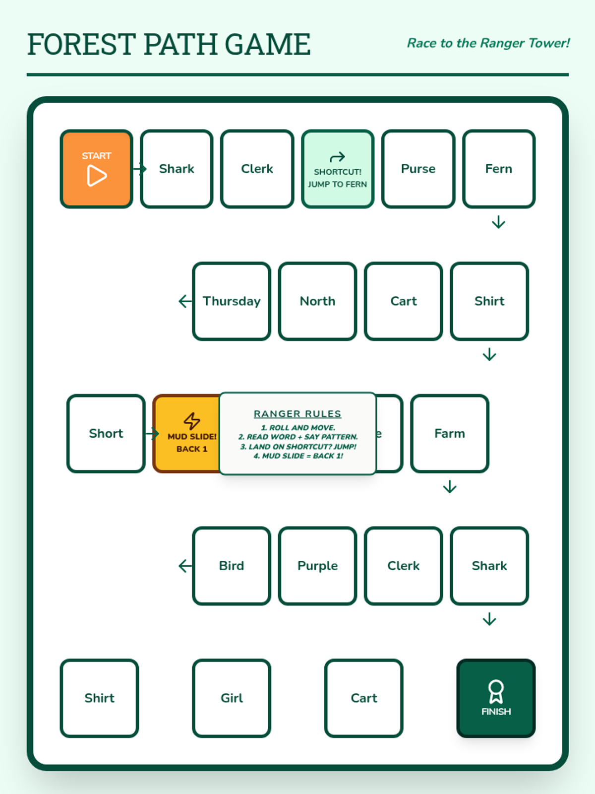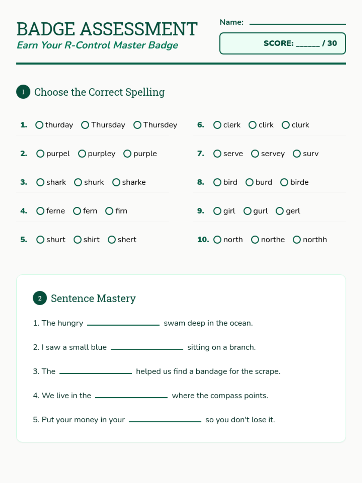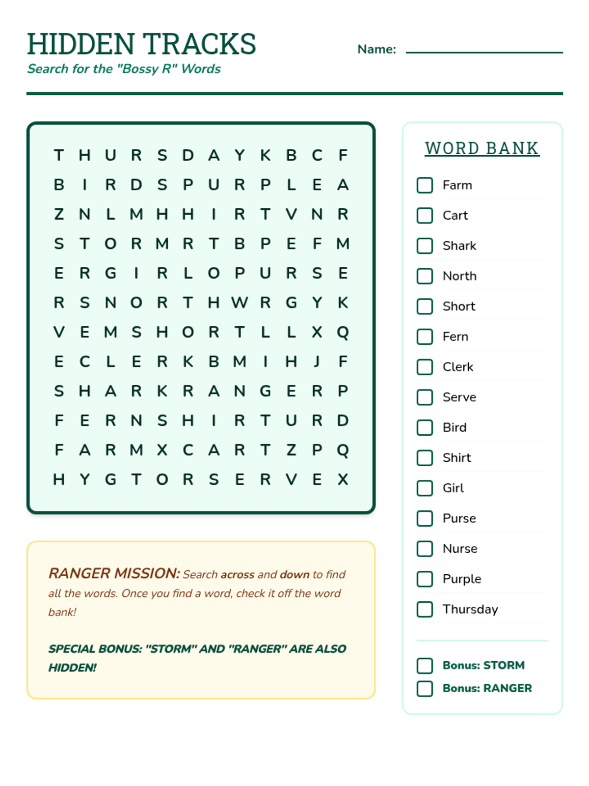 A comprehensive spelling packet focused on R-controlled vowels (ar, er, ir, or, ur) with a Forest Ranger theme. Includes practice, games, and assessments.