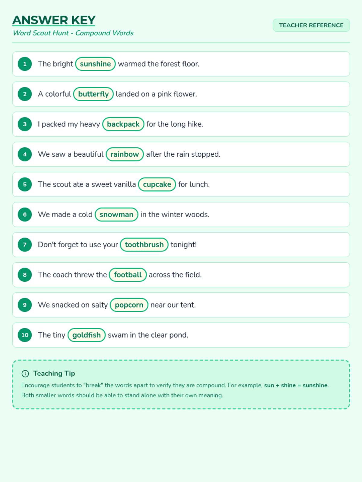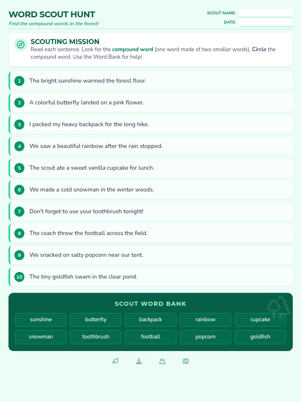 A primary-level lesson focused on identifying and understanding compound words through a nature-themed scouting activity.