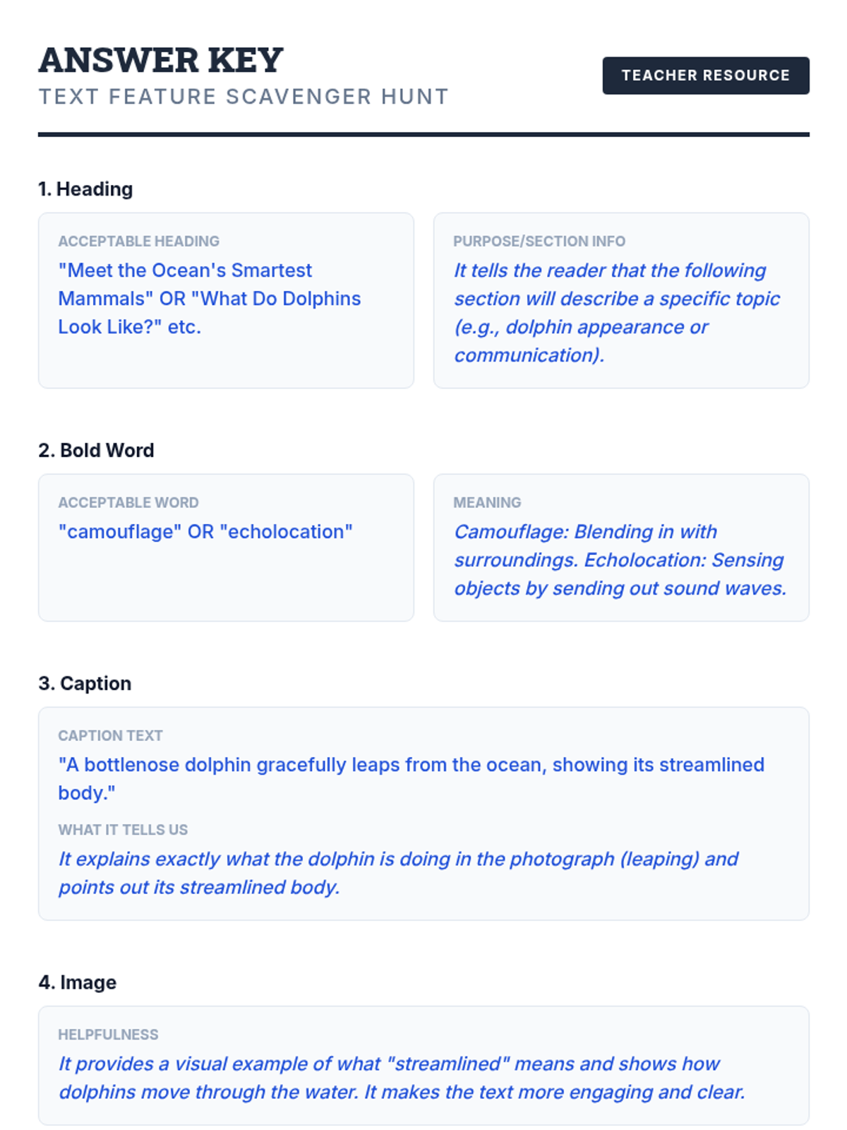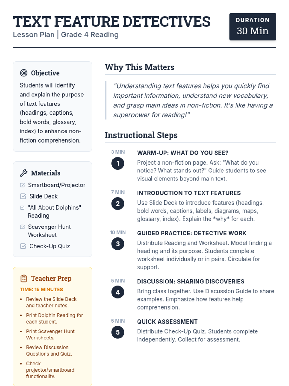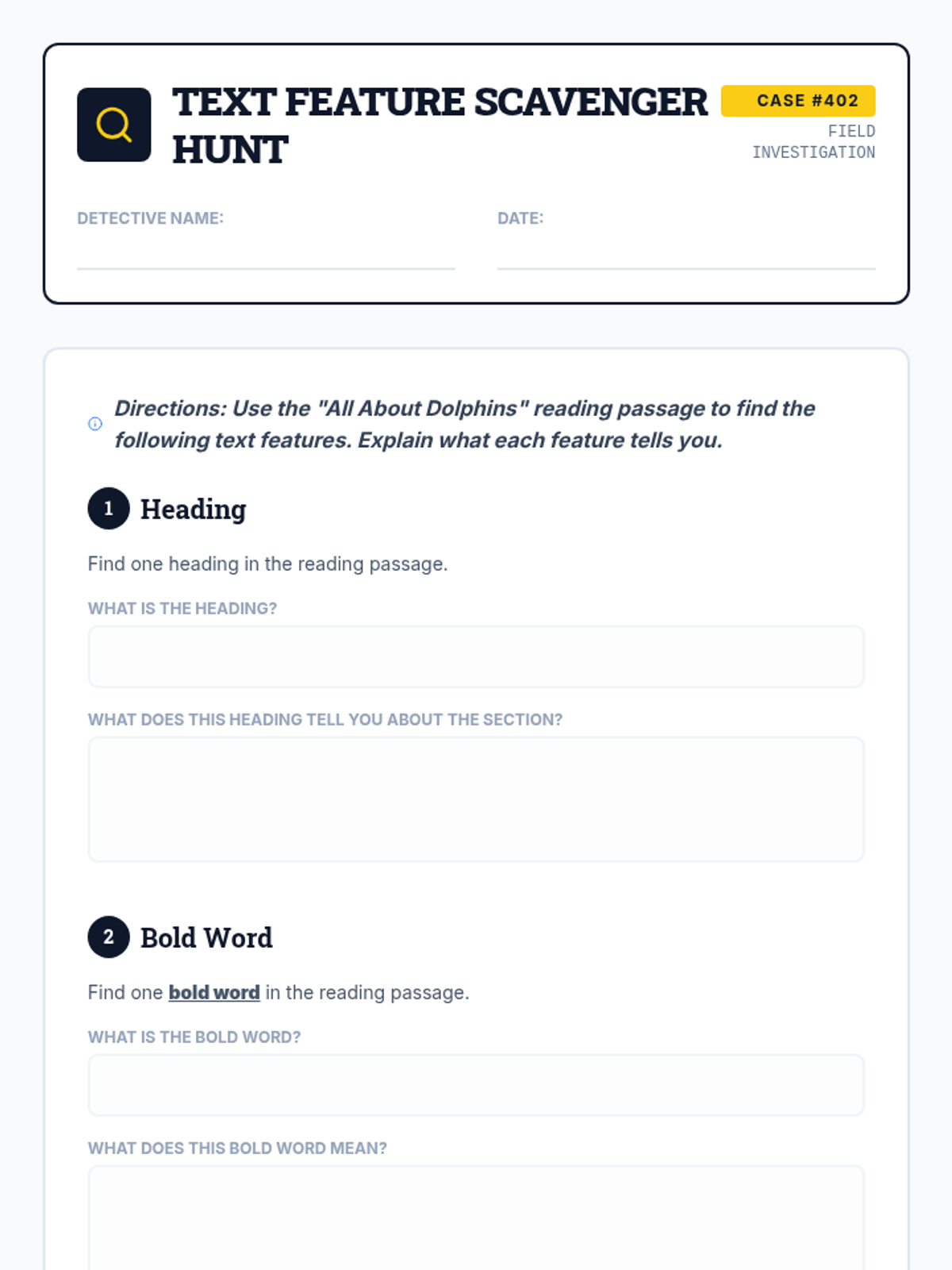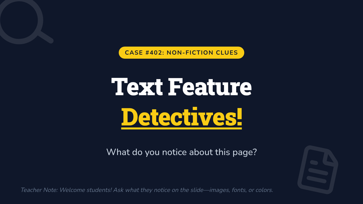 A 30-minute introductory lesson for 4th graders on identifying and using non-fiction text features like headings, captions, and glossaries to improve comprehension. Students act as 'detectives' to hunt for clues in a text about dolphins.