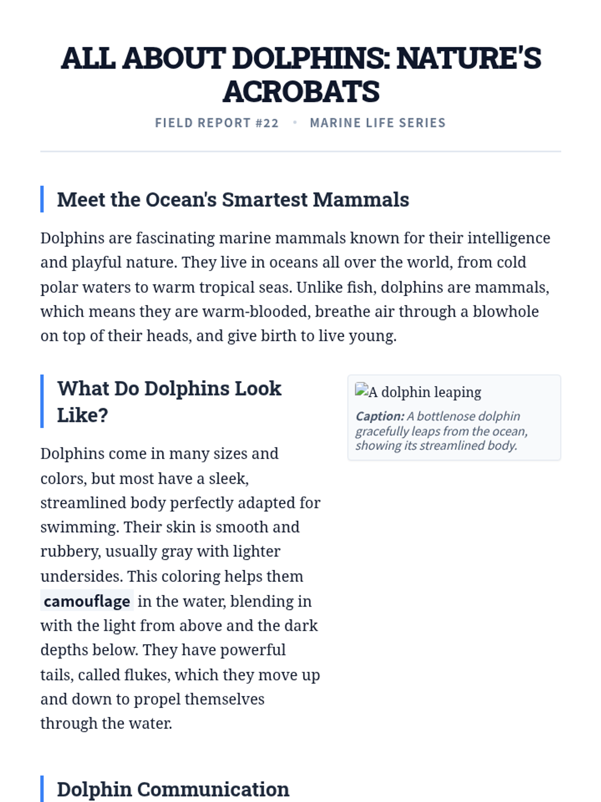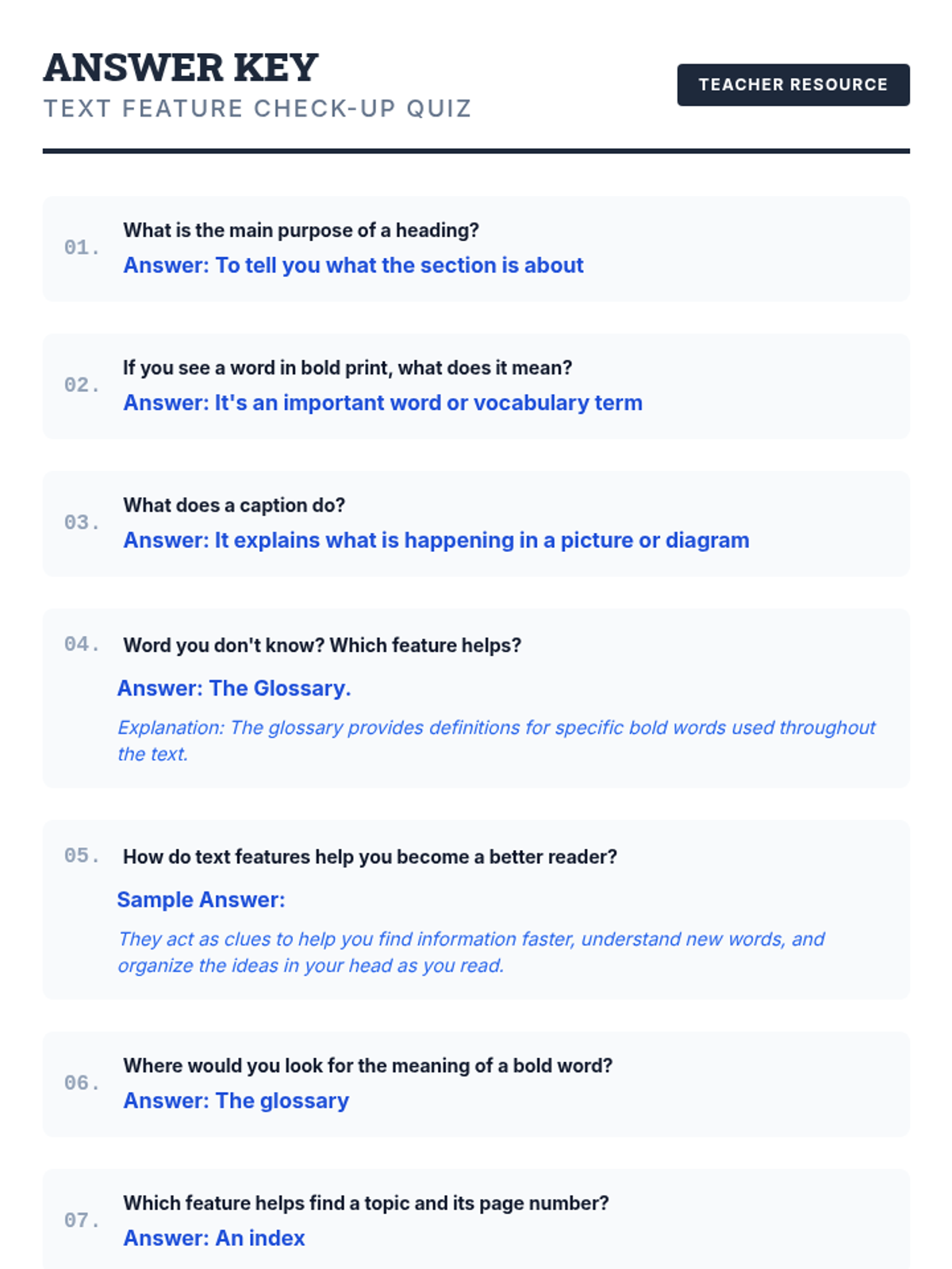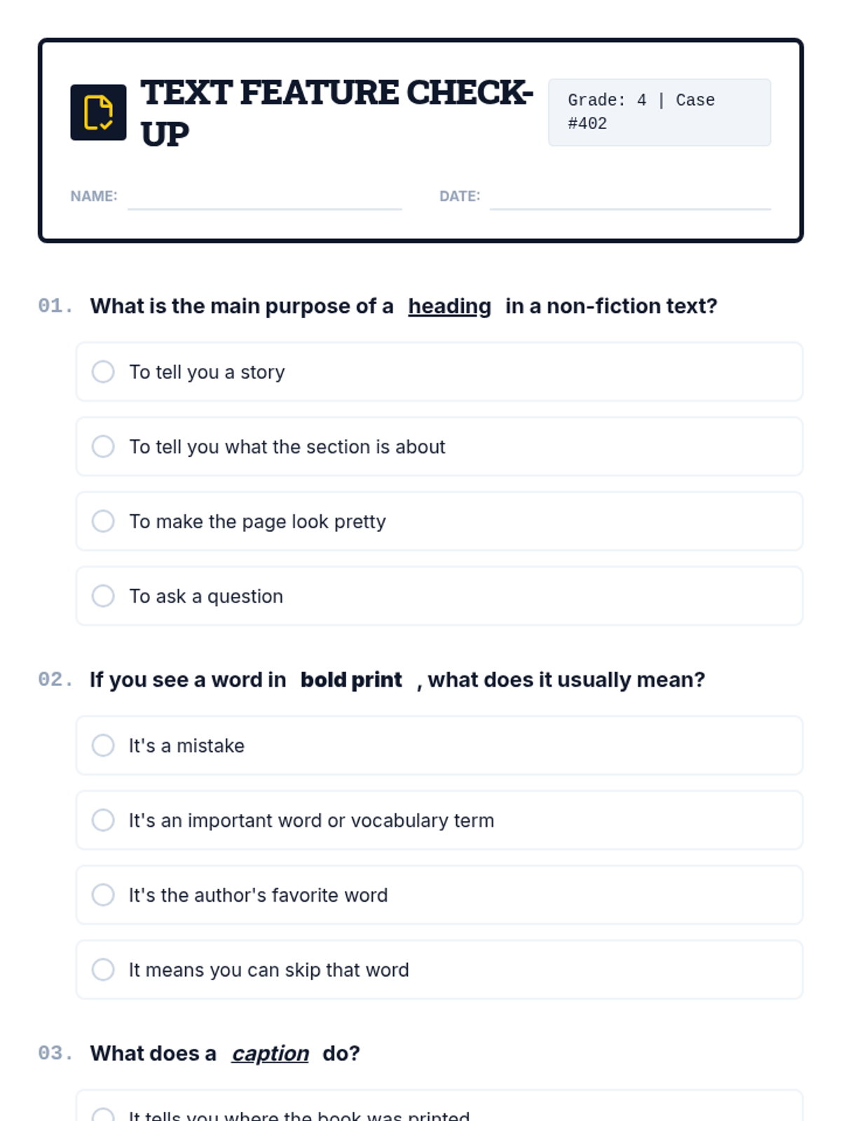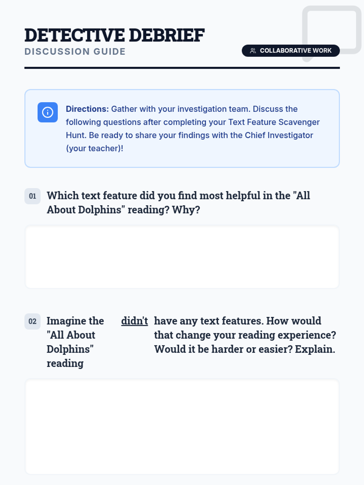 A 30-minute introductory lesson for 4th graders on identifying and using non-fiction text features like headings, captions, and glossaries to improve comprehension. Students act as 'detectives' to hunt for clues in a text about dolphins.