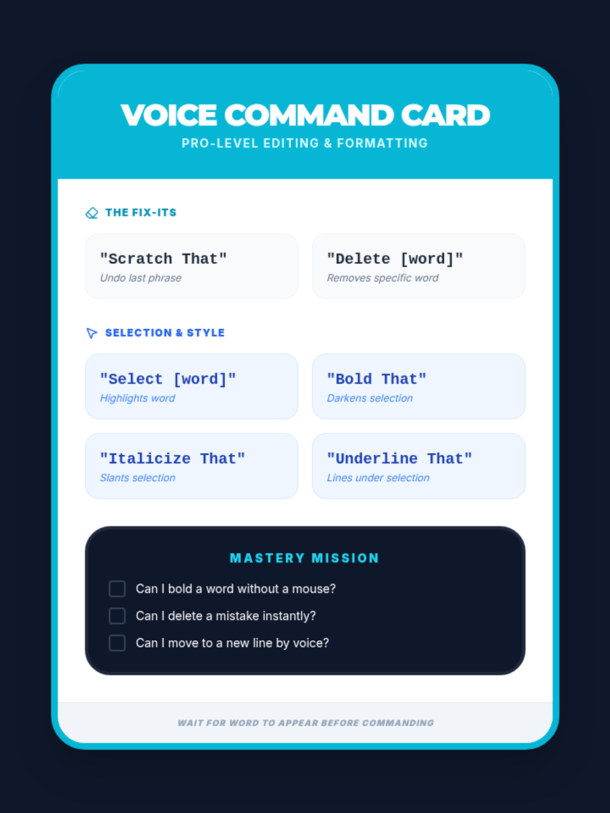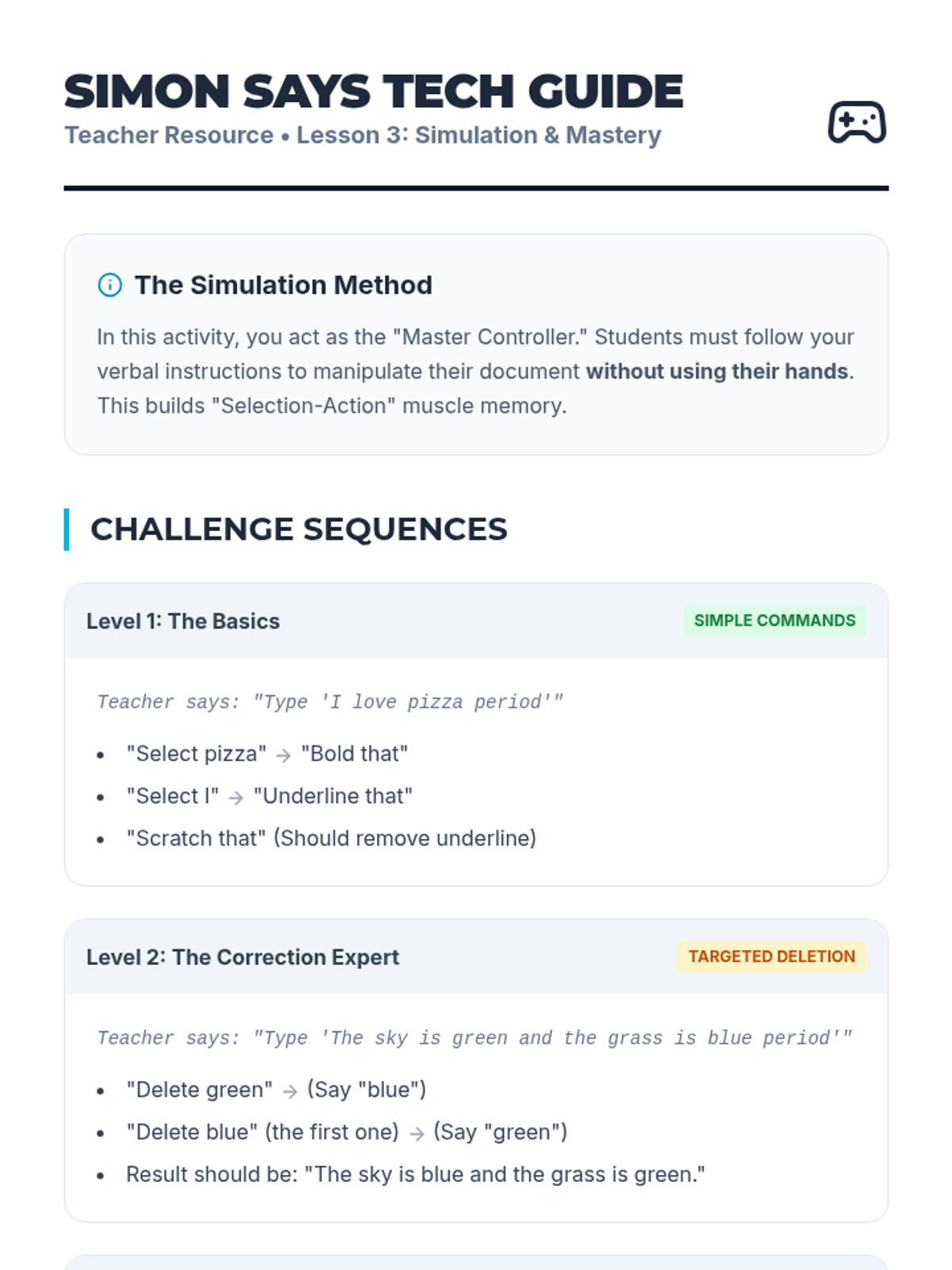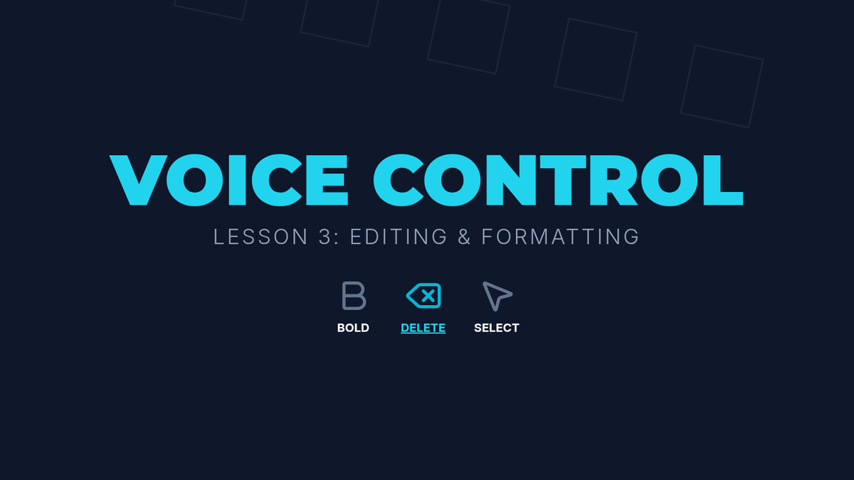 This lesson introduces editing commands such as 'select that', 'bold', 'delete', and 'scratch that'. Students navigate a document and make changes without touching the keyboard or mouse.