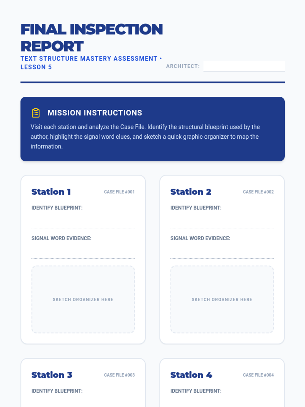 Students rotate through stations featuring unidentified texts to identify structure, justify with evidence, and create graphic organizers.