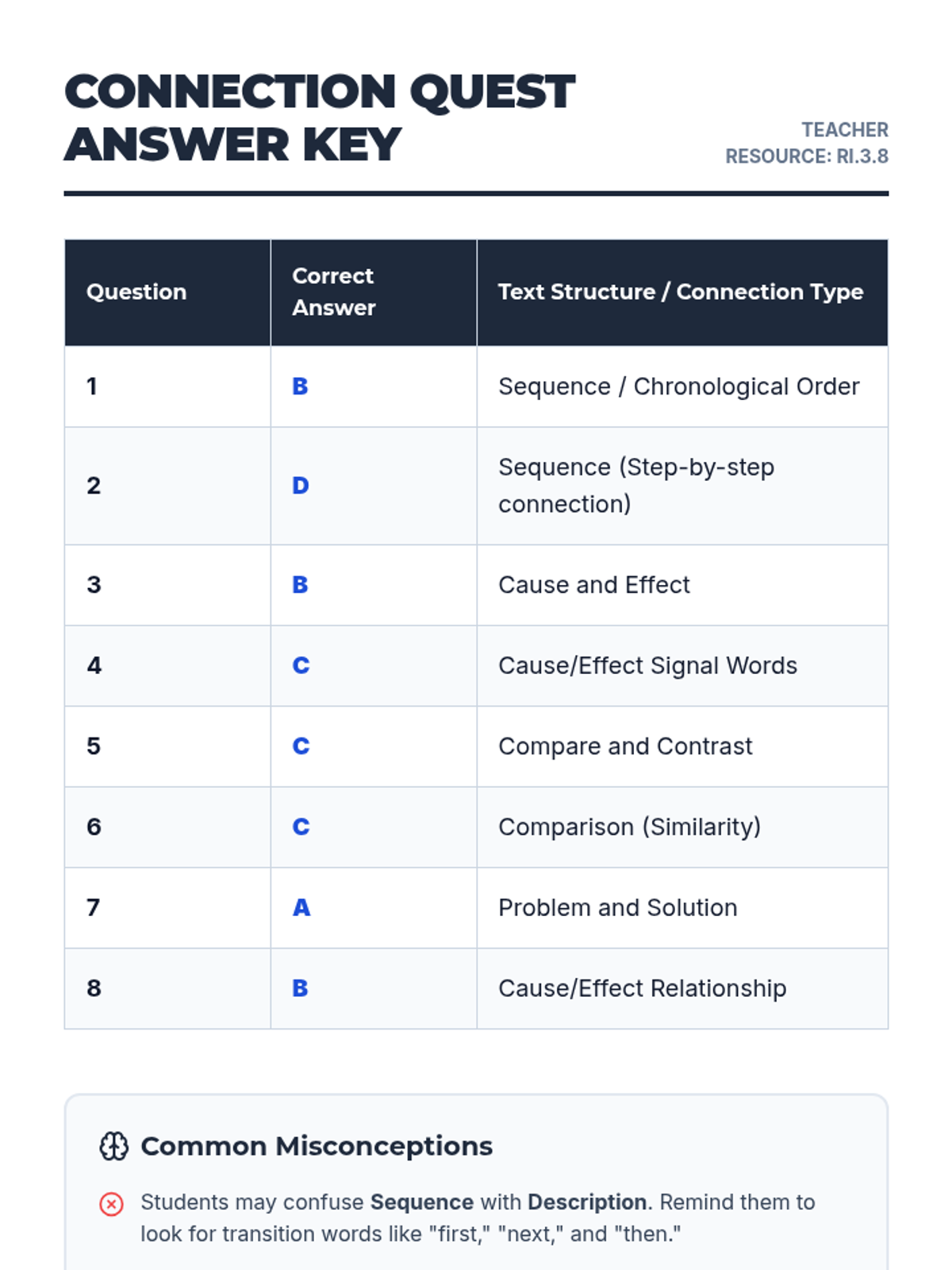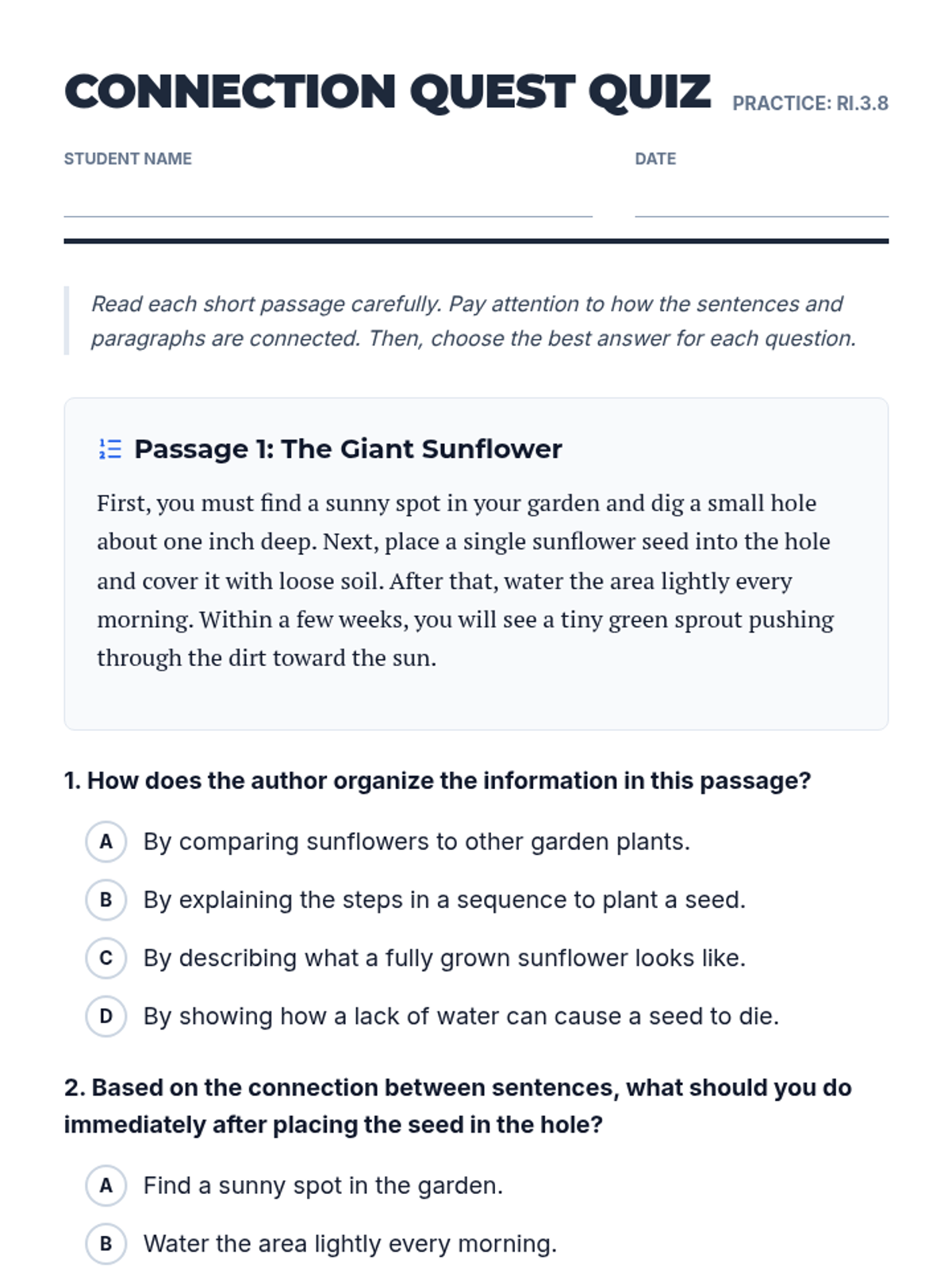 A focused practice lesson on RI.3.8, helping students identify logical connections in nonfiction texts through short passages and EOG-style questions.