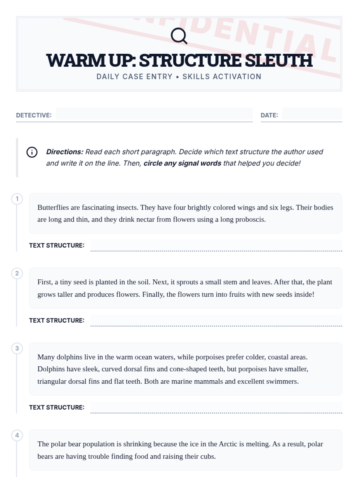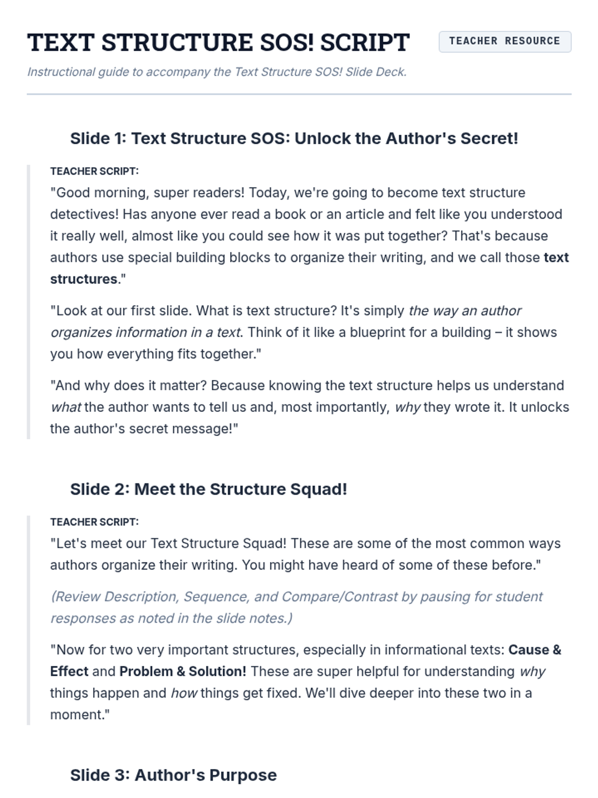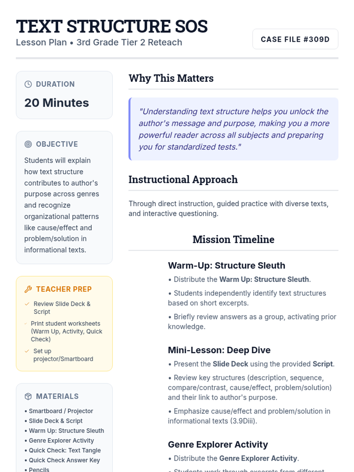 A 30-minute Tier 2 reteach lesson for 3rd graders focused on mastering text structures (especially cause/effect and problem/solution) and how they contribute to an author's purpose across genres. Students engage in detective-themed activities to identify organizational patterns and signal words.