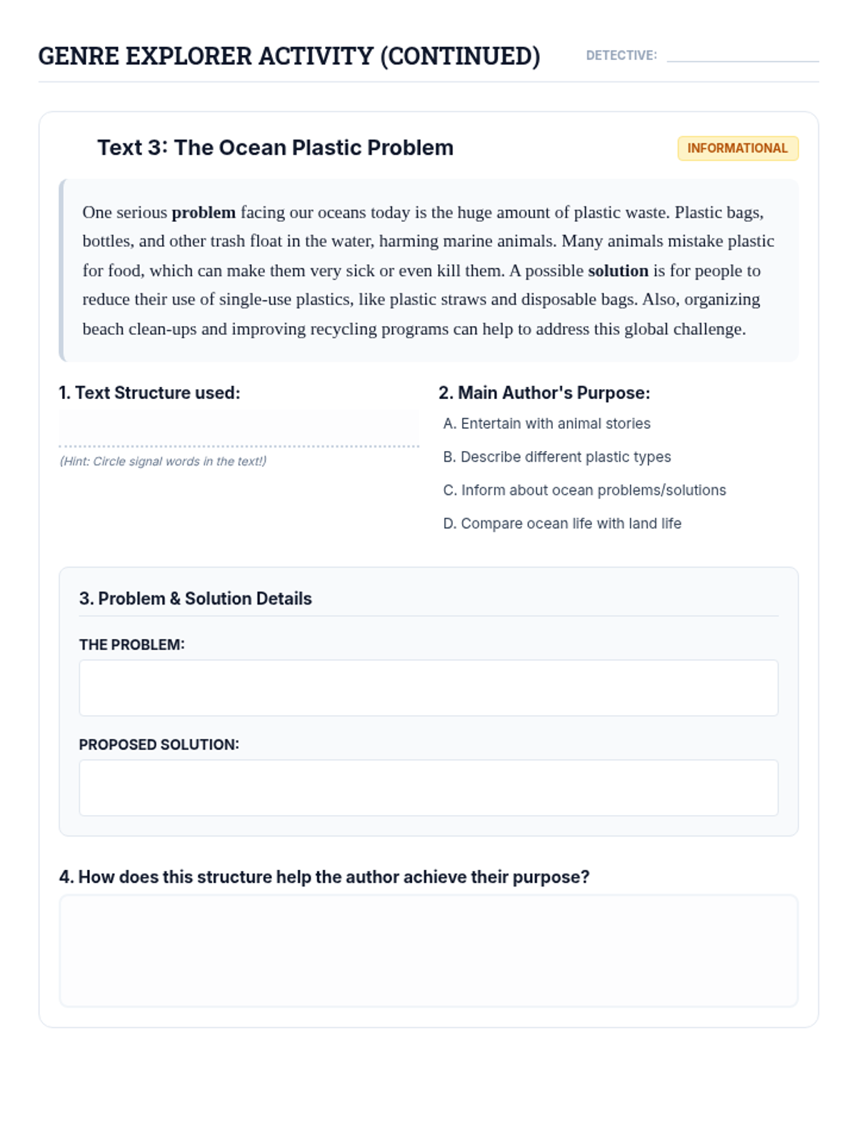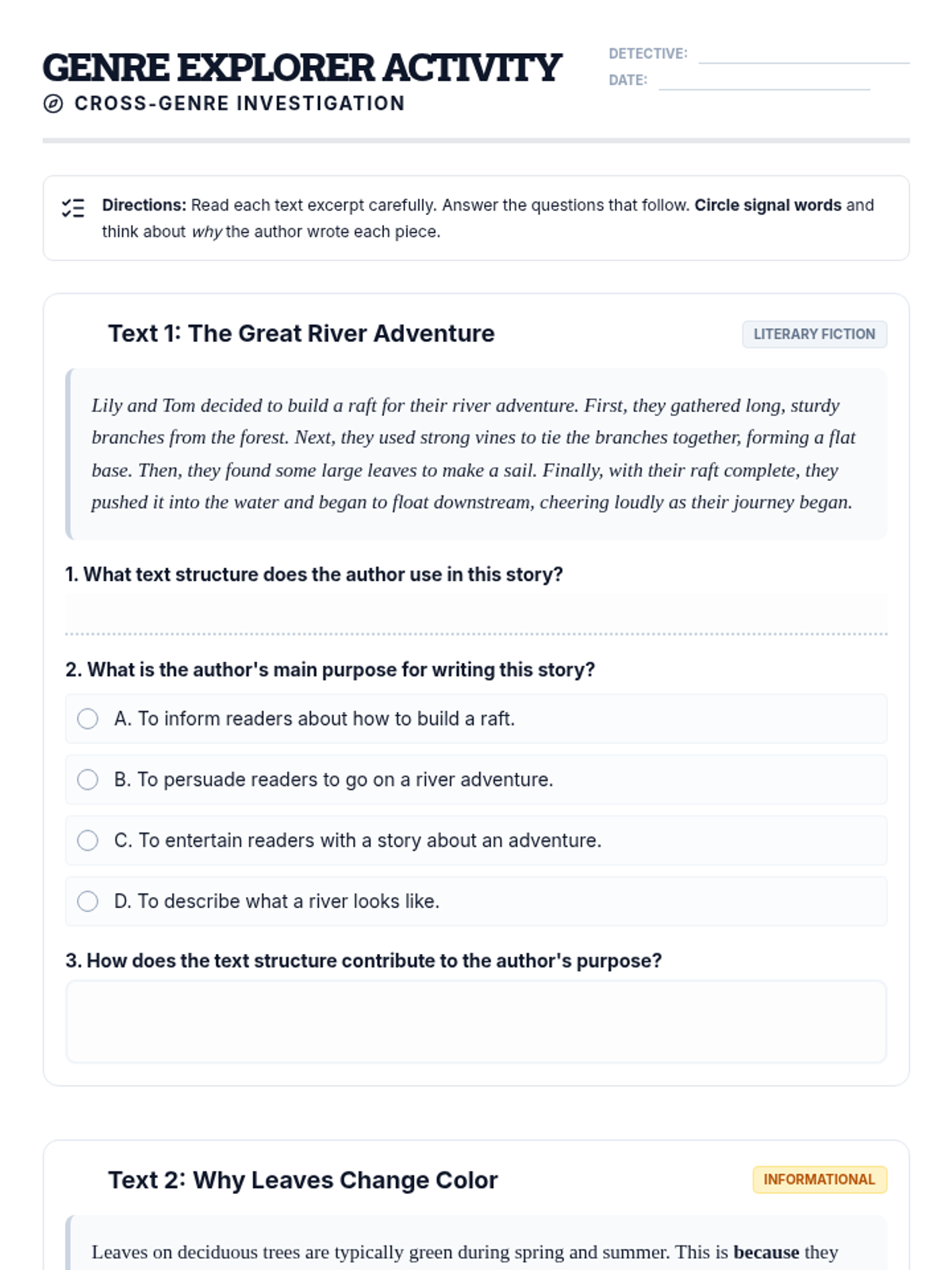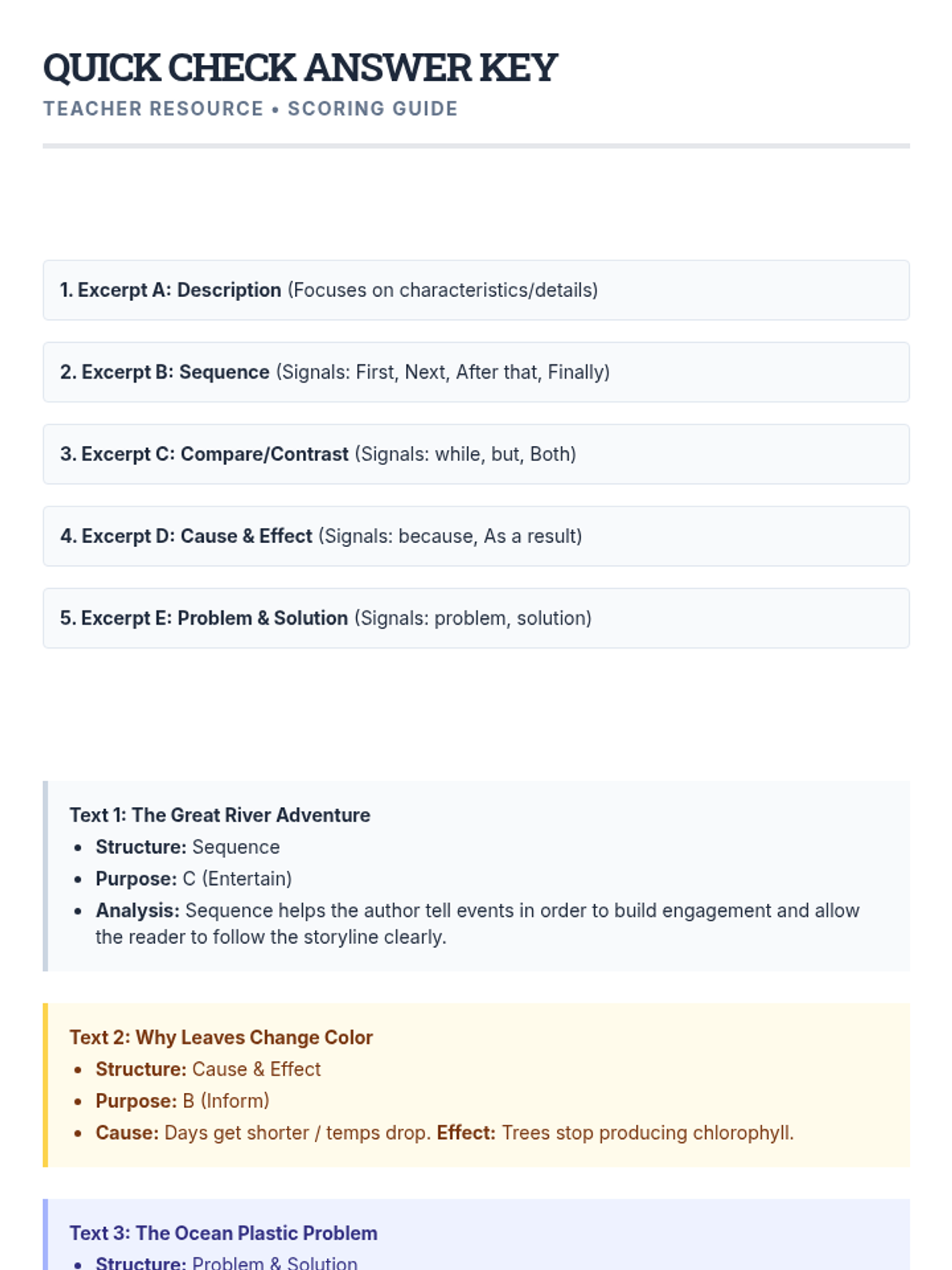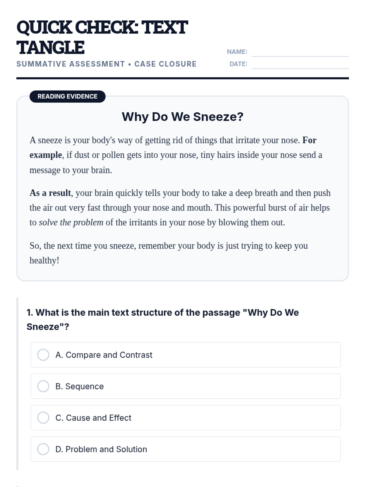 A 30-minute Tier 2 reteach lesson for 3rd graders focused on mastering text structures (especially cause/effect and problem/solution) and how they contribute to an author's purpose across genres. Students engage in detective-themed activities to identify organizational patterns and signal words.