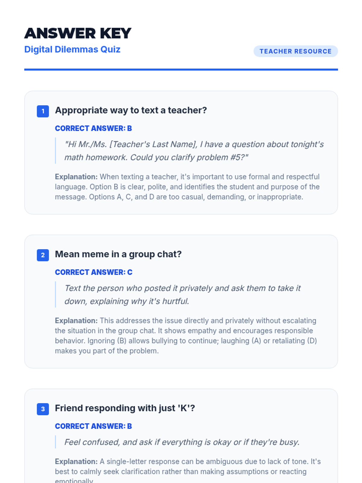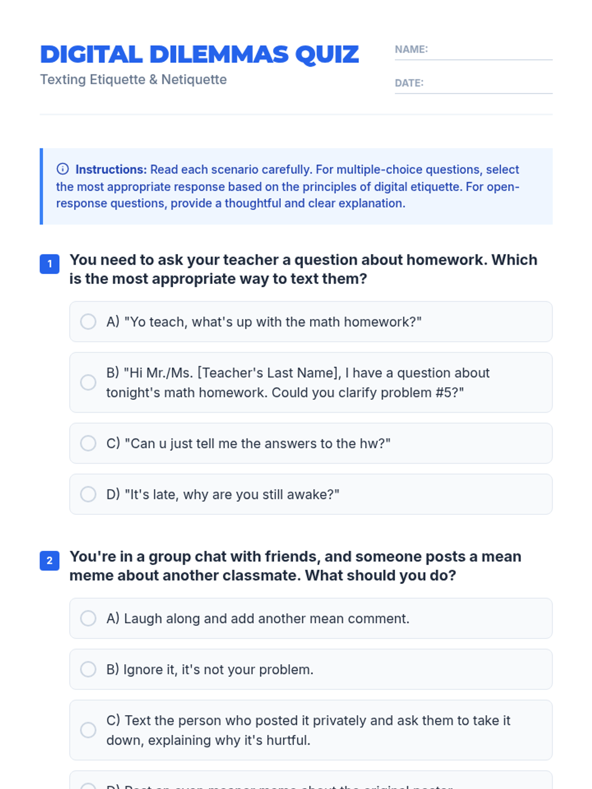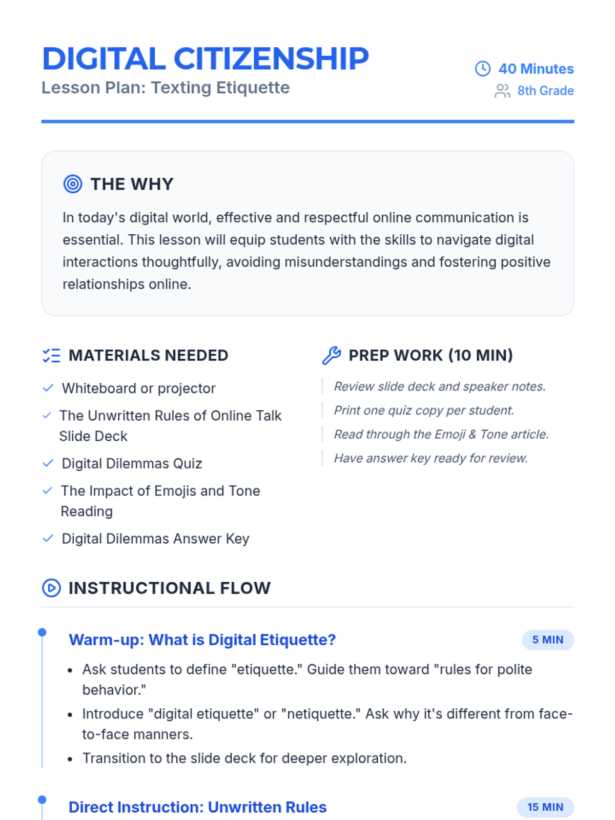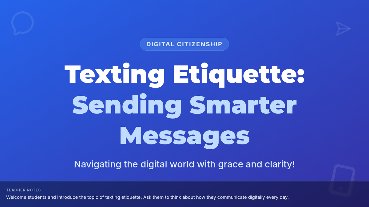 This lesson equips 8th-grade students with essential digital etiquette skills, focusing on tone, audience awareness, and the permanence of online communication to foster respectful digital citizens.