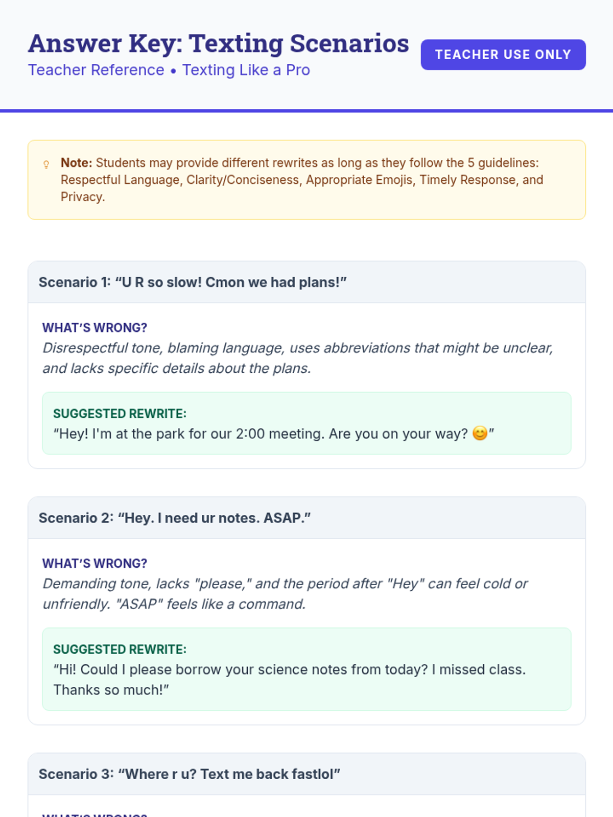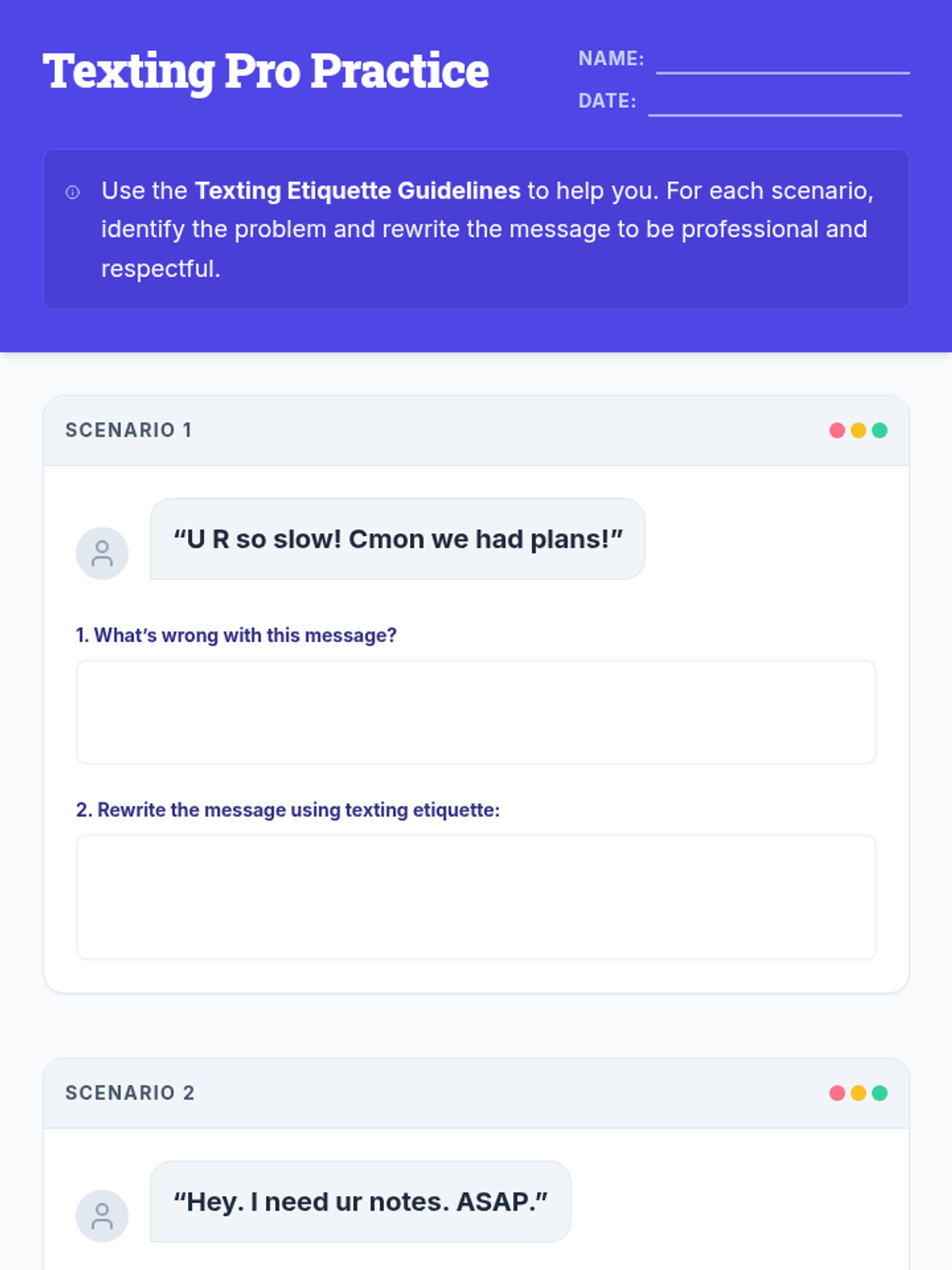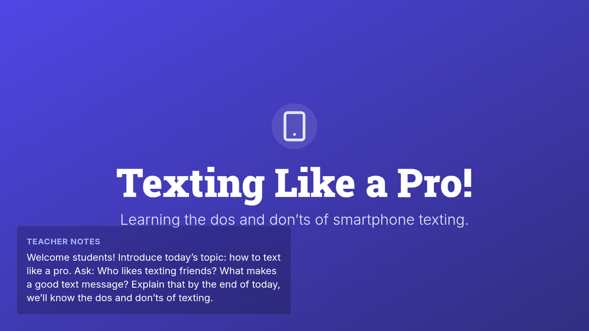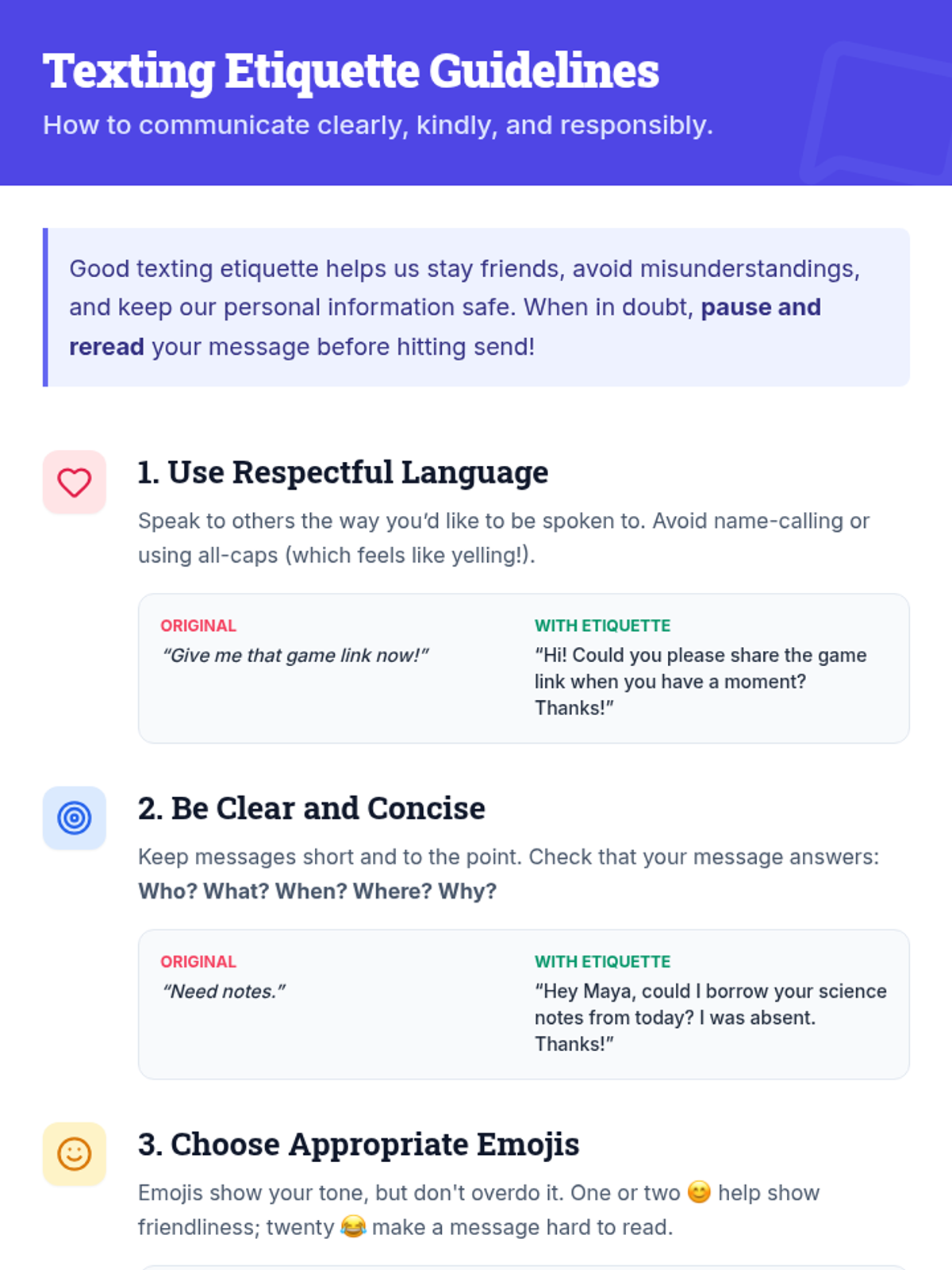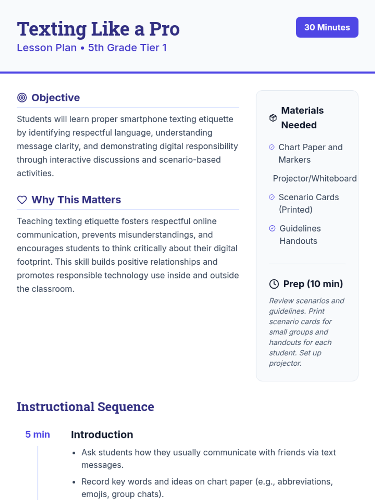 A 30-minute lesson for 5th graders on proper smartphone texting etiquette, covering respectful language, clarity, and digital responsibility.