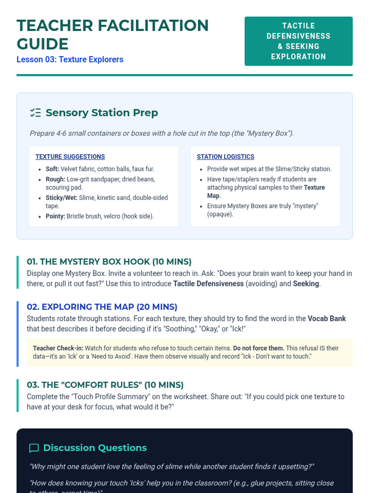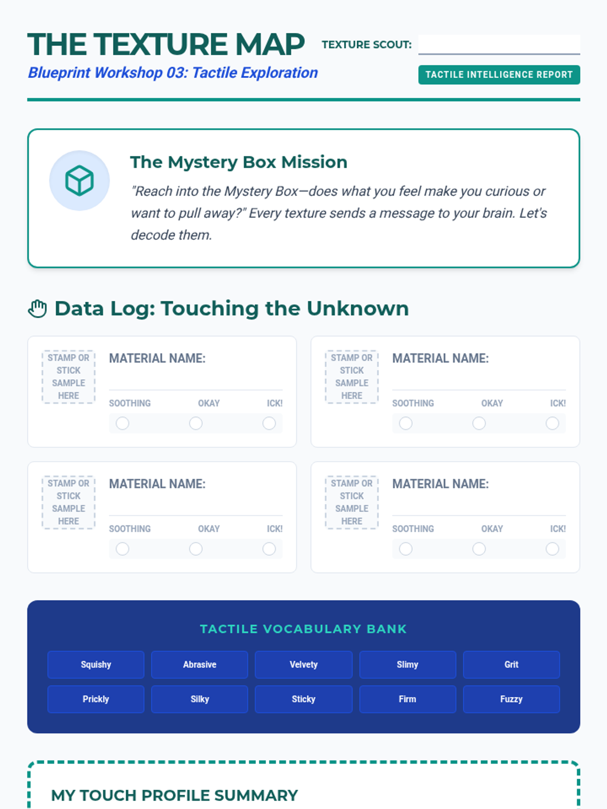 A hands-on exploration of textures and tactile sensations to help students identify soothing vs. irritating touch inputs.