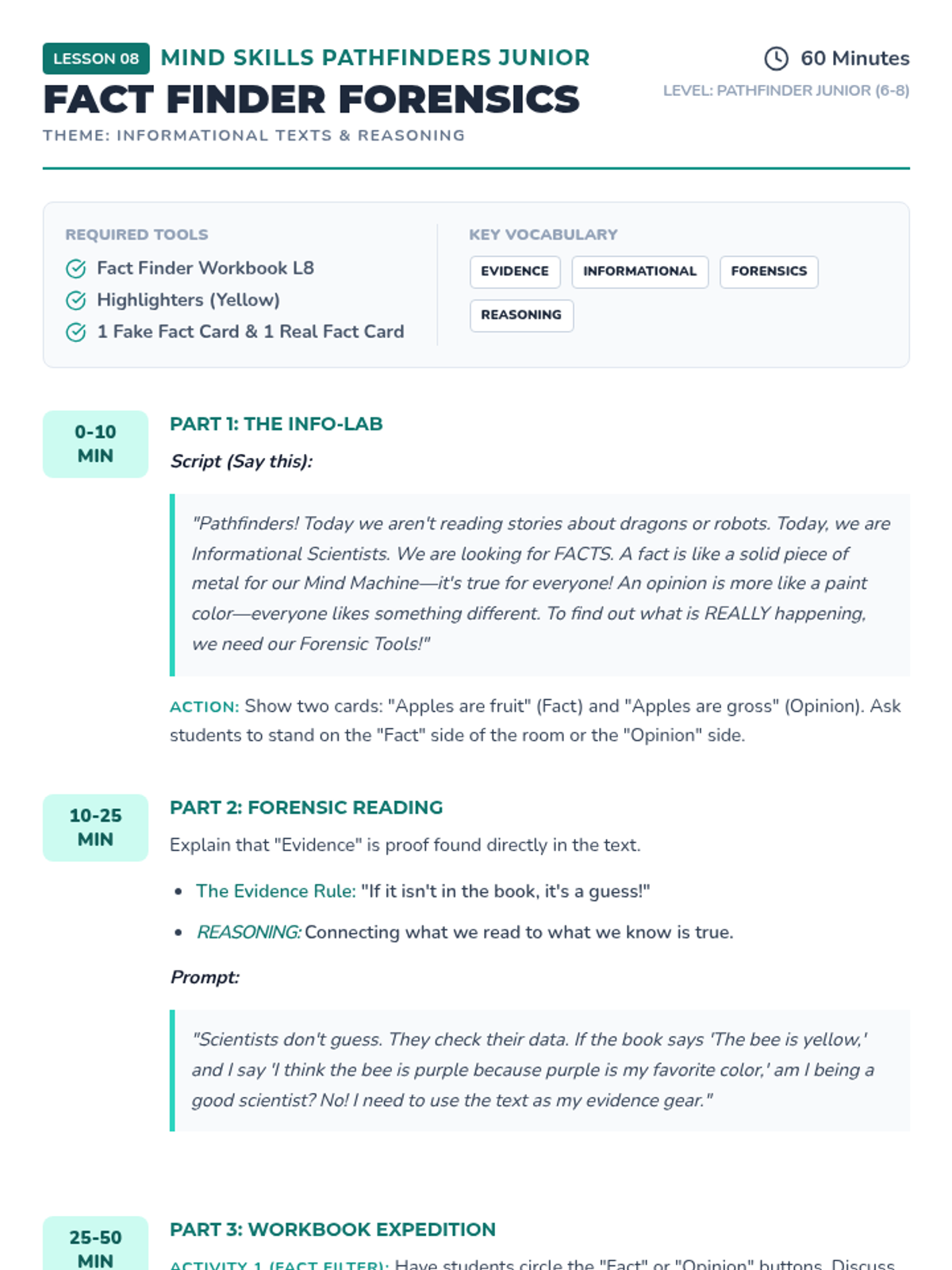 Develops information decoding skills by teaching students to search for facts and evidence within a text, much like a forensic scientist.