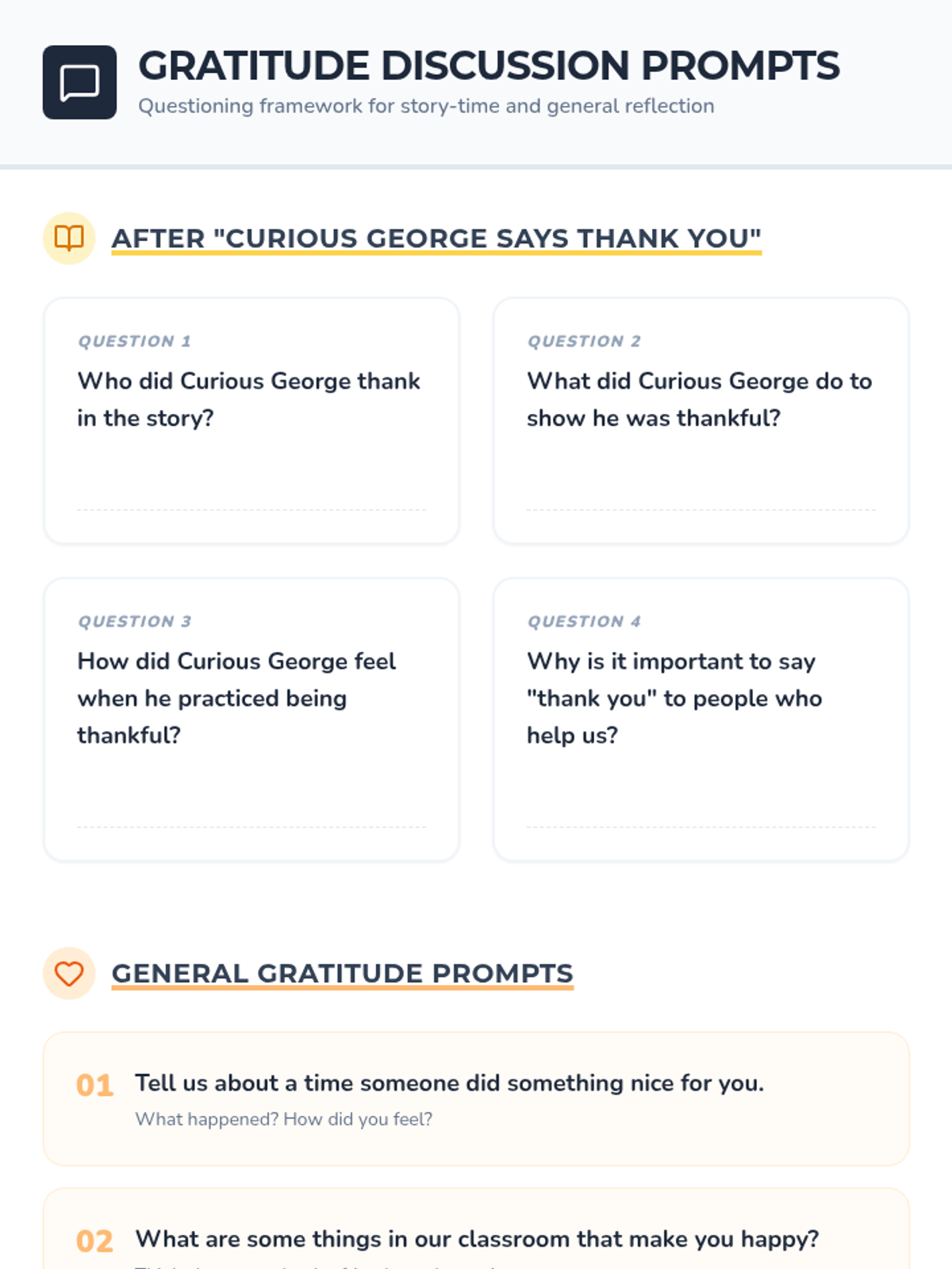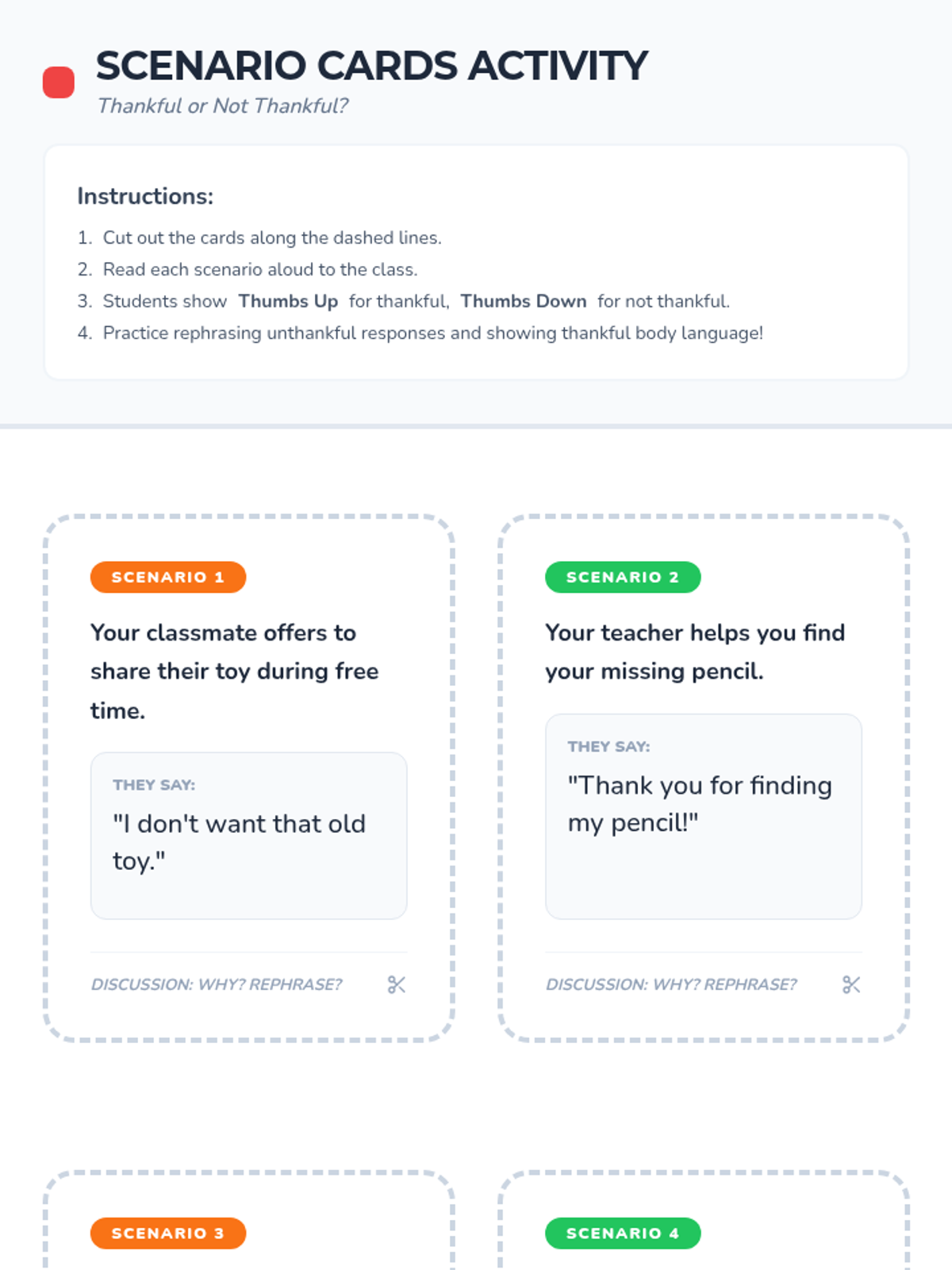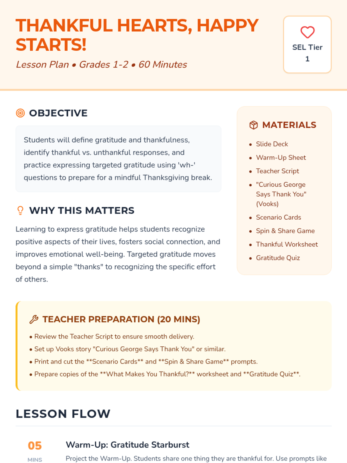 A 60-minute Tier 1 SEL lesson for 1st-2nd graders focused on defining gratitude, identifying thankful responses, and practicing targeted appreciation through stories and interactive activities.