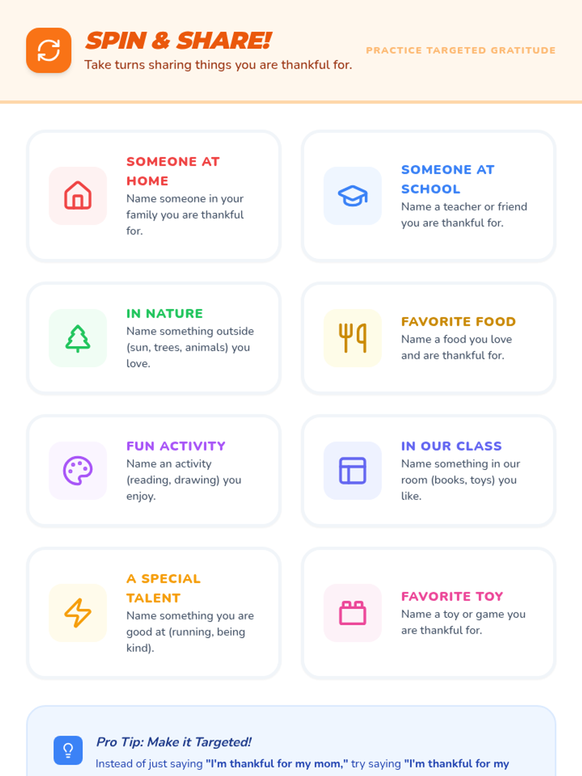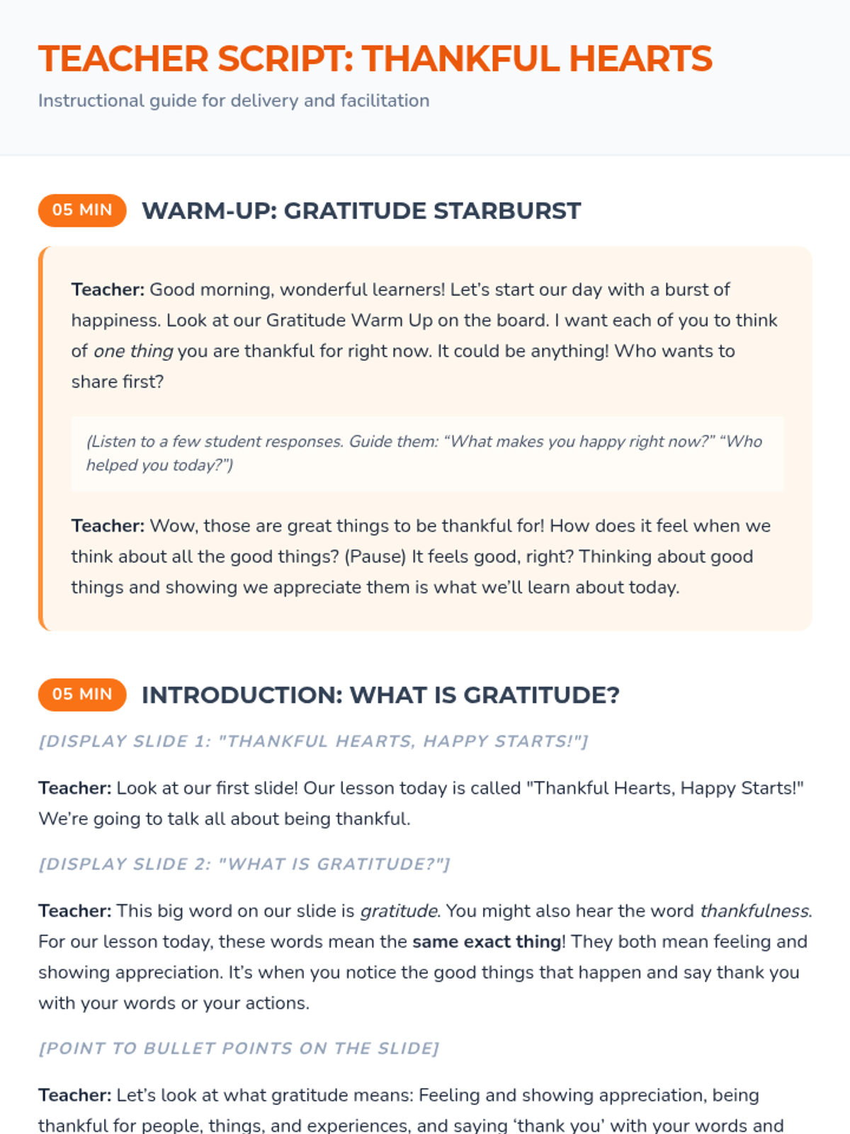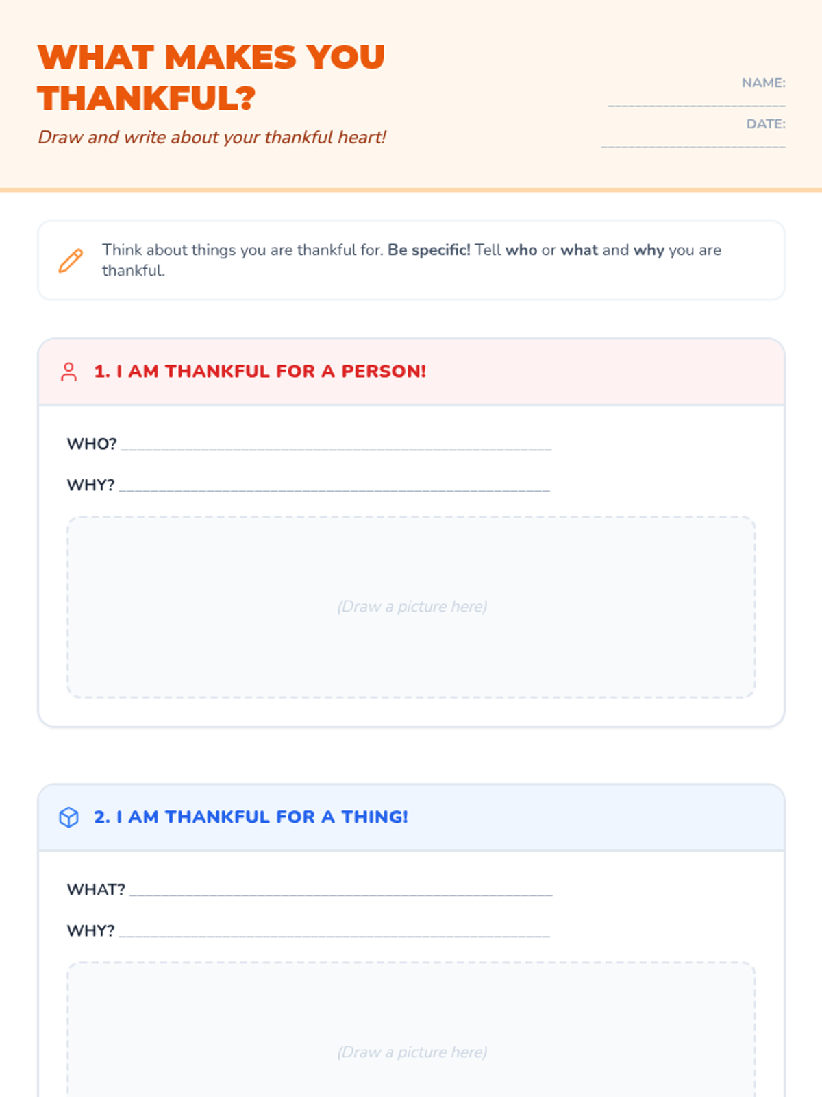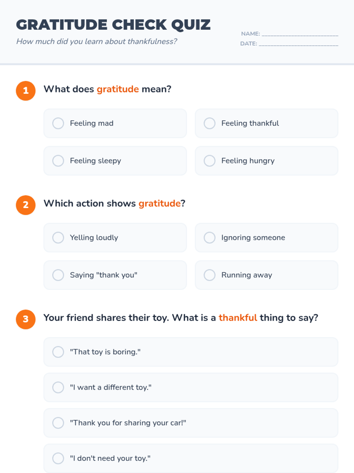 A 60-minute Tier 1 SEL lesson for 1st-2nd graders focused on defining gratitude, identifying thankful responses, and practicing targeted appreciation through stories and interactive activities.
