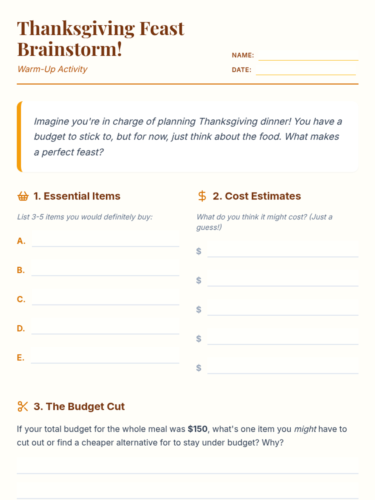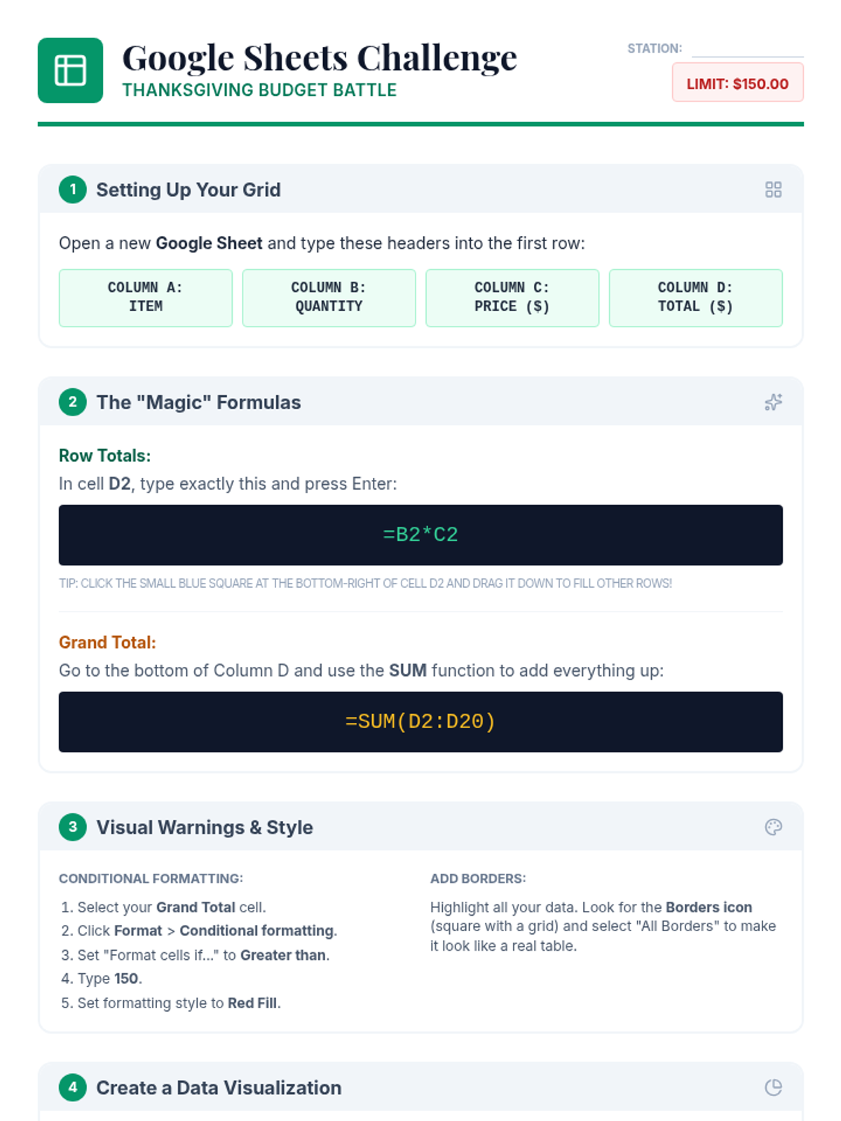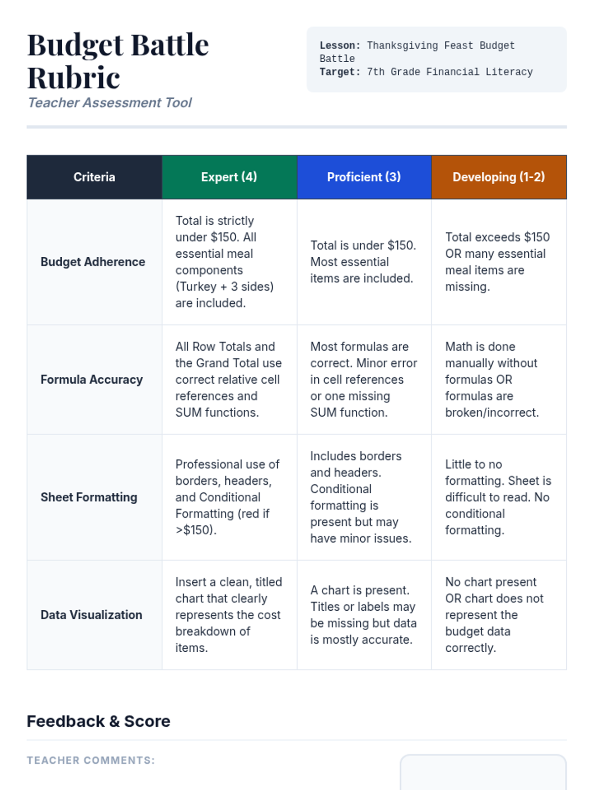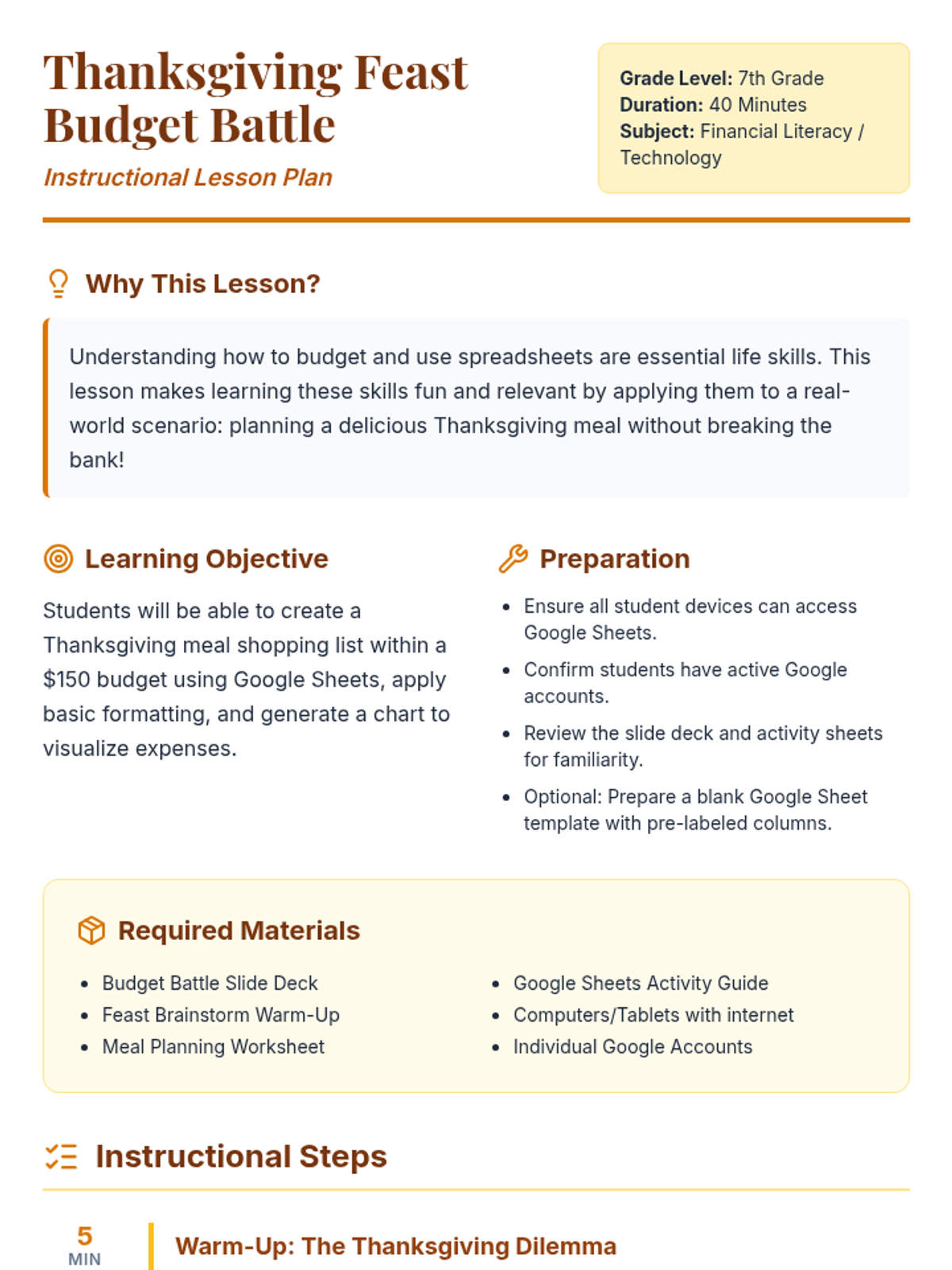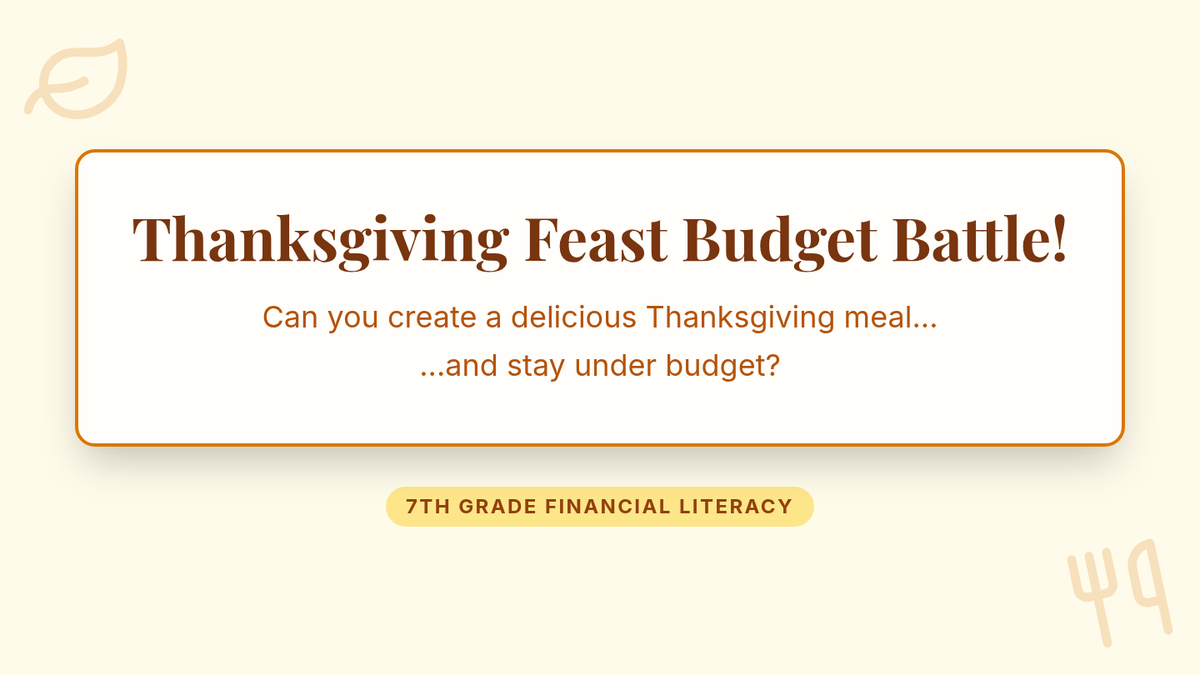 A 40-minute lesson where 7th-grade students plan a Thanksgiving meal under a $150 budget using Google Sheets to develop financial literacy and spreadsheet skills.
